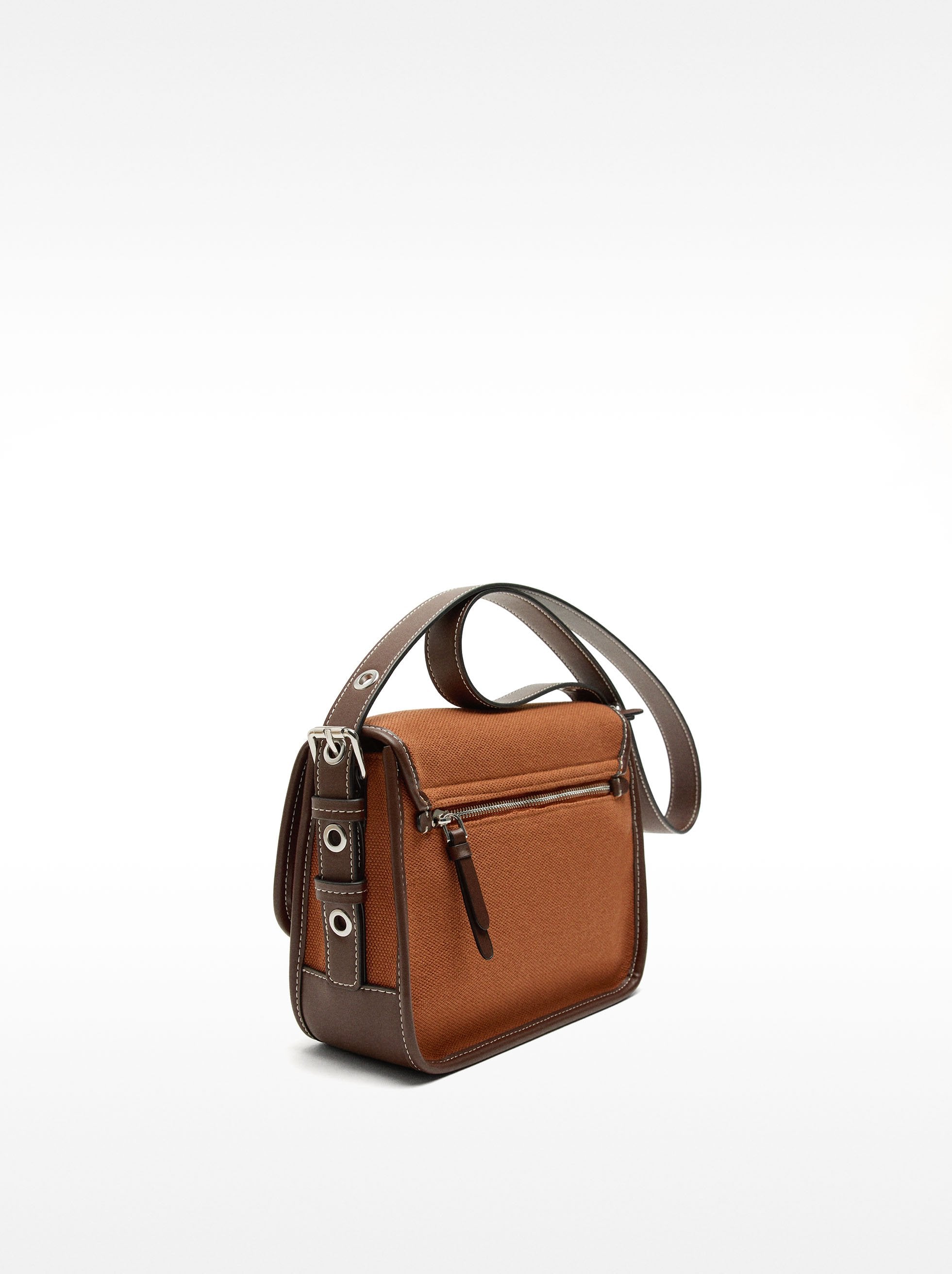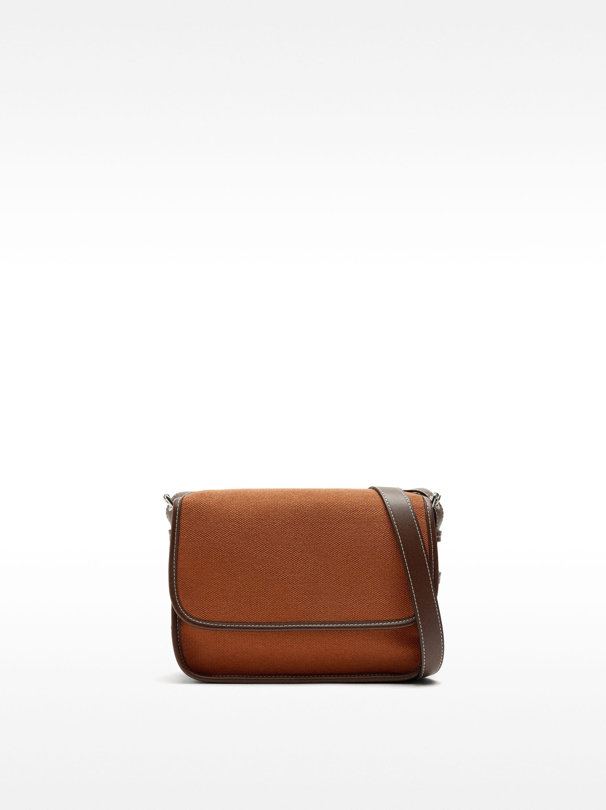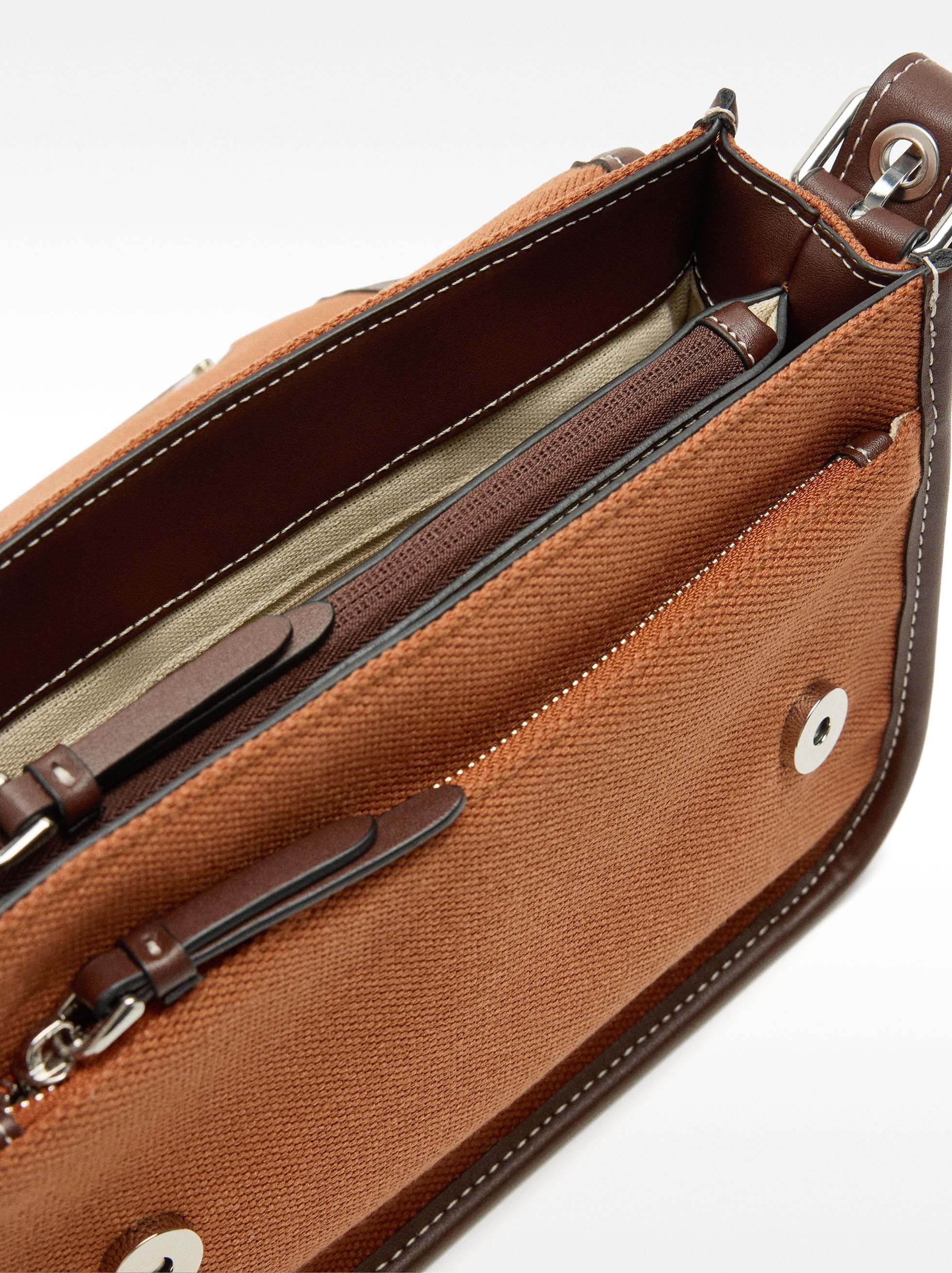 Bolso bandolera de tela. Forro y bolsillo interior. Compartimento con cremallera. Cierre de solapa magnético. Asa regulable.