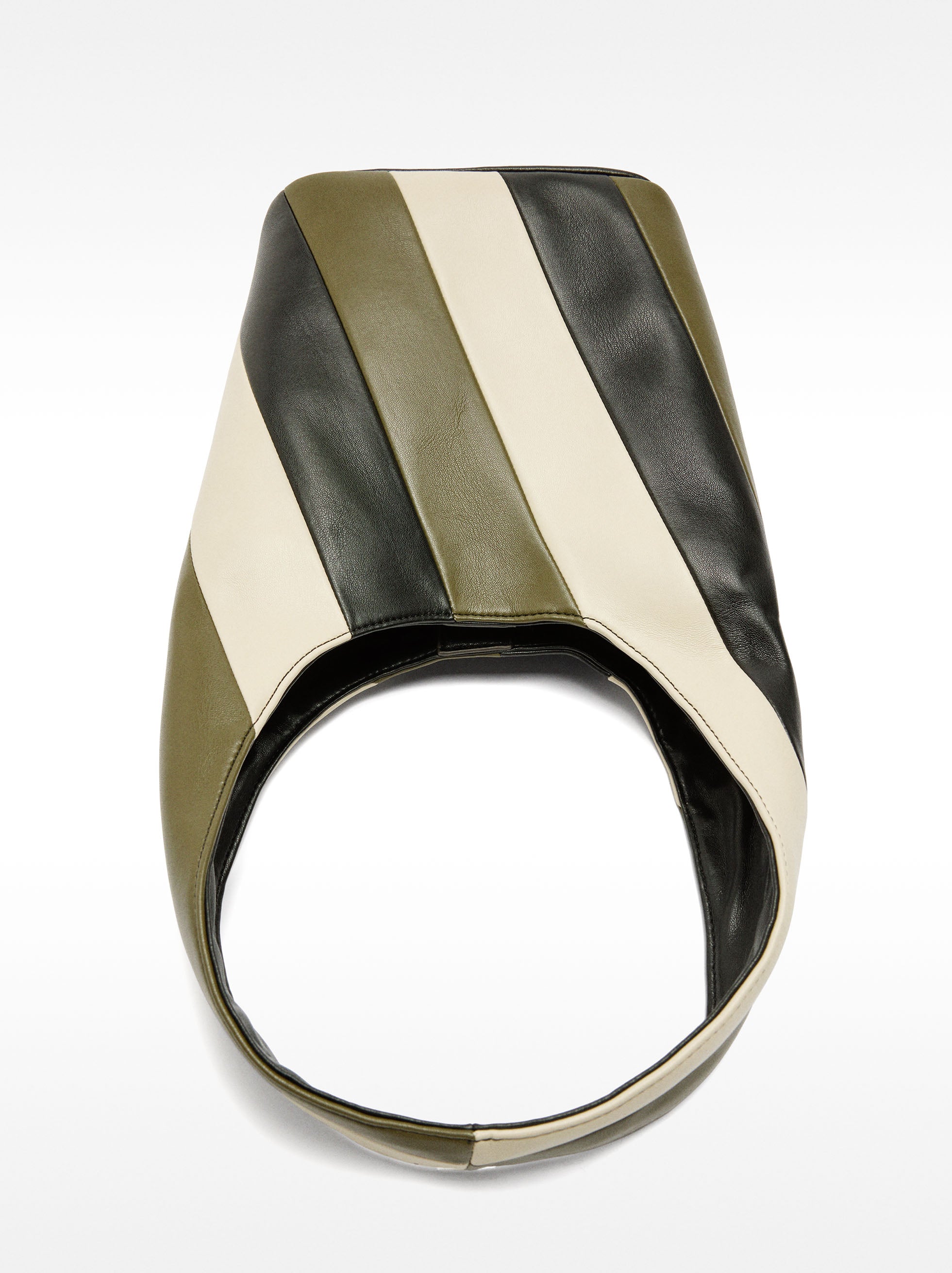 Bolso de hombro hobo de rayas en colores contrastantes. Tamaño mediano. Forro y bolsillo interior. Cierre de imán. Asa fija.