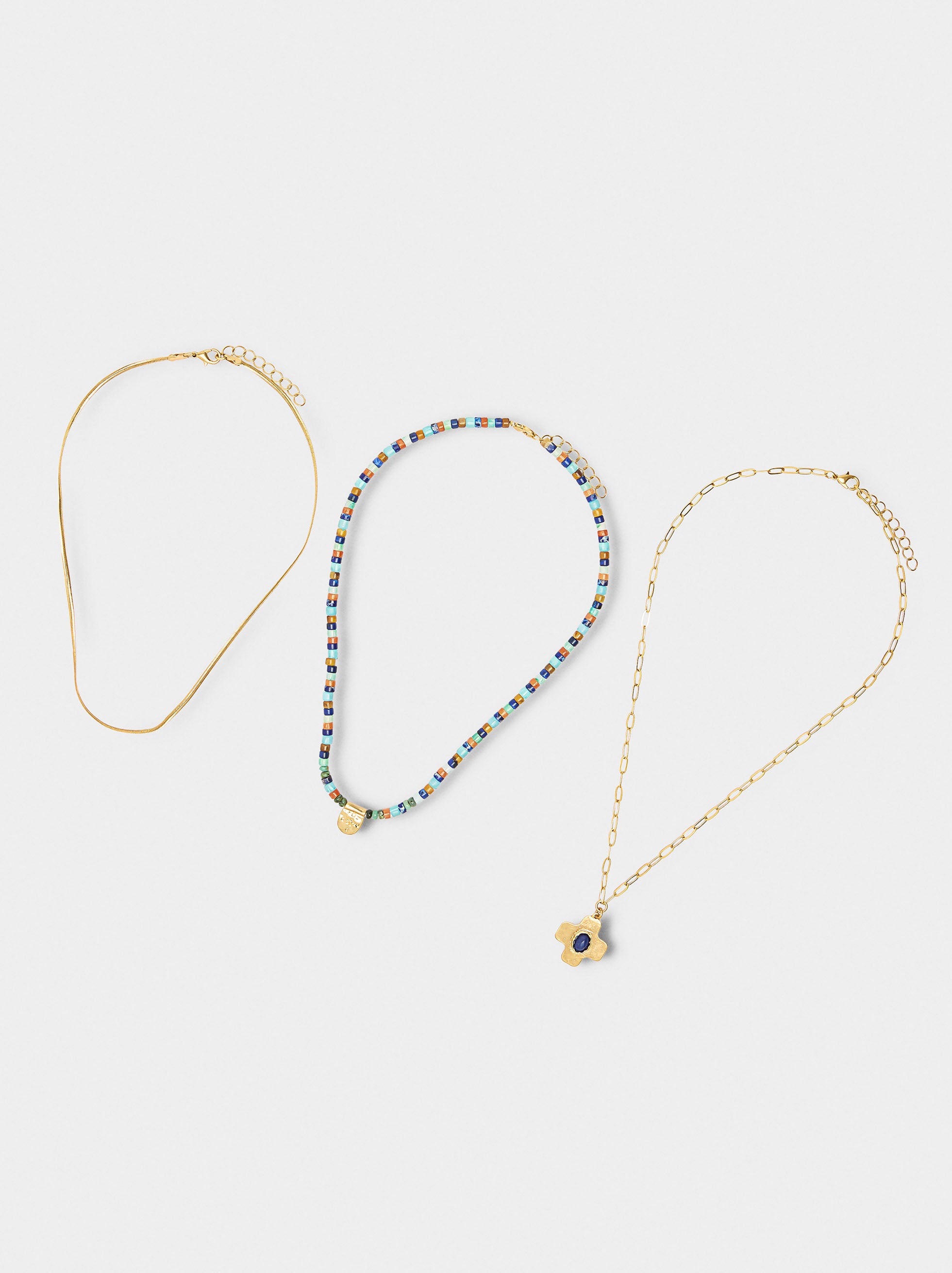 Set de tres collares cortos con eslabones, cadena de cobra y cuentas cilíndricas de piedras y resina. Colgantes ovalados y en forma de cruz con piedra. Cierre de mosquetón. Efecto envejecido. Acabado dorado.