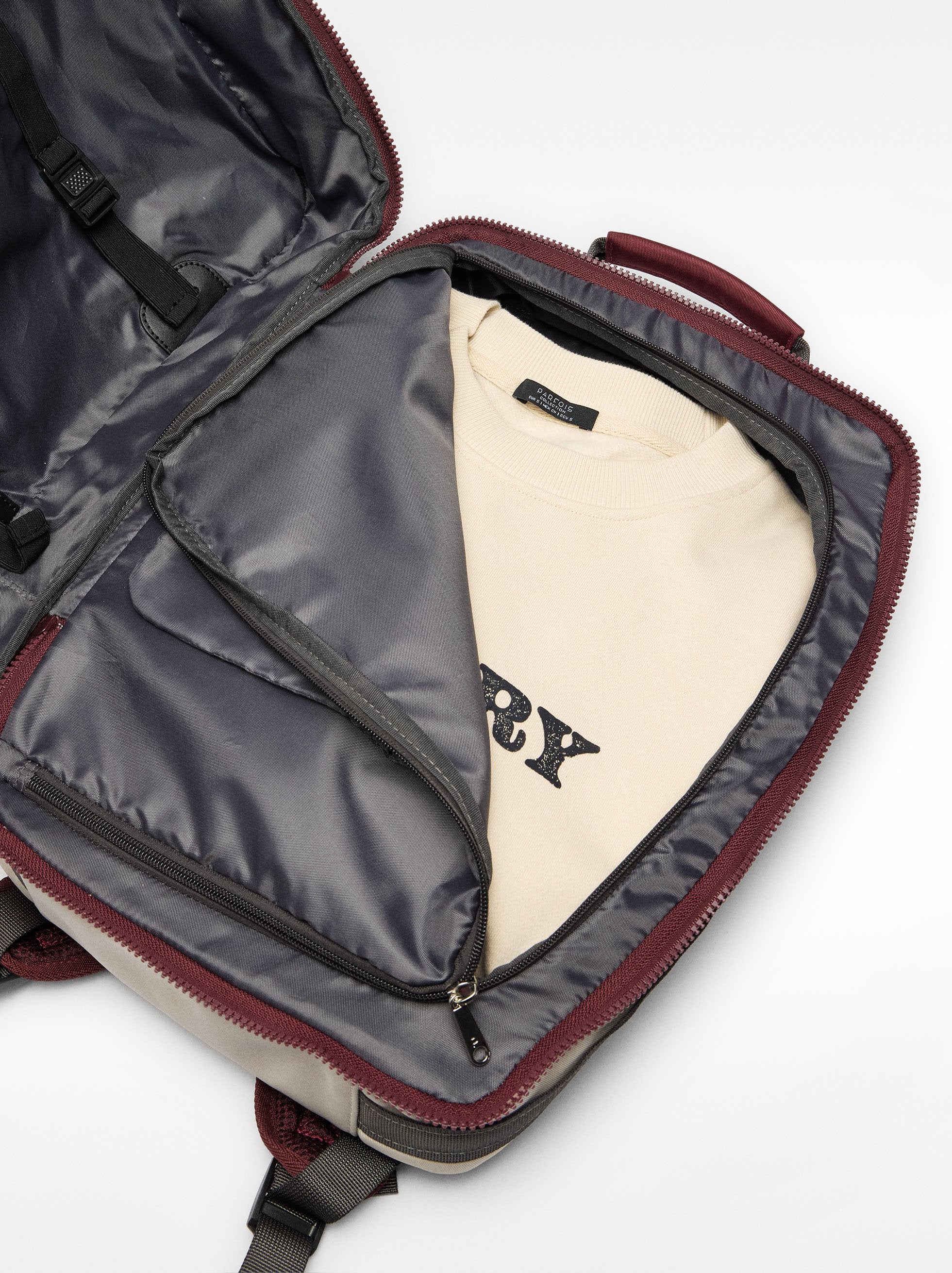 Mochila de cabina de nylon con asa superior y correas ajustables, reforzadas y acolchadas para hacer más cómodo el transporte de la mochila. Bolsillos externos en la parte delantera y uno trasero con cierre de cremallera. Compartimento para portátil. Bols