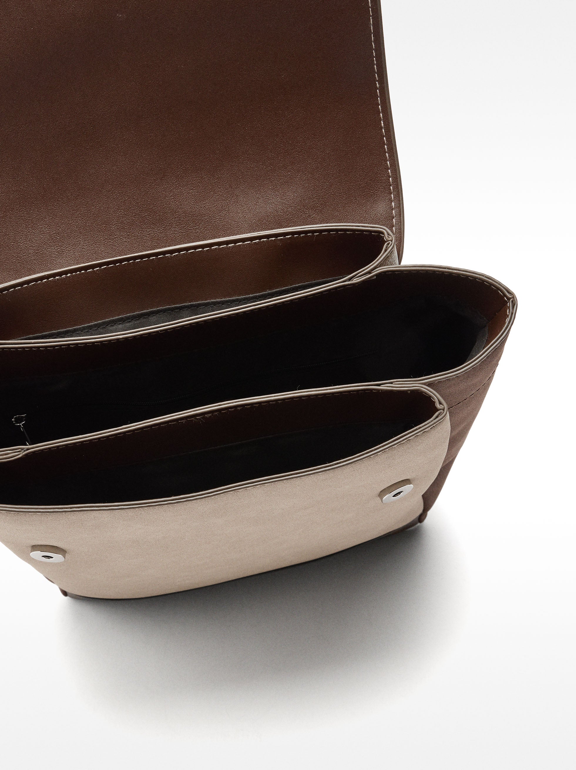 Mochila con efecto piel texturizada. Cierre con solapa imantada. Tres compartimentos interiores. Forro y bolsillo interior. Bolsillo exterior trasero. Tirantes fijos ajustables.