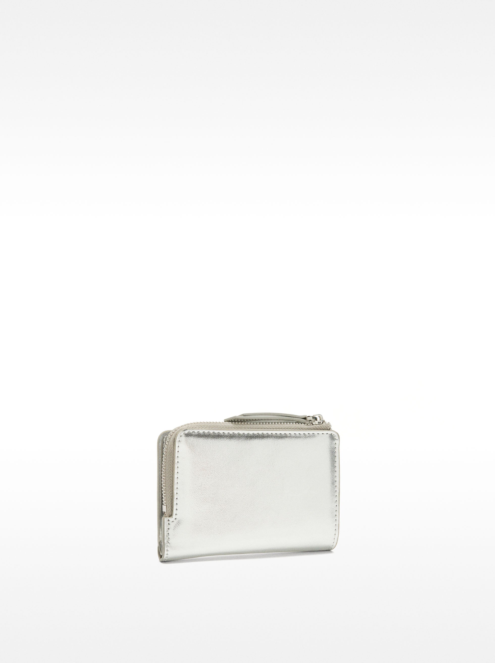 Cartera básica metalizada. Tamaño pequeño. Compartimento con ranuras para tarjetas y billetes; cierre de botón de presión. Compartimento para monedas con cierre de cremallera.