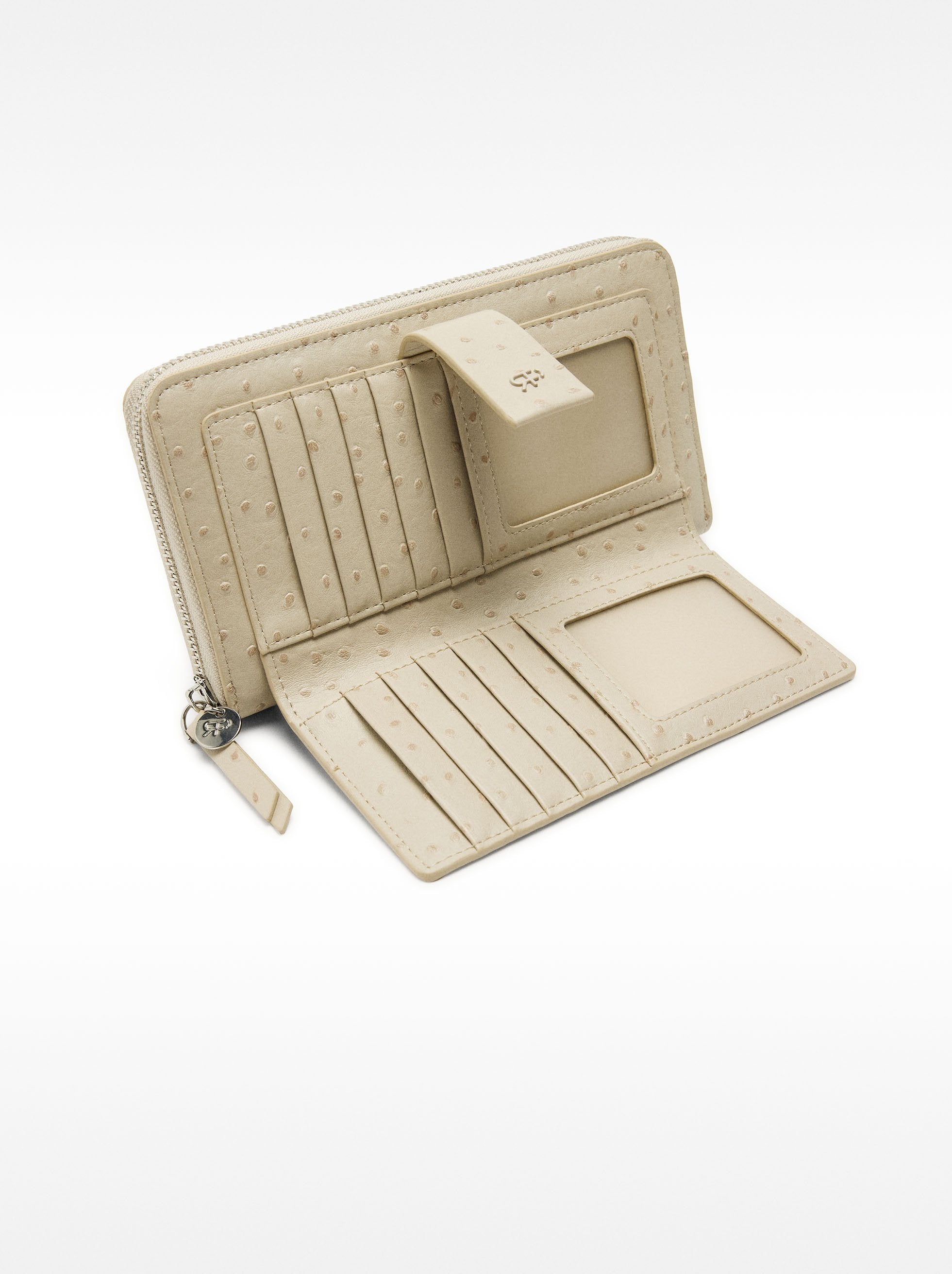 Cartera grande con grabado animal. Compartimento con ranuras para tarjetas y billetes; cierre con tira imantada. Compartimento para monedas con cierre de cremallera.