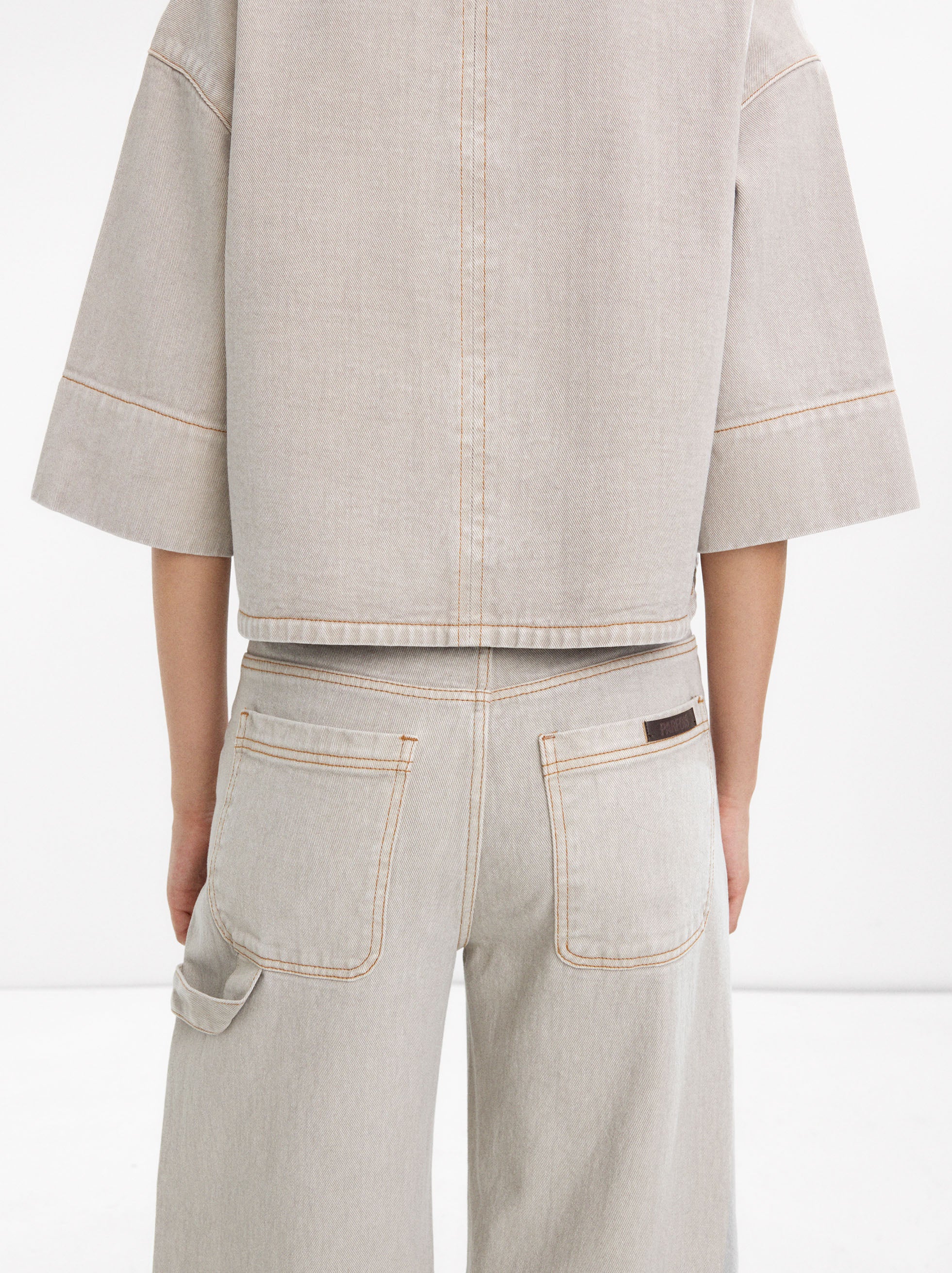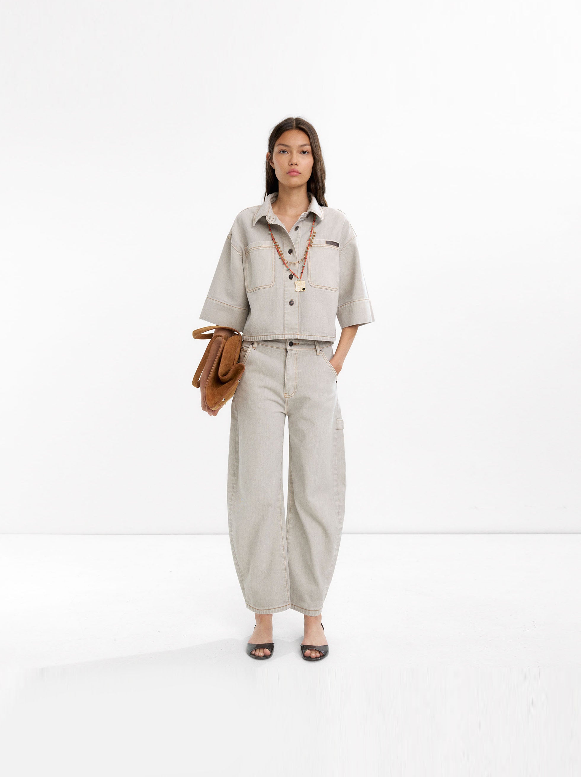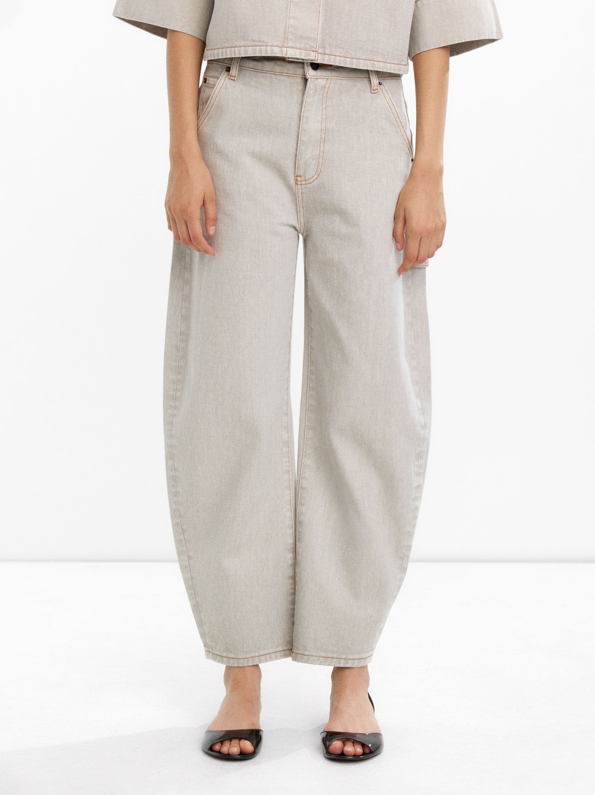 Pantalón vaquero abaloado. Confeccionado en 100% algodón. Tres bolsillos en la parte delantera. Dos bolsillos en la parte posterior. Abertura con botón y cierre de cremallera. La modelo mide 1,80 m y lleva la talla 34.