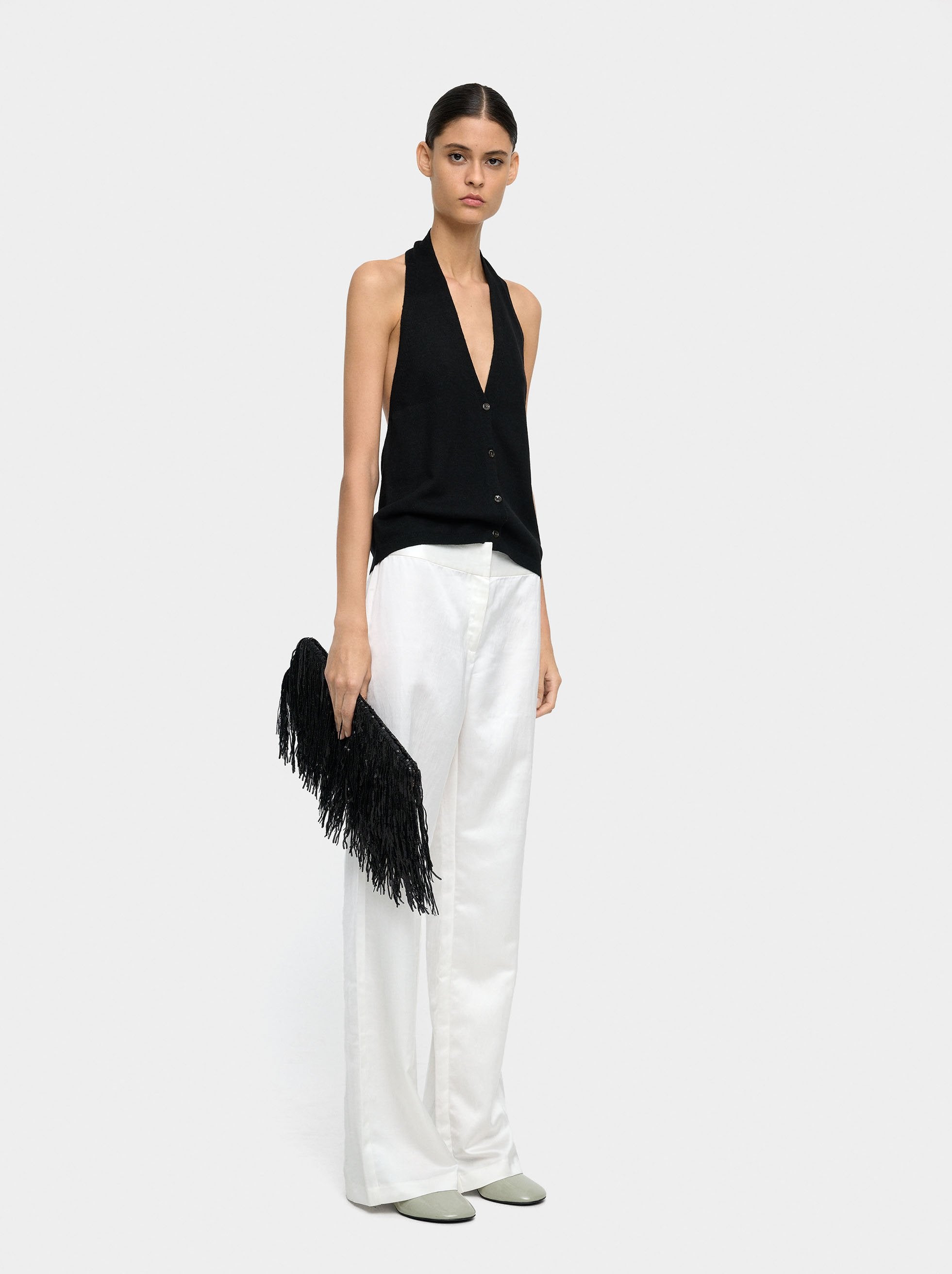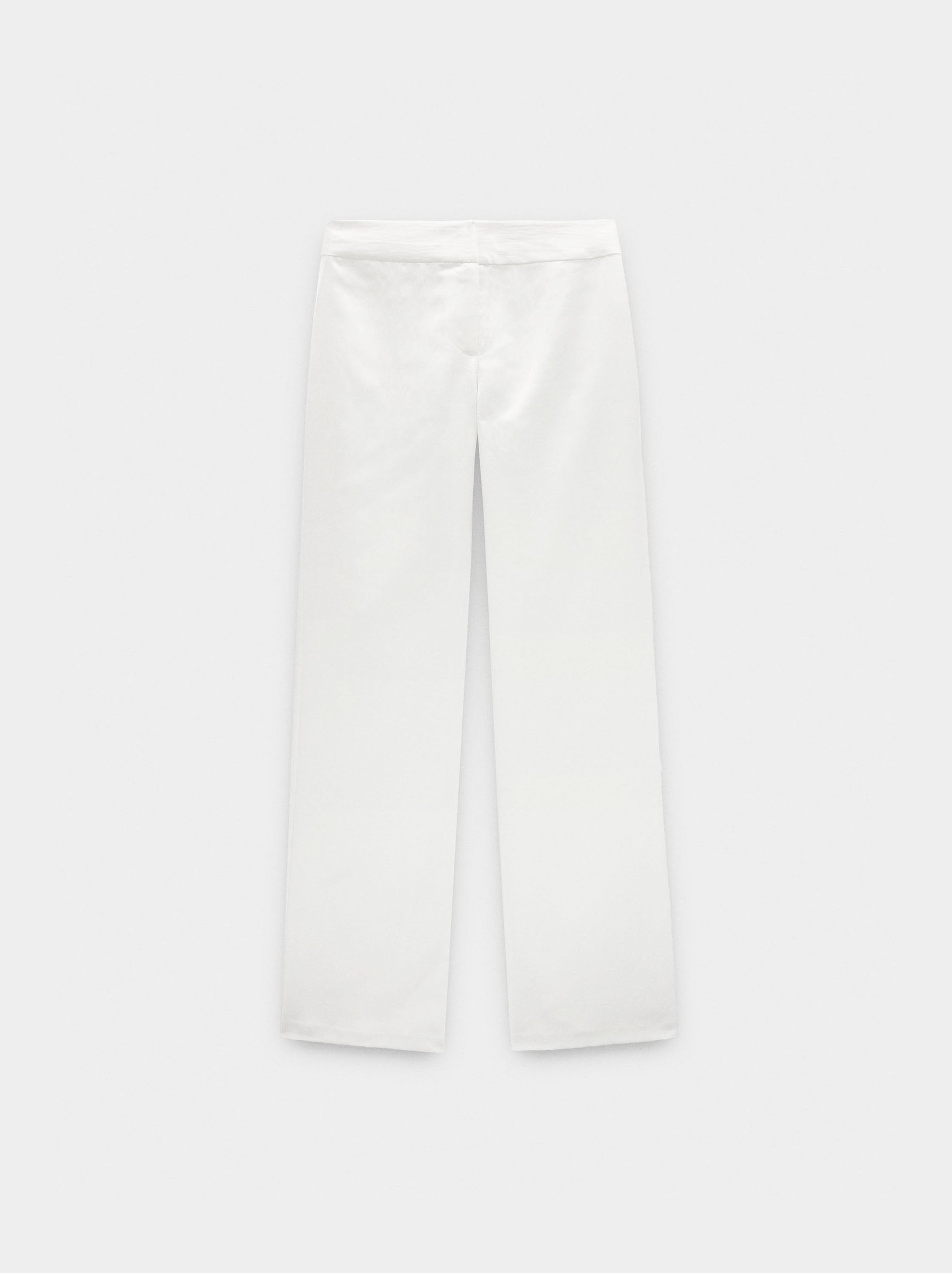 Pantalón fluido de corte recto. Cintura media. Abertura con botón y cierre de cremallera ocultos. Pinzas en la parte posterior. La modelo mide 1,79 m y lleva la talla S.