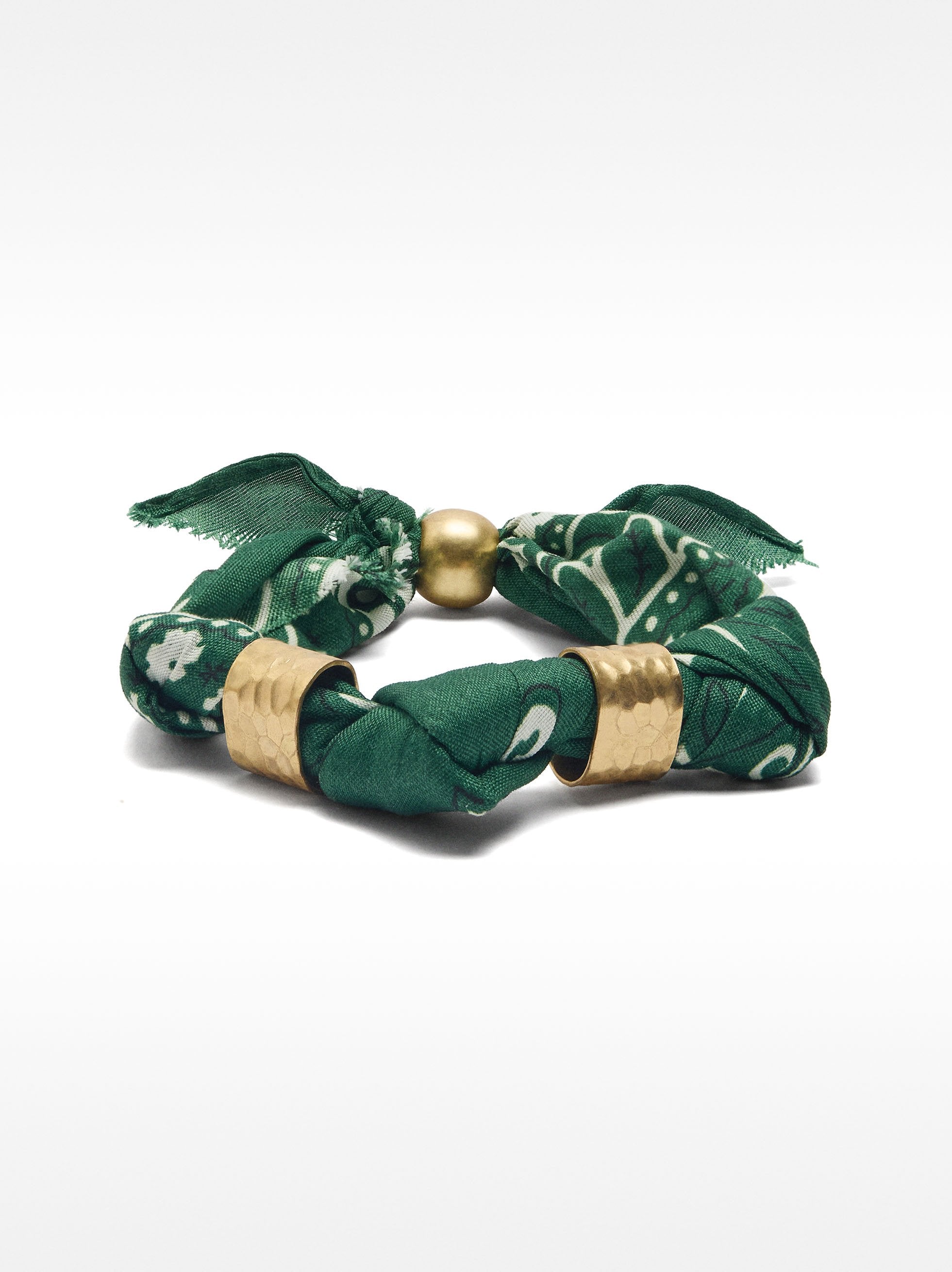Pulsera de tejido estampado con detalles metálicos. Cierre ajustable con esfera. Acabado dorado.