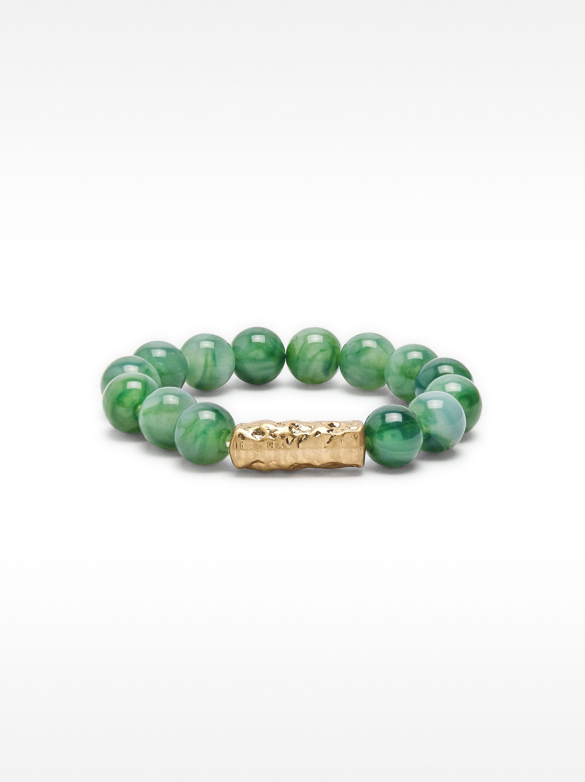 Pulsera elástica con cuentas con efecto piedra. Detalle de barra con efecto martillado. Acabado dorado.