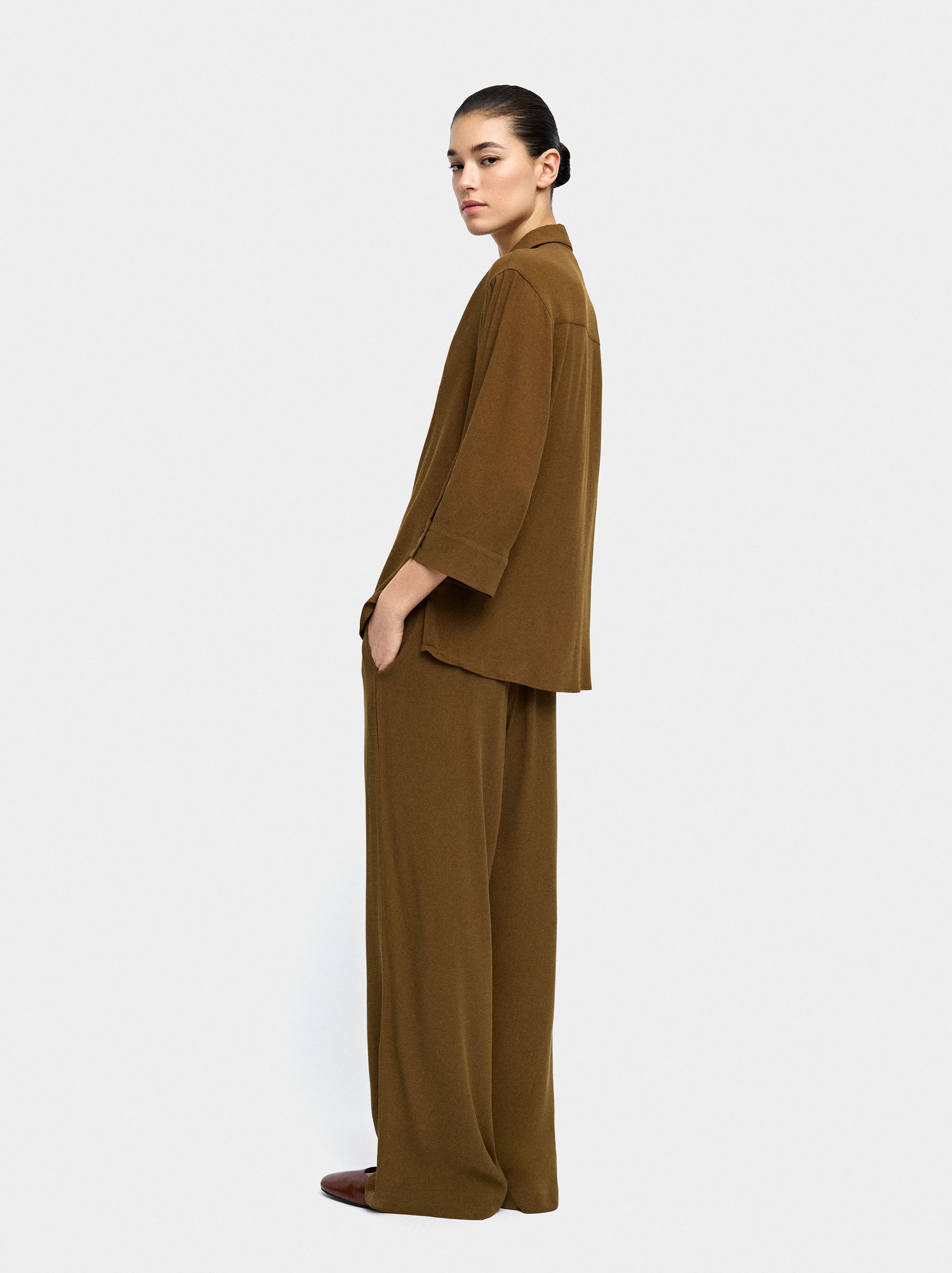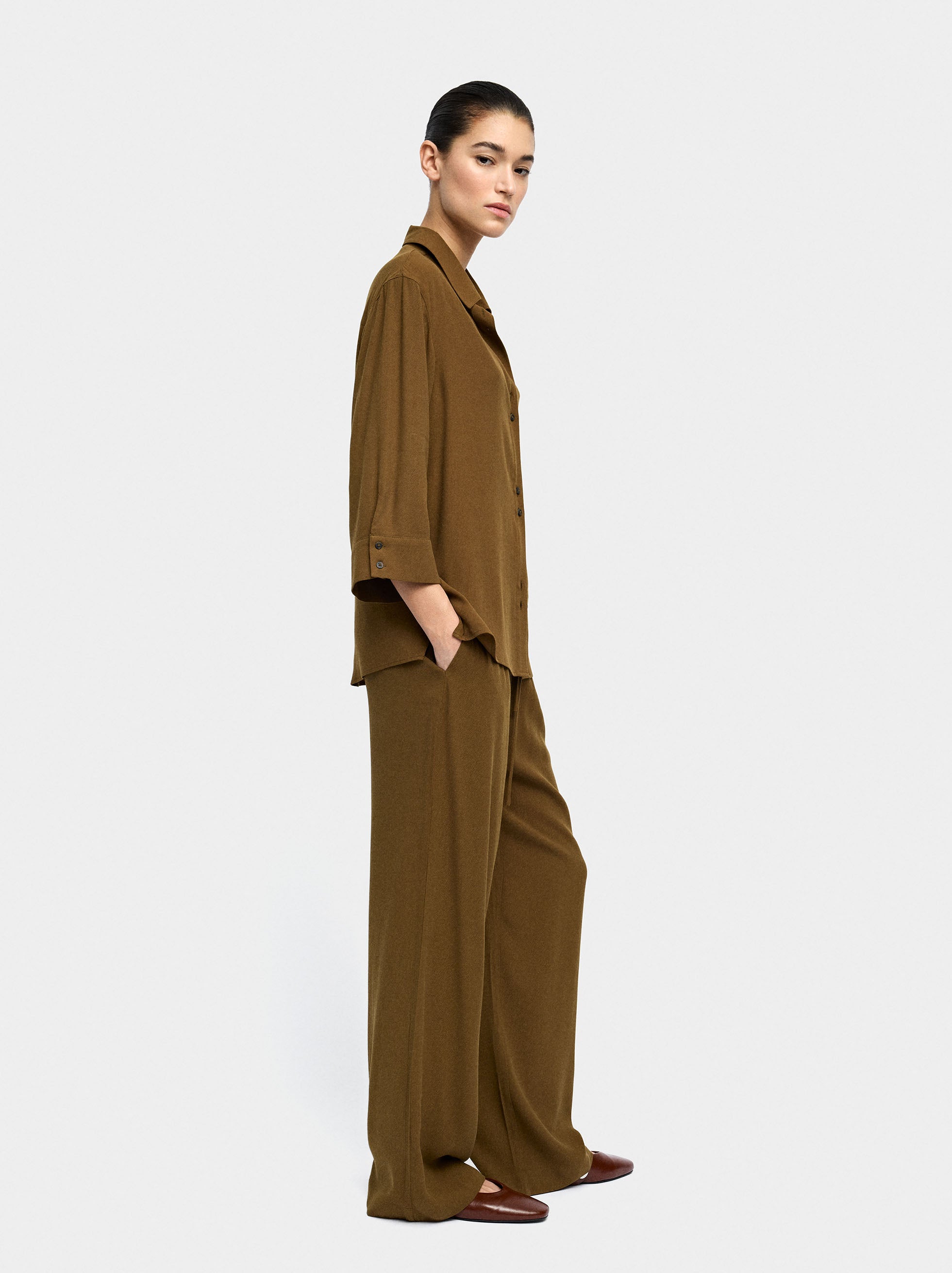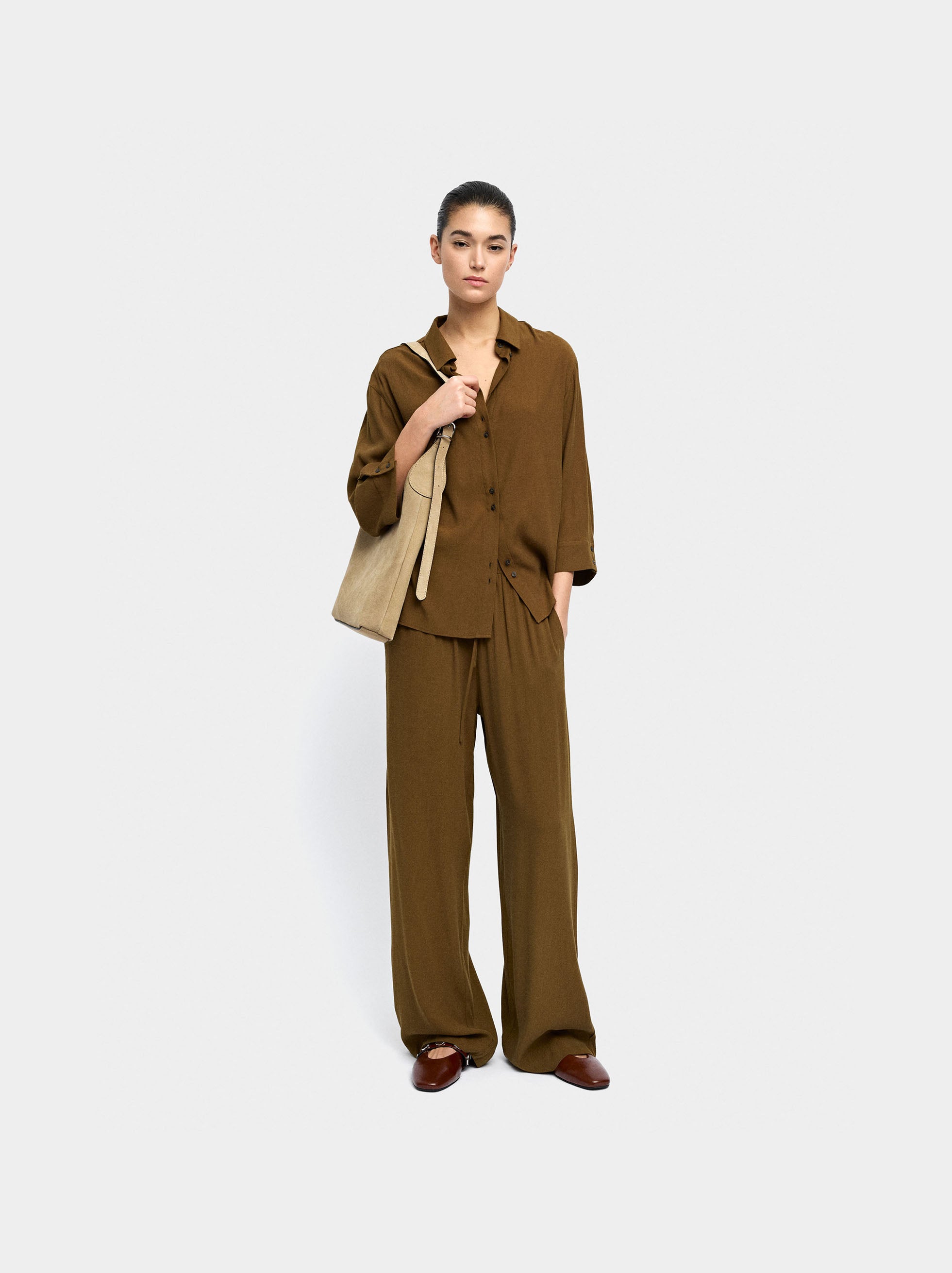 Camisa fluida de lyocell. Cuello de solapa. De manga larga. Cierre con botones dobles. La modelo mide 1,75 m y lleva la talla S.