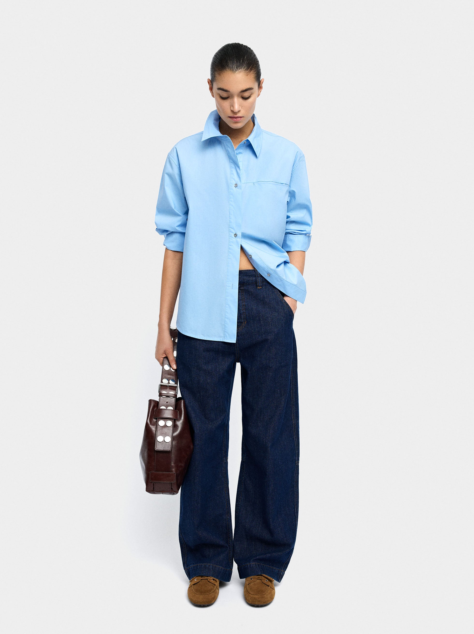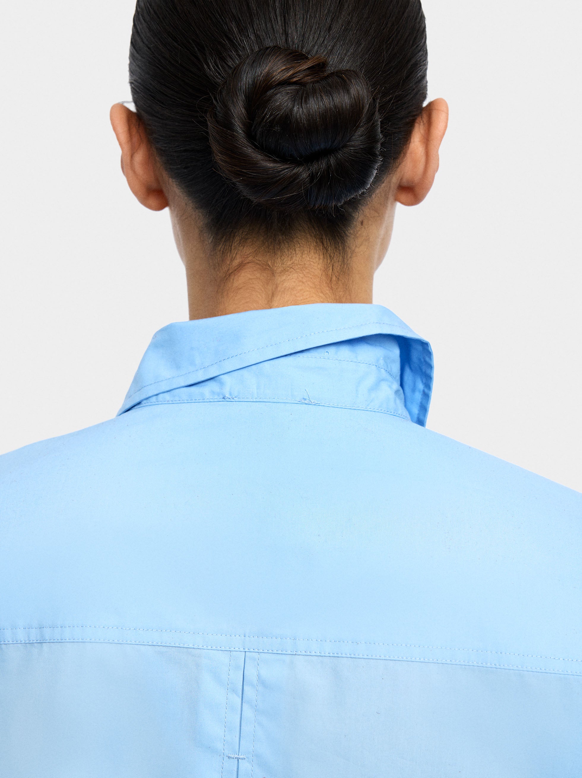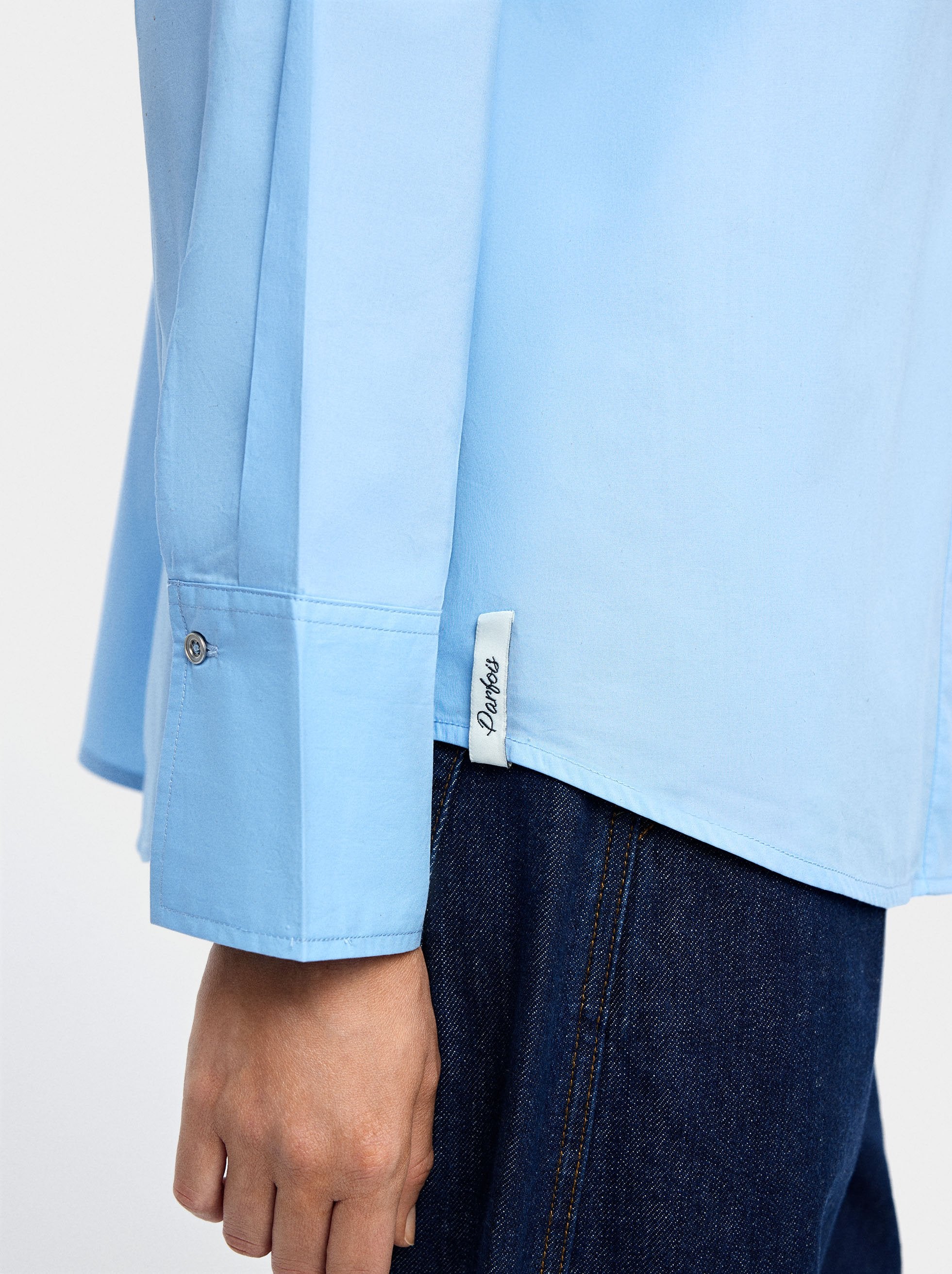 Camisa de manga larga. Confeccionada en 100% algodón. Cuello de solapa. Cierre de botones. Bolsillo lateral. La modelo mide 1,75 m y lleva la talla S.