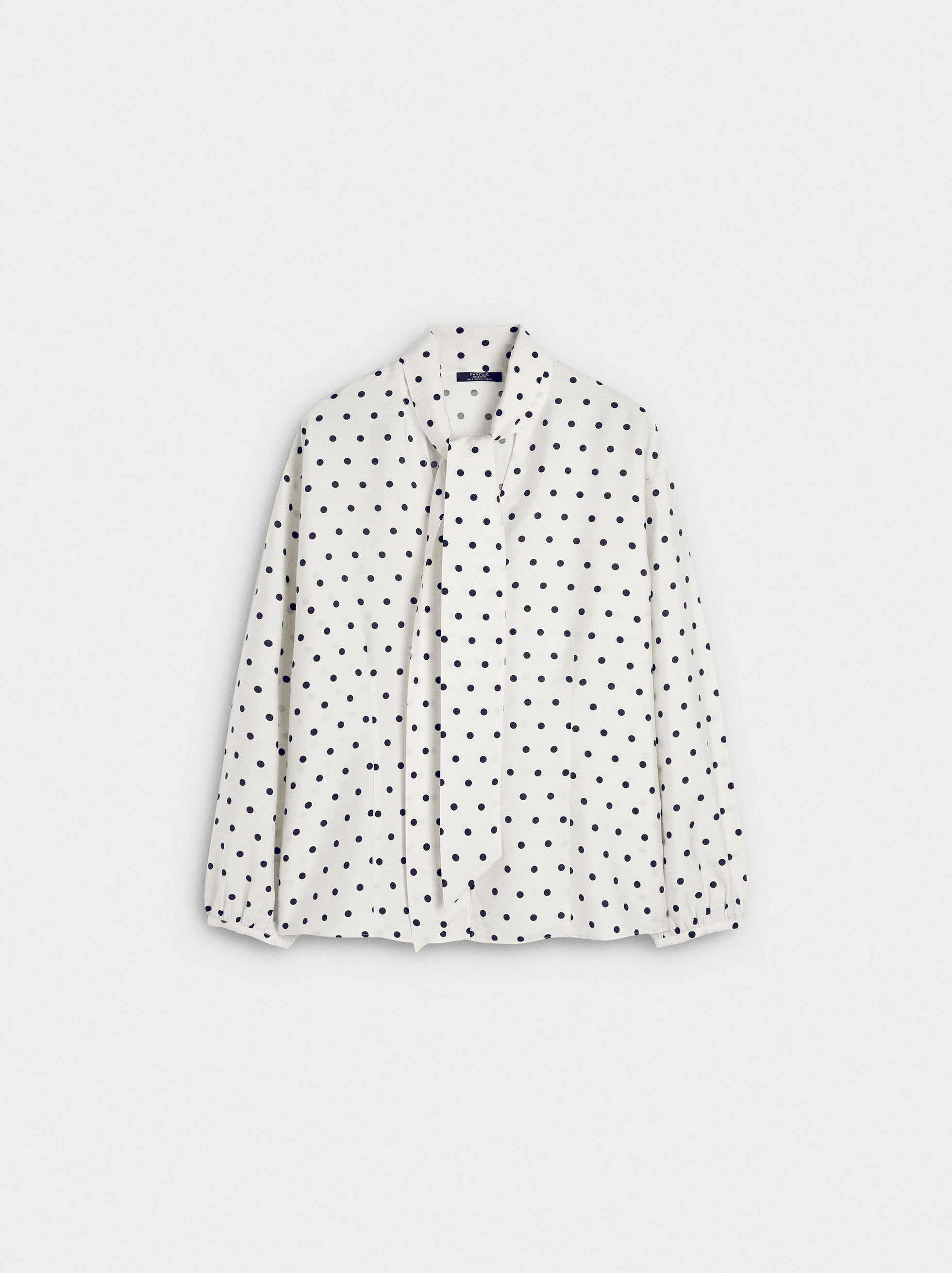 Camisa con estampado de lunares. Escote en V con pañuelo. Cierre con botones. Manga larga. La modelo mide 1,78 m y lleva la talla S.