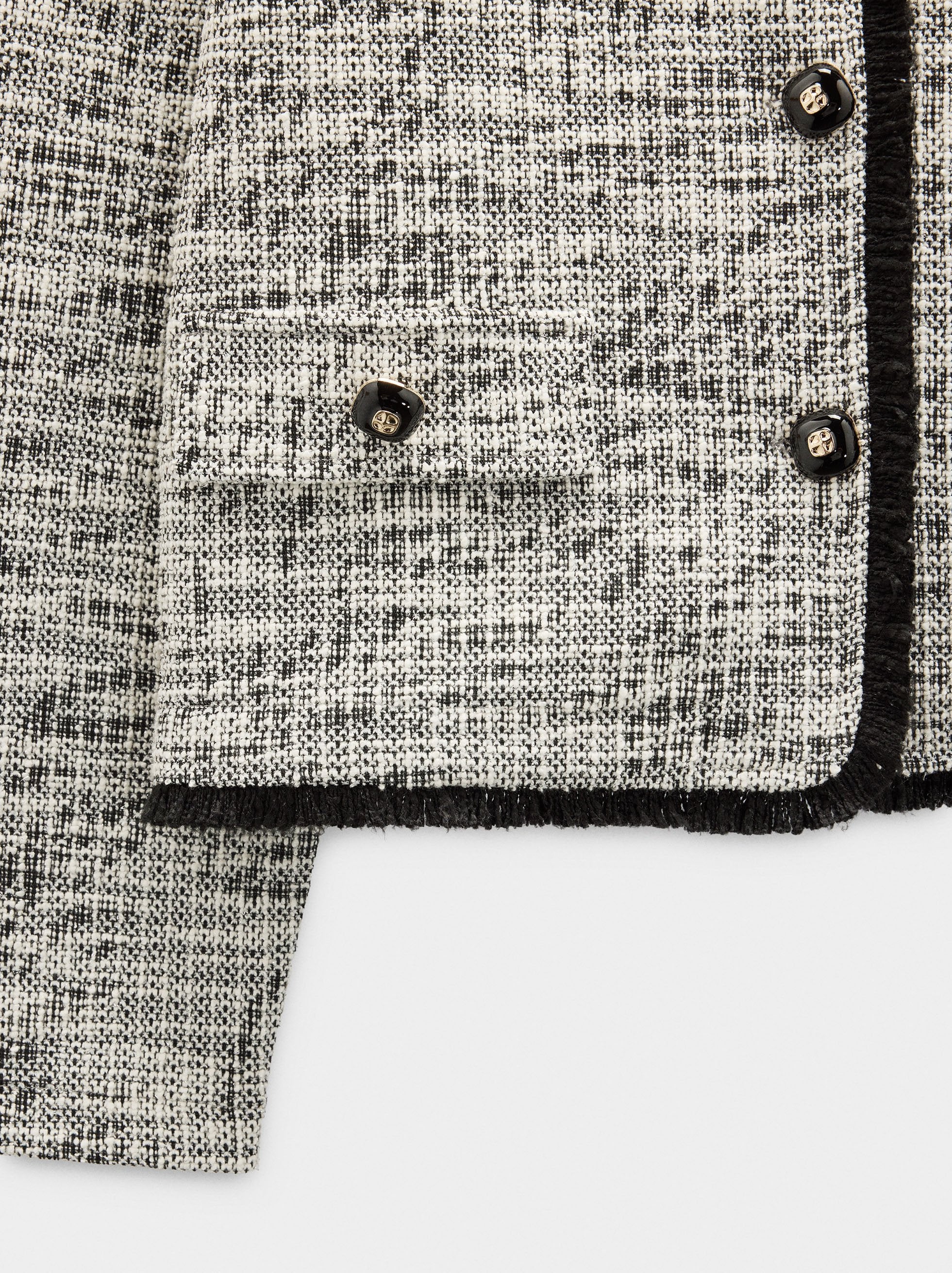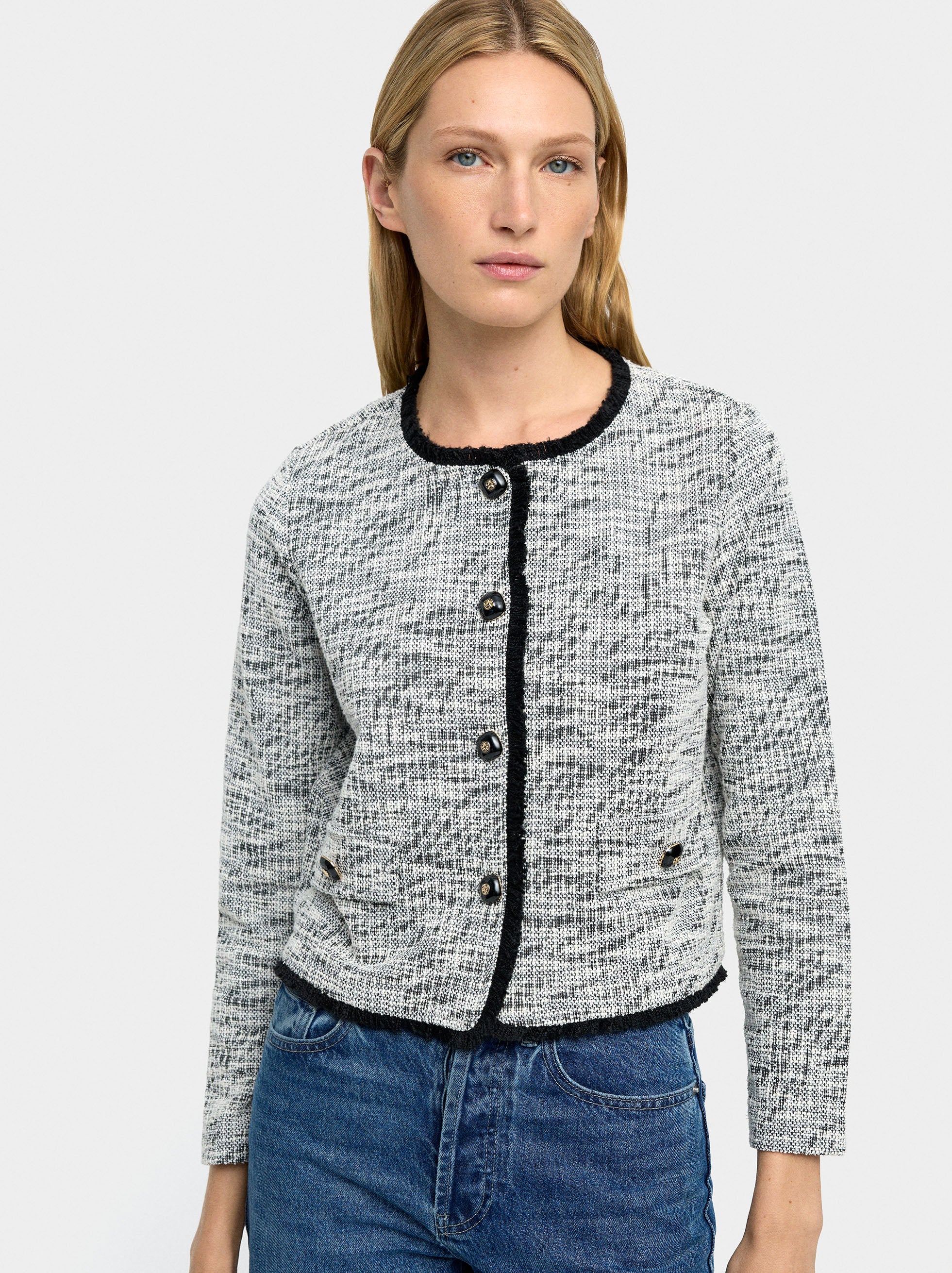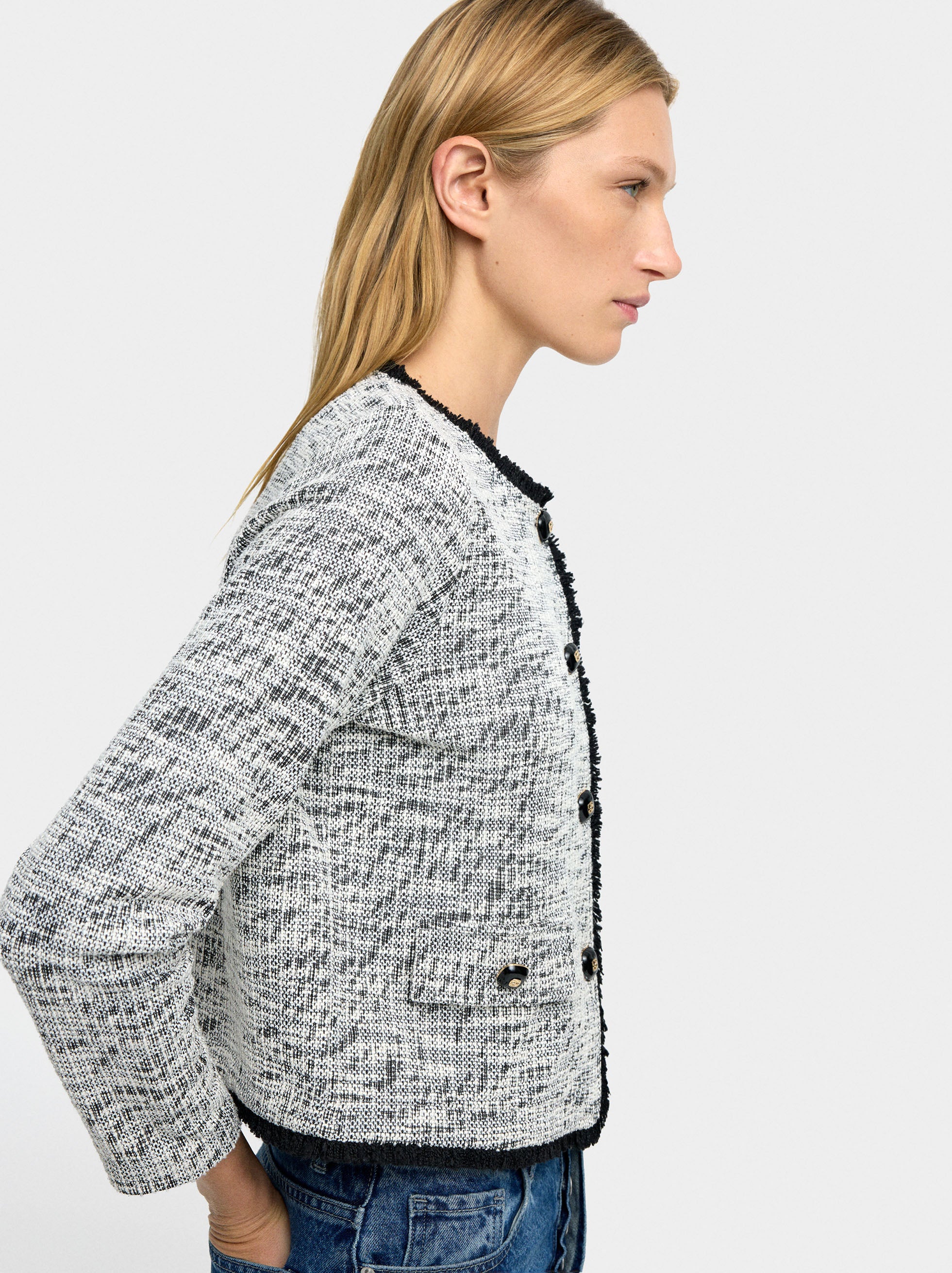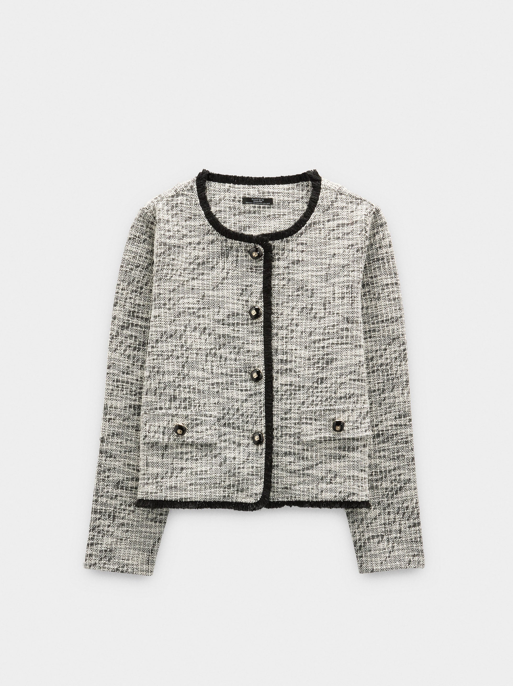 Cárdigan de punto con textura. Cuello redondo. Manga larga. Detalle de flecos en los bordes. Solapas laterales. Cierre de botones.