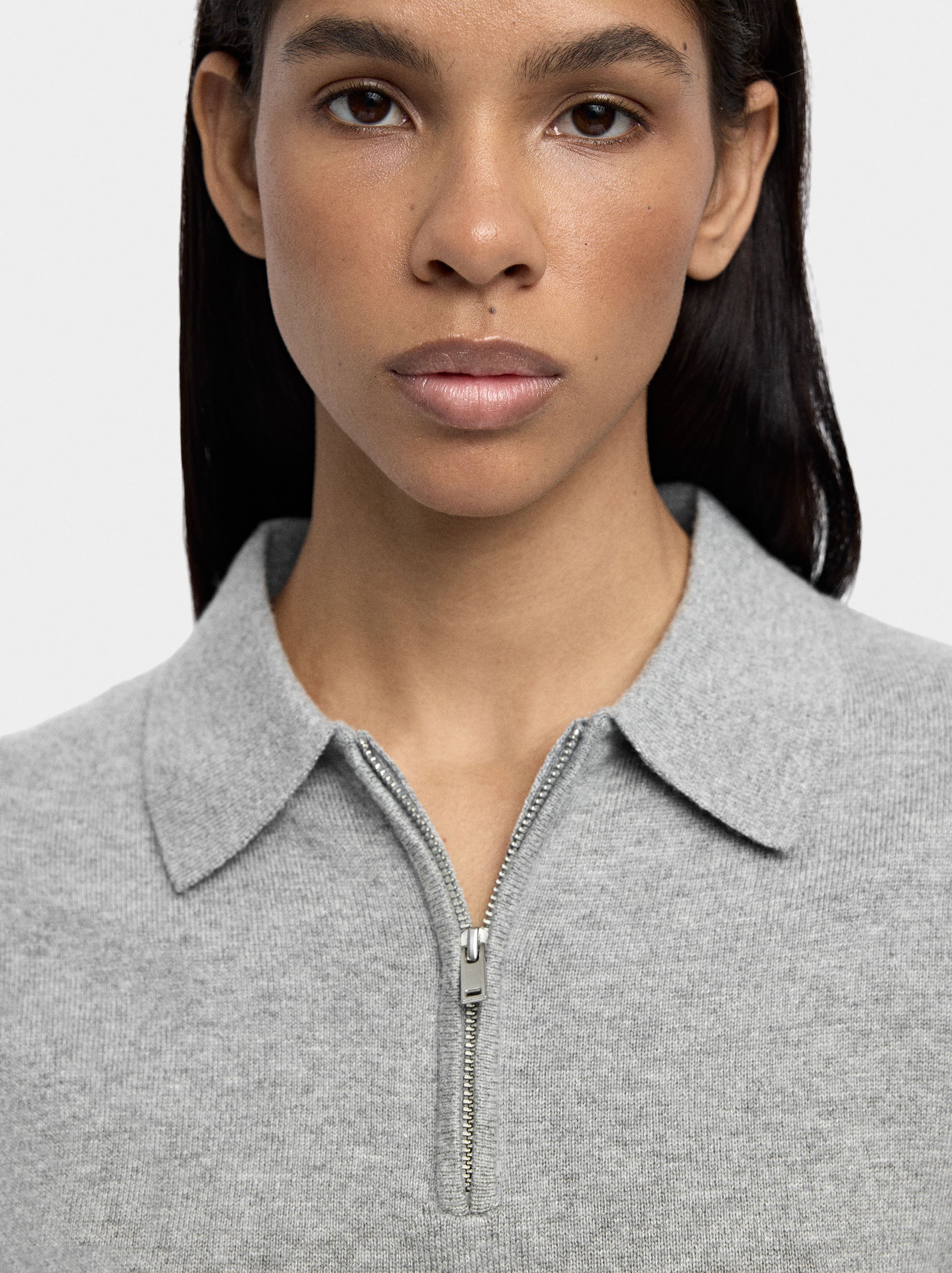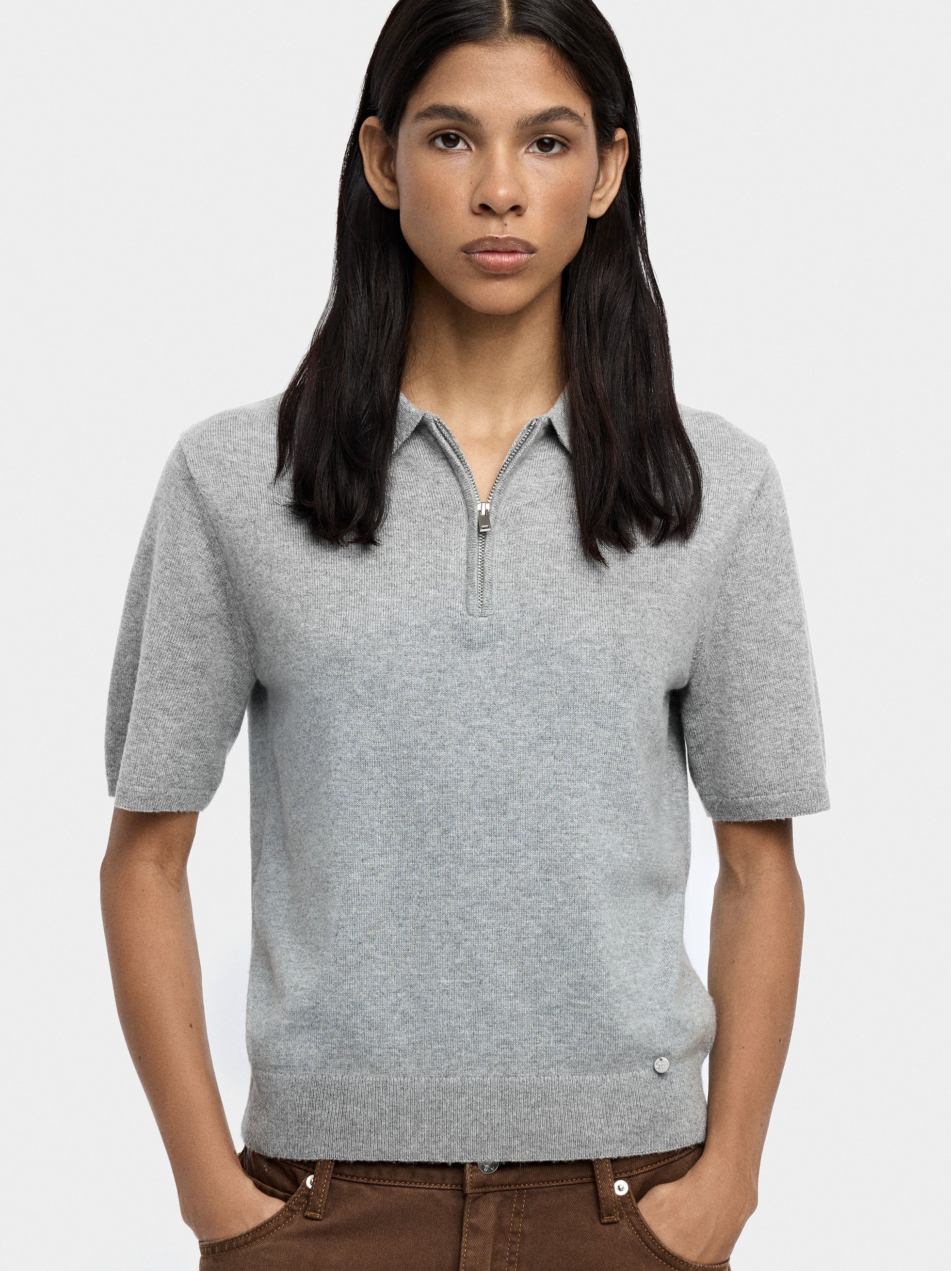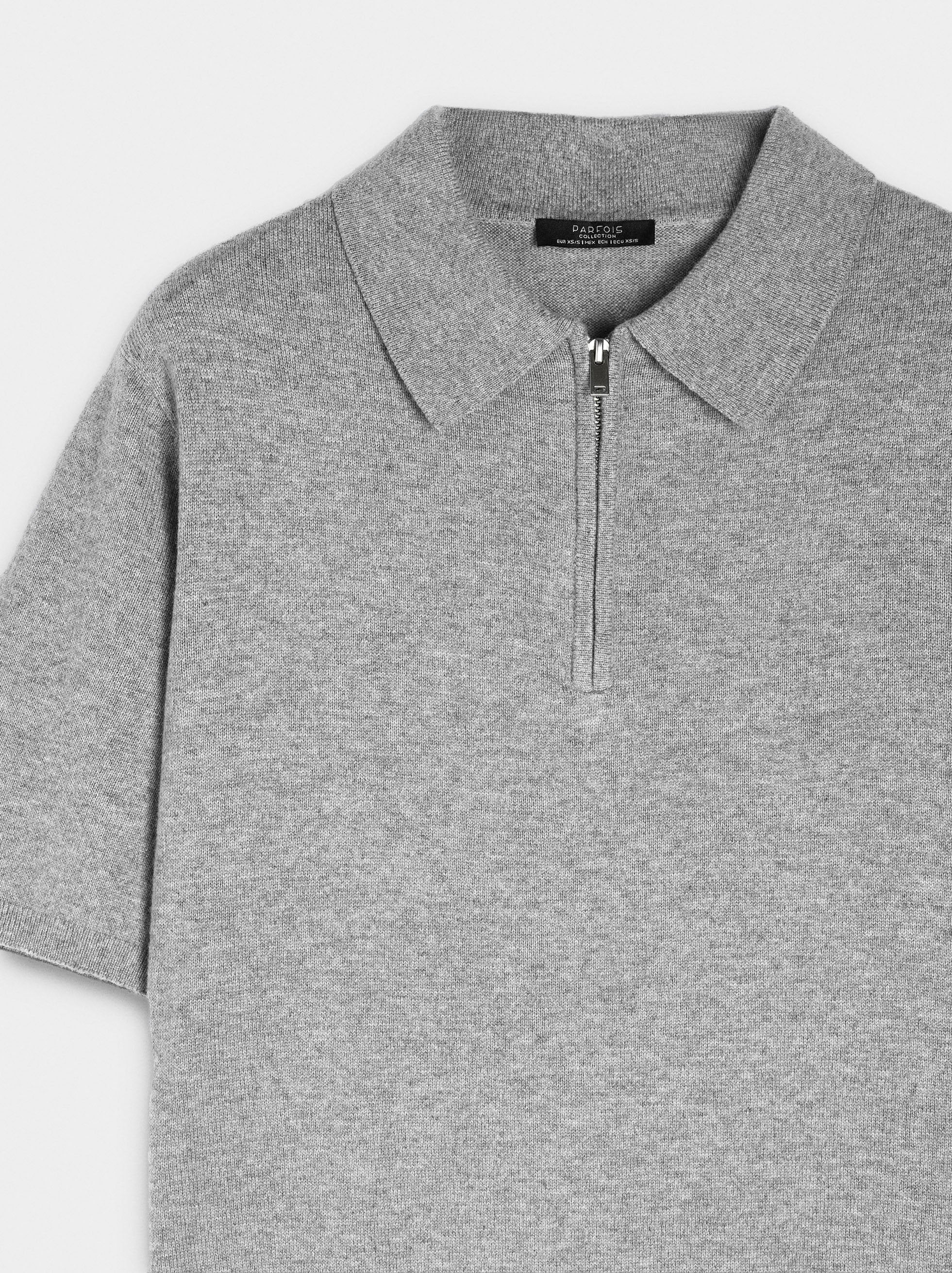 Jersey de punto. Cuello polo. Cierre de cremallera en la parte frontal. Manga corta. Bordes canalados. La modelo mide 1,76 m y lleva la talla XS-S.