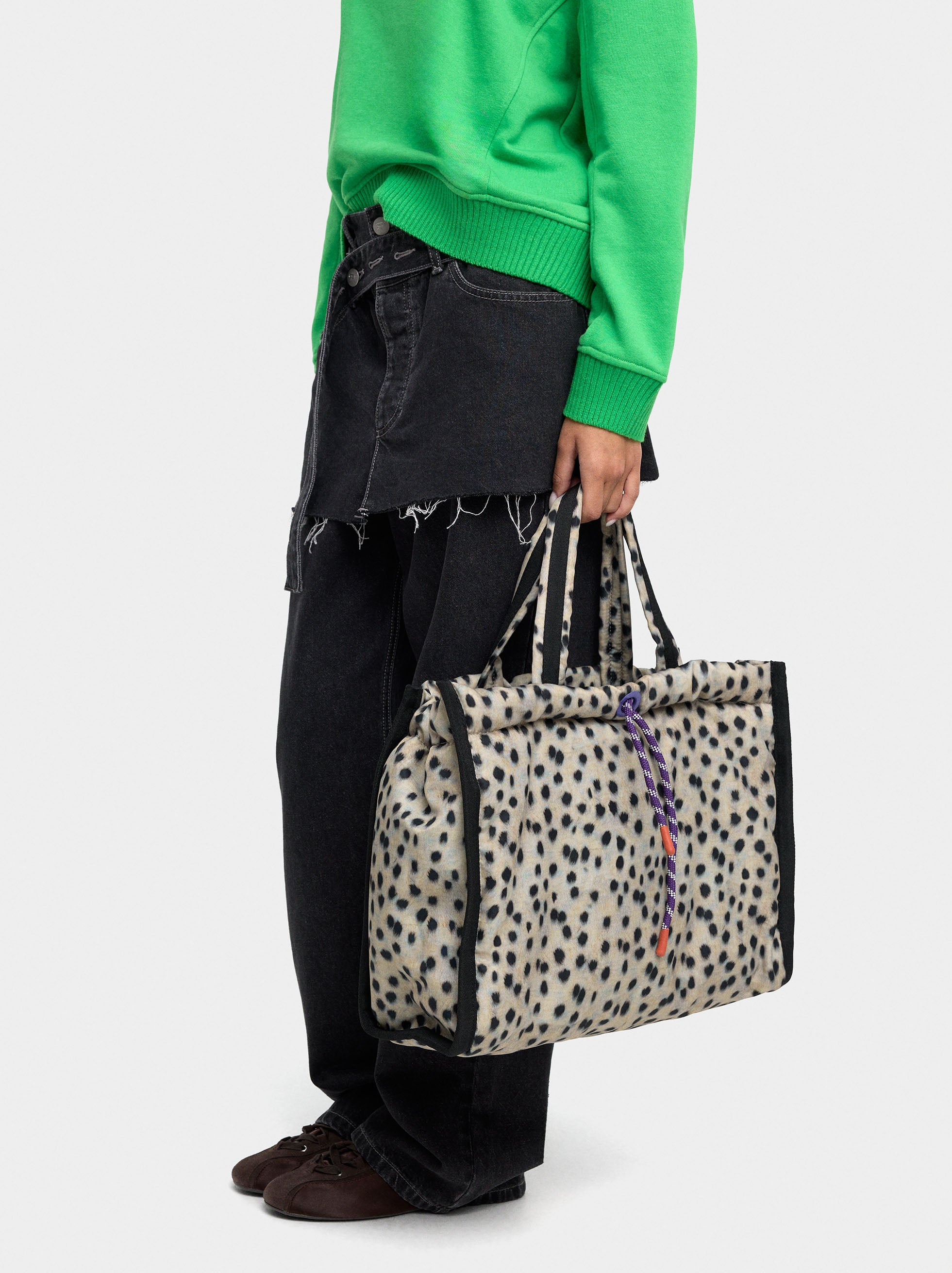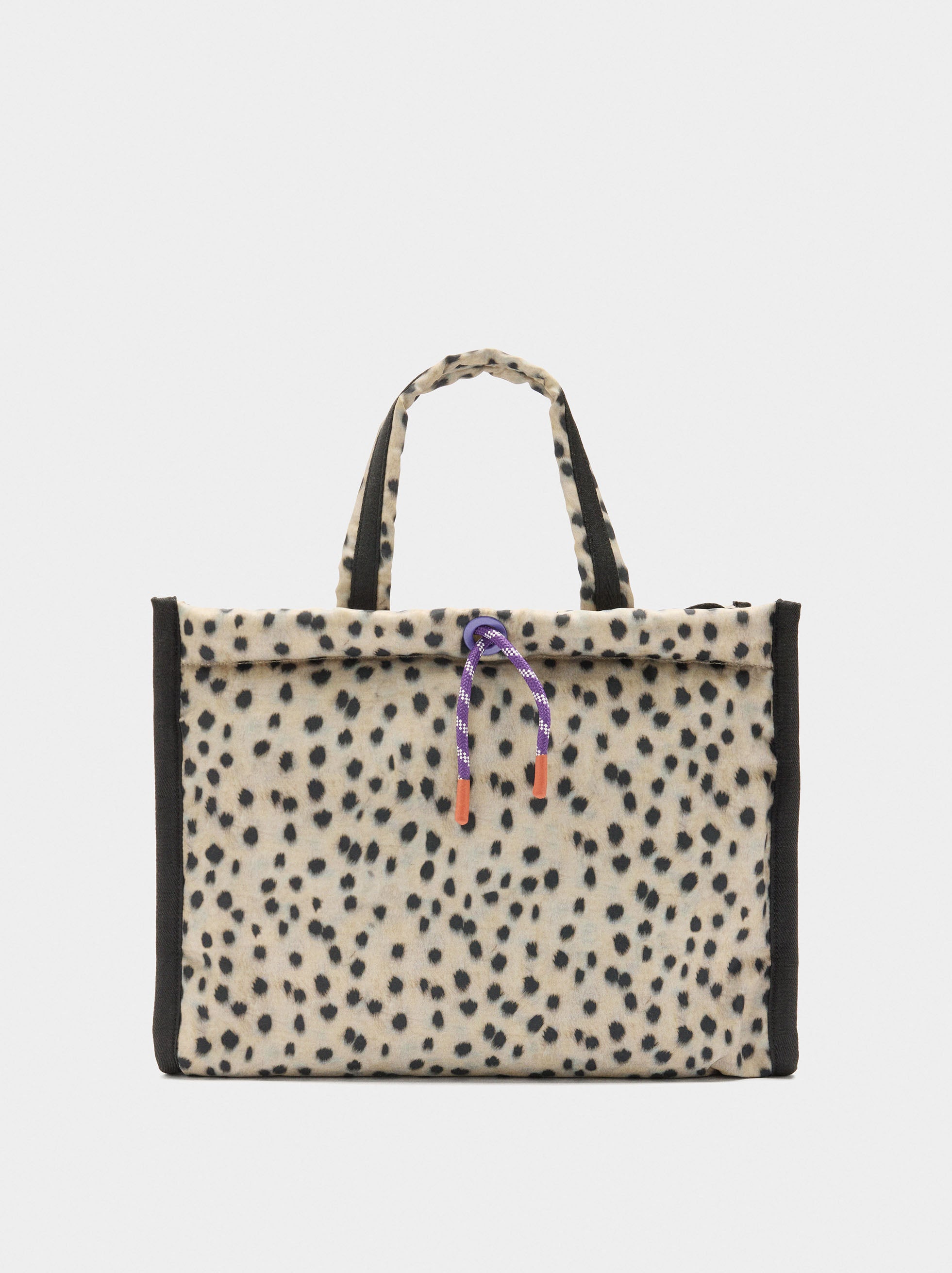 Bolso shopper de nylon con estampado animal. Tamaño grande. Forro, bolsillo interior y compartimento para portátil. Cierre de cremallera. Cinta para fruncir. Asas de mano fijas y bandolera ajustable.