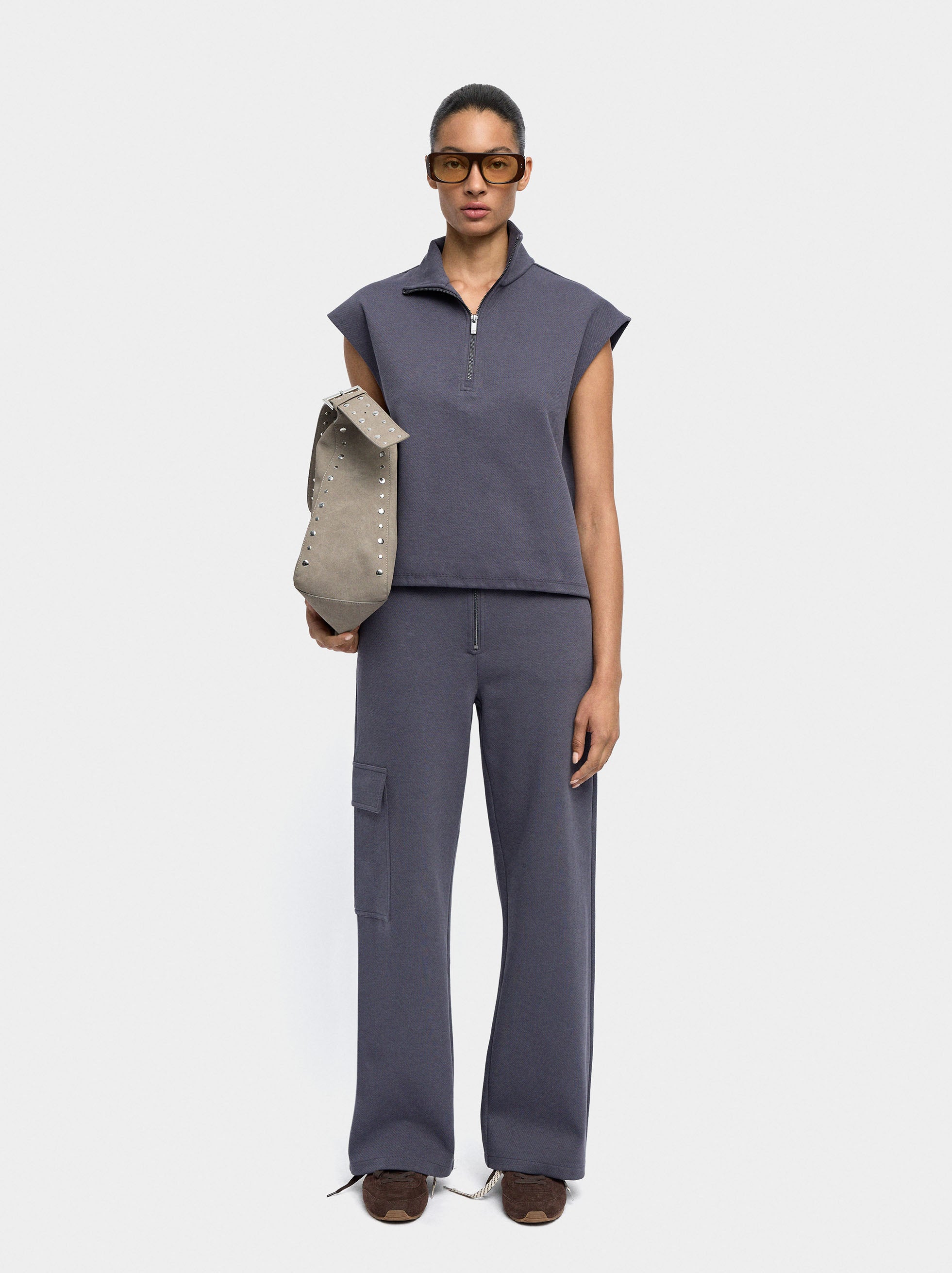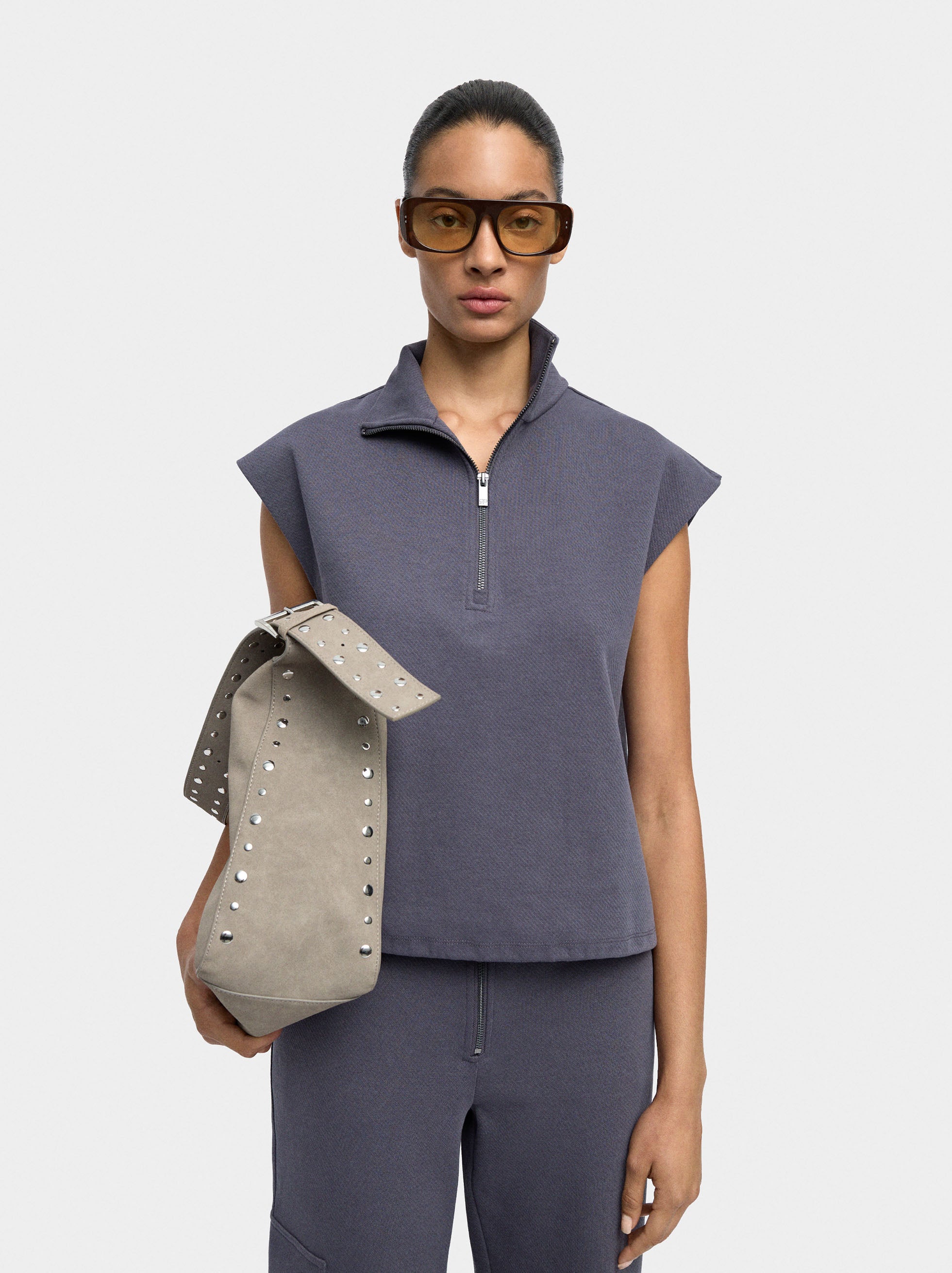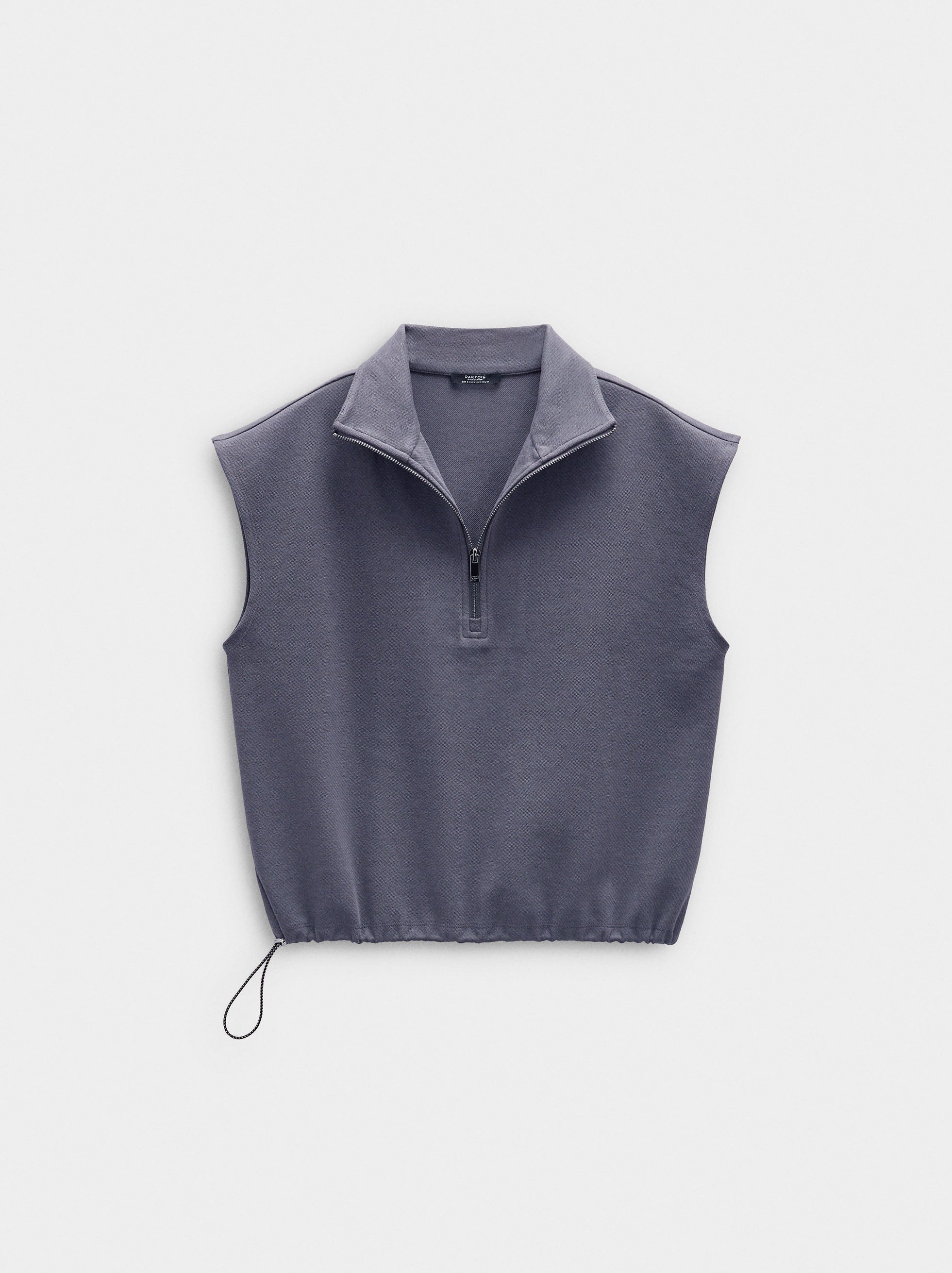 Sudadera de algodón sin mangas. Cuello de solapa con cierre de cremallera. Cordón en la parte inferior para fruncir. La modelo mide 1,78 m y lleva la talla S.