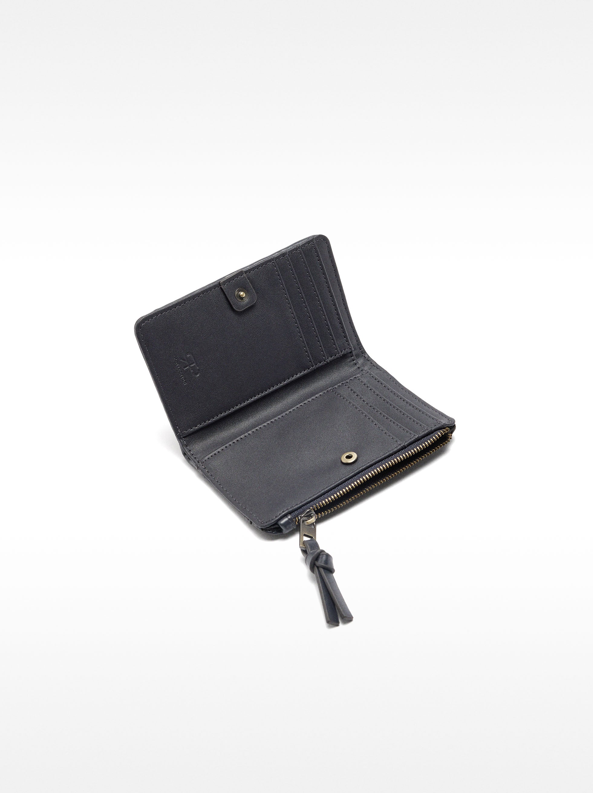 Cartera con trenzado multicolor. Cierre con botón de presión. Ranuras para tarjetas y billetes. Compartimento para monedas con cierre de cremallera. Ranura exterior en la parte posterior.