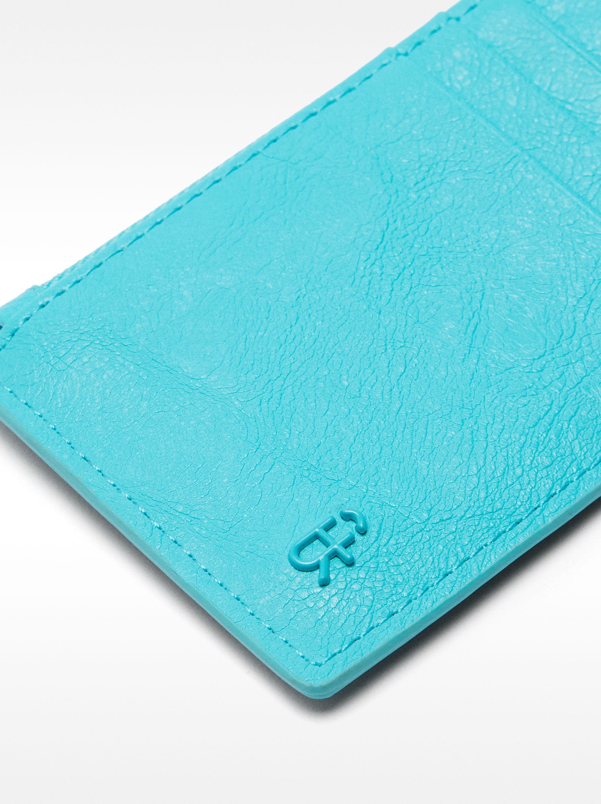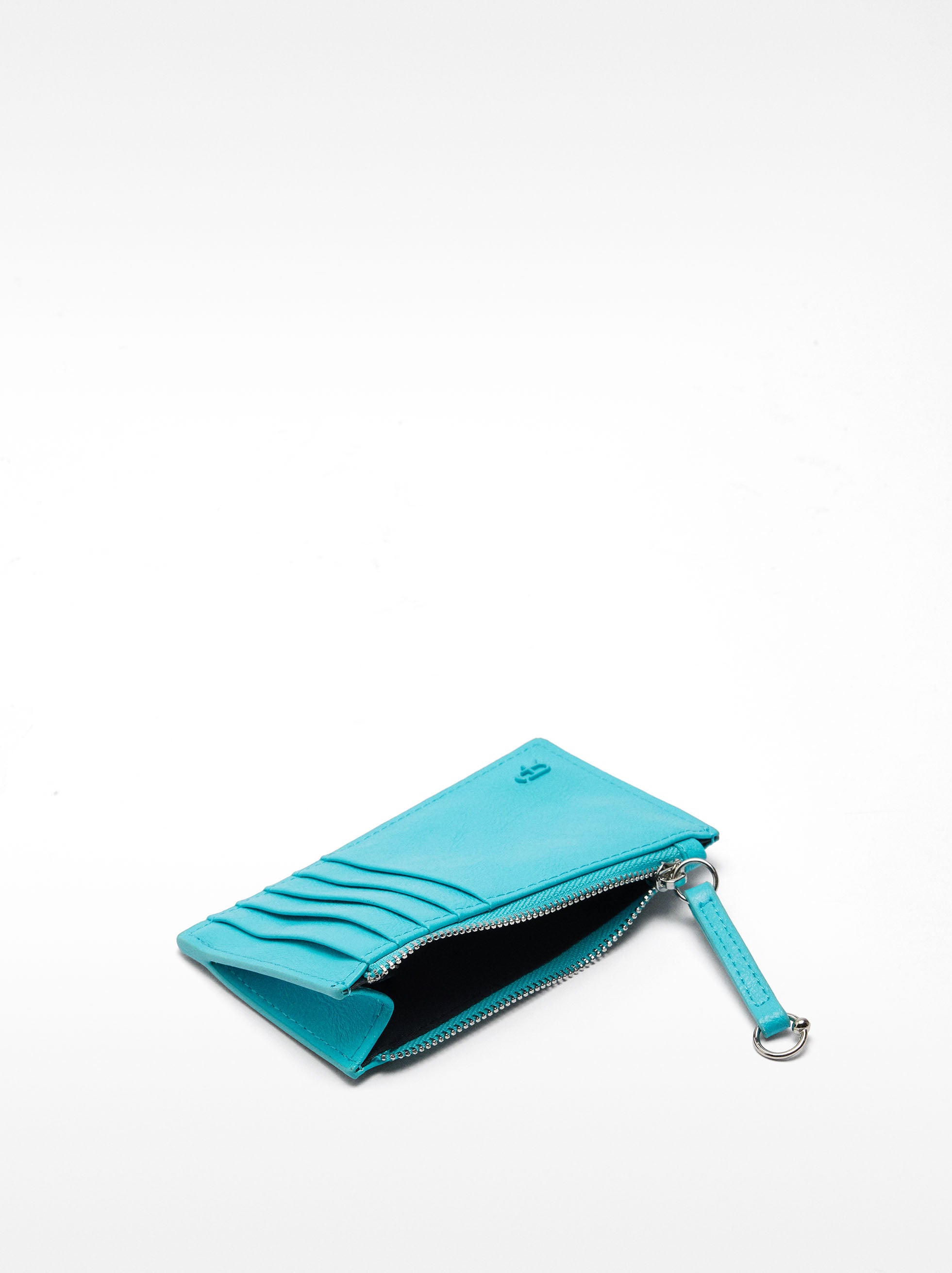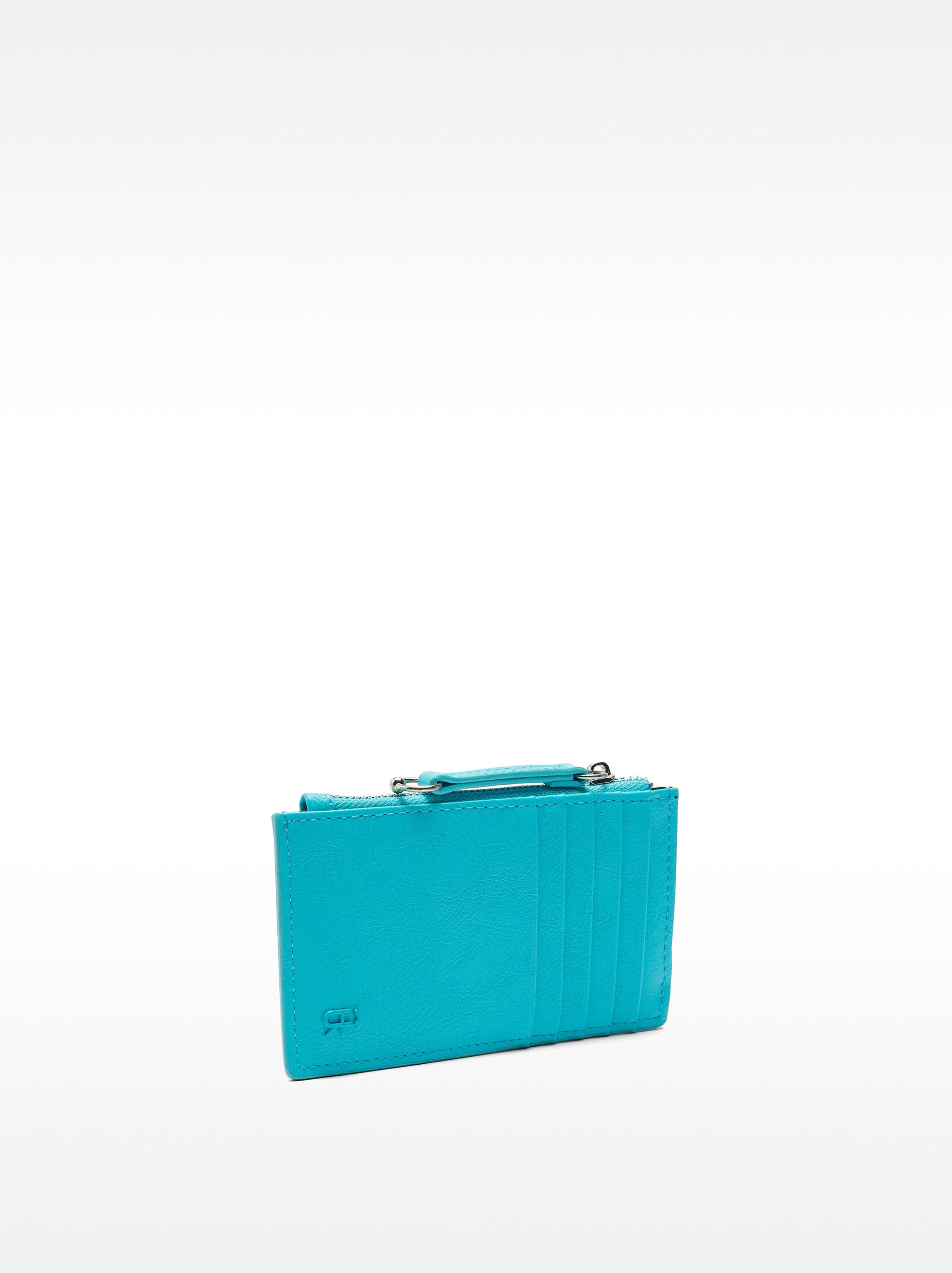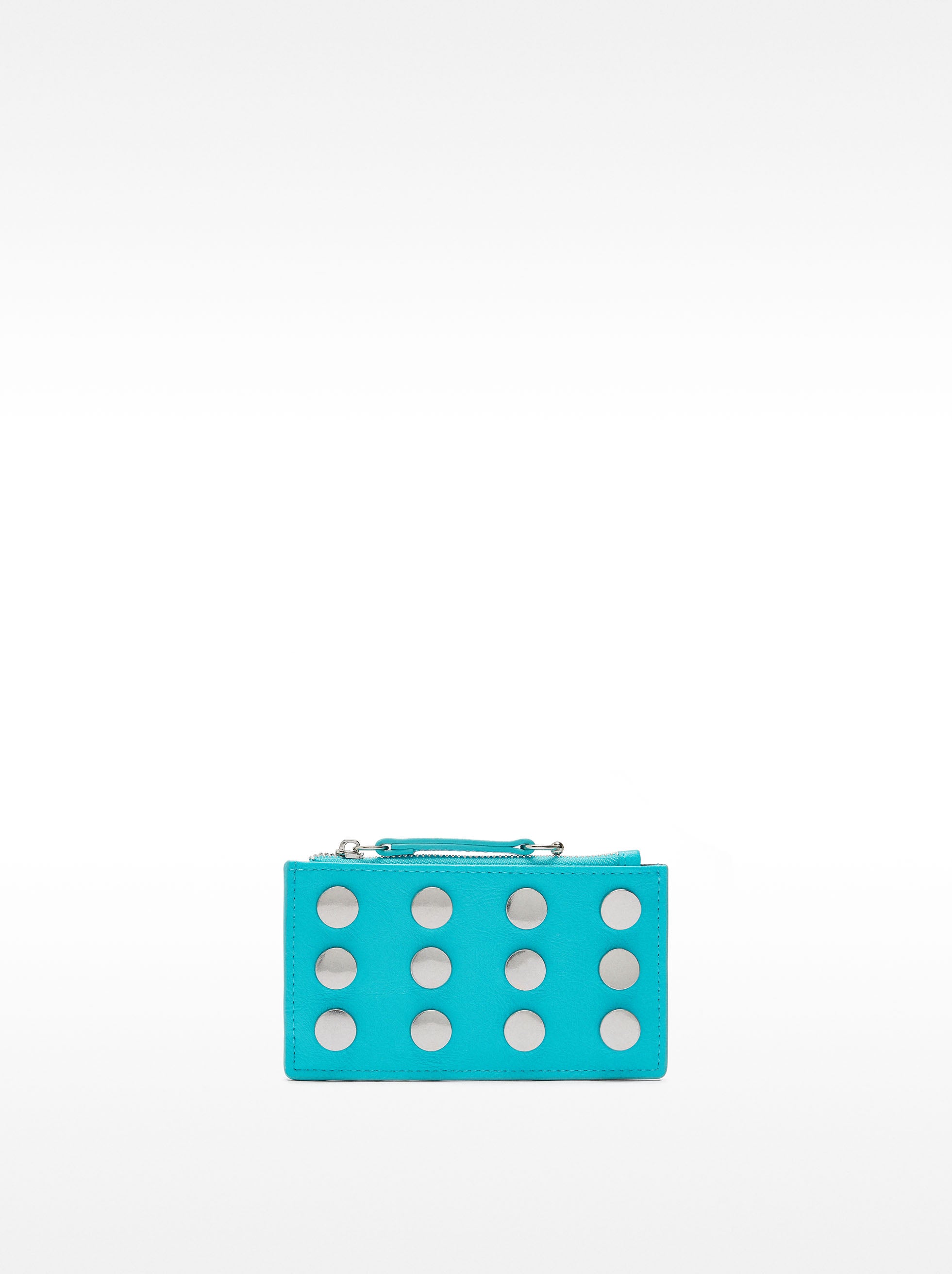 Tarjetero con tachuelas. Efecto craquelado. Bolsillo con cierre de cremallera. Forro interior.
