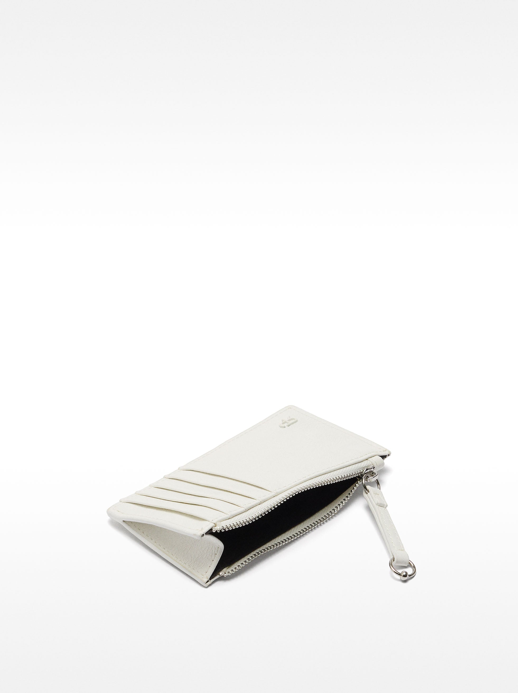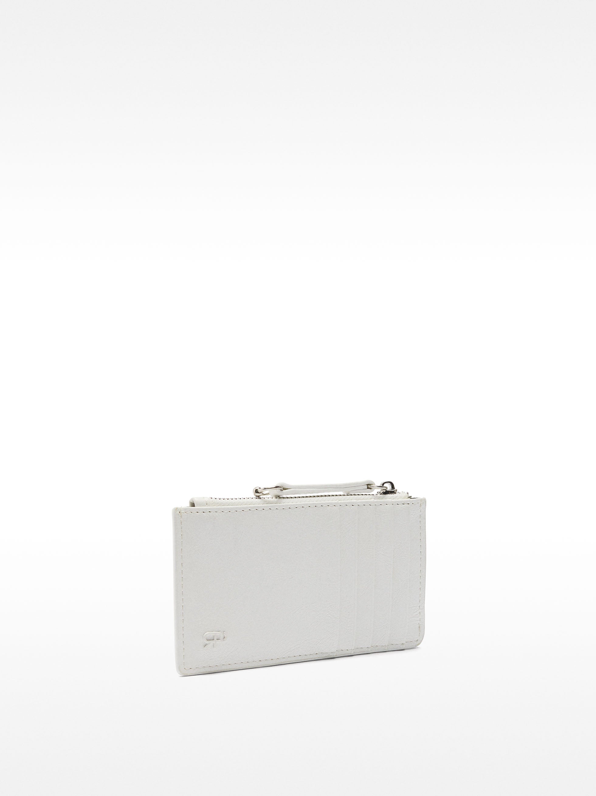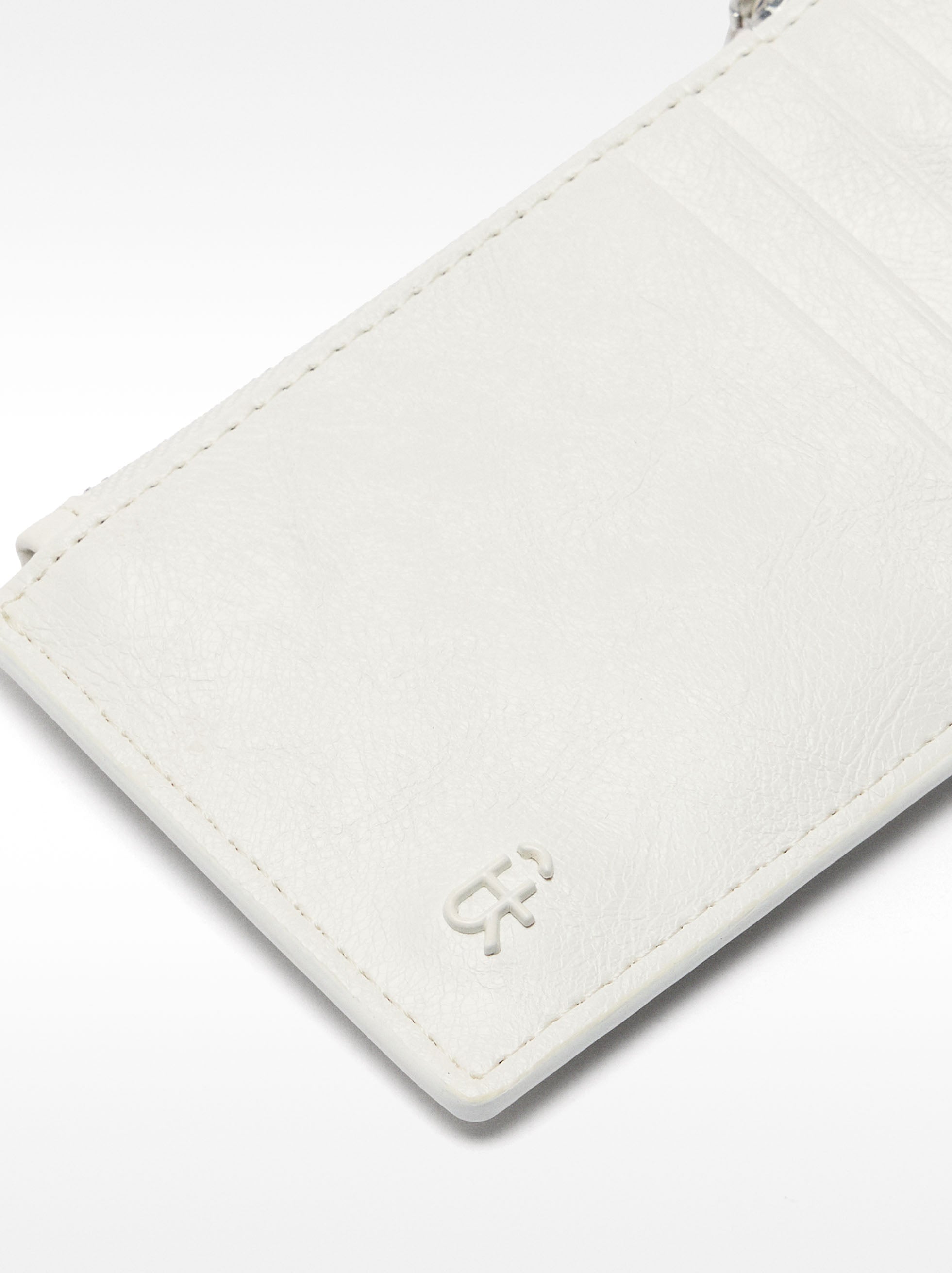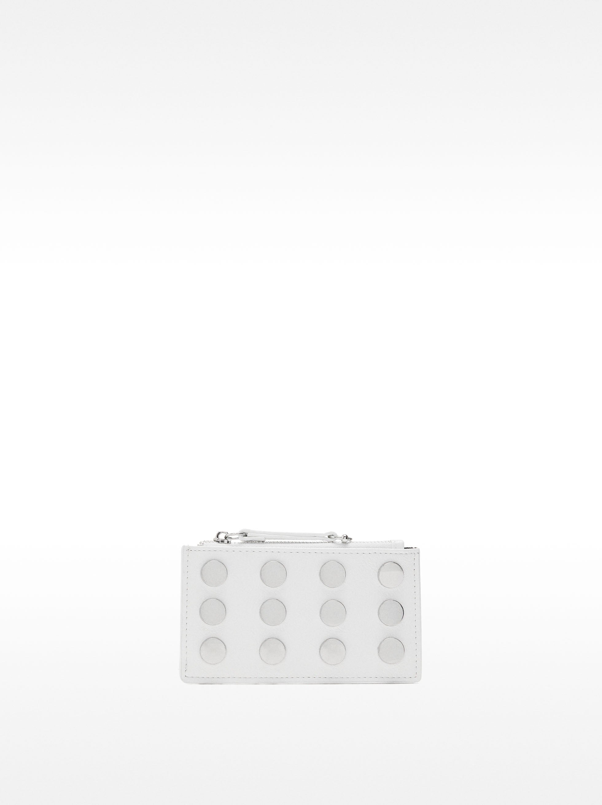 Tarjetero con tachuelas. Efecto craquelado. Bolsillo con cierre de cremallera. Forro interior.