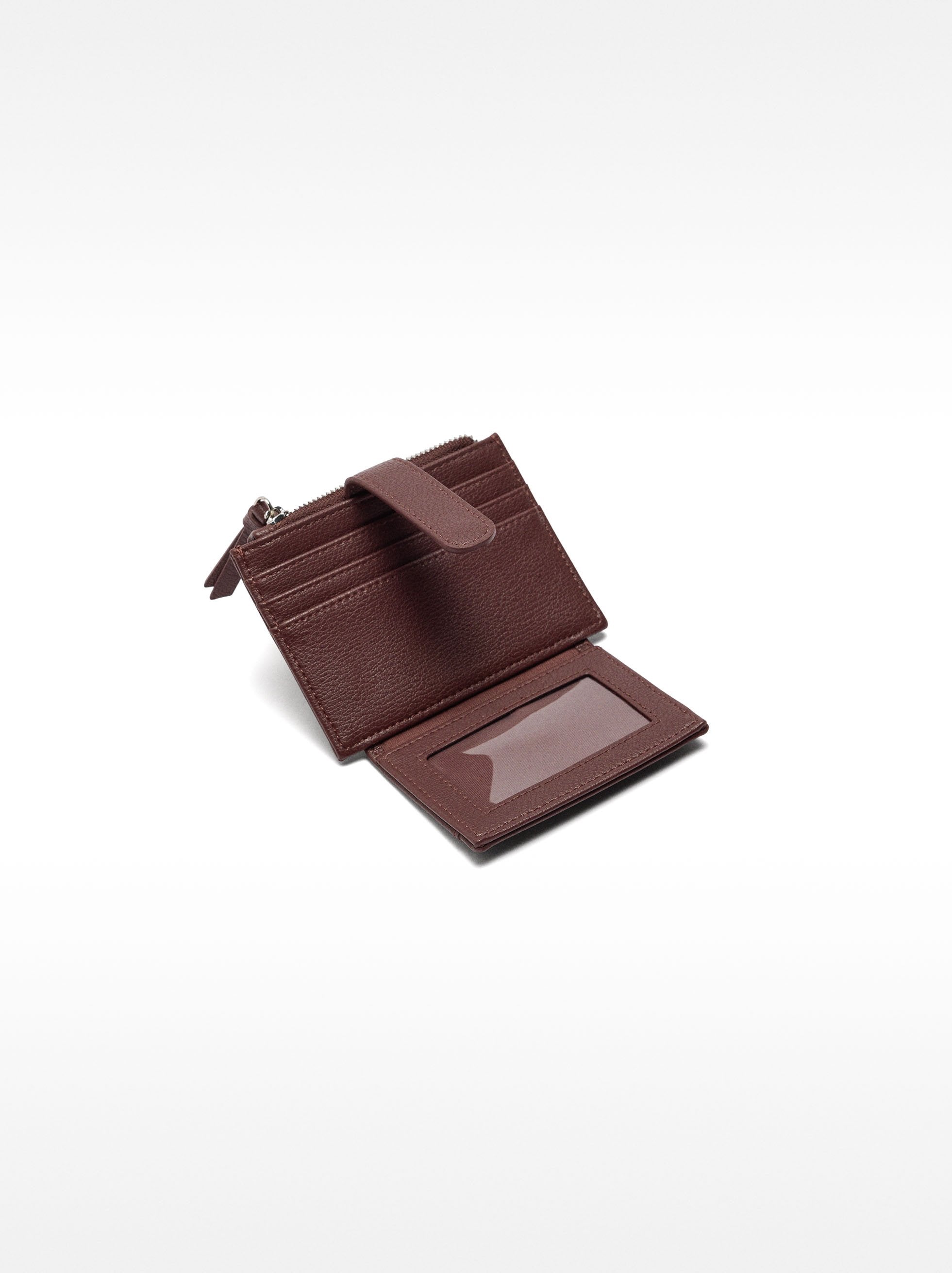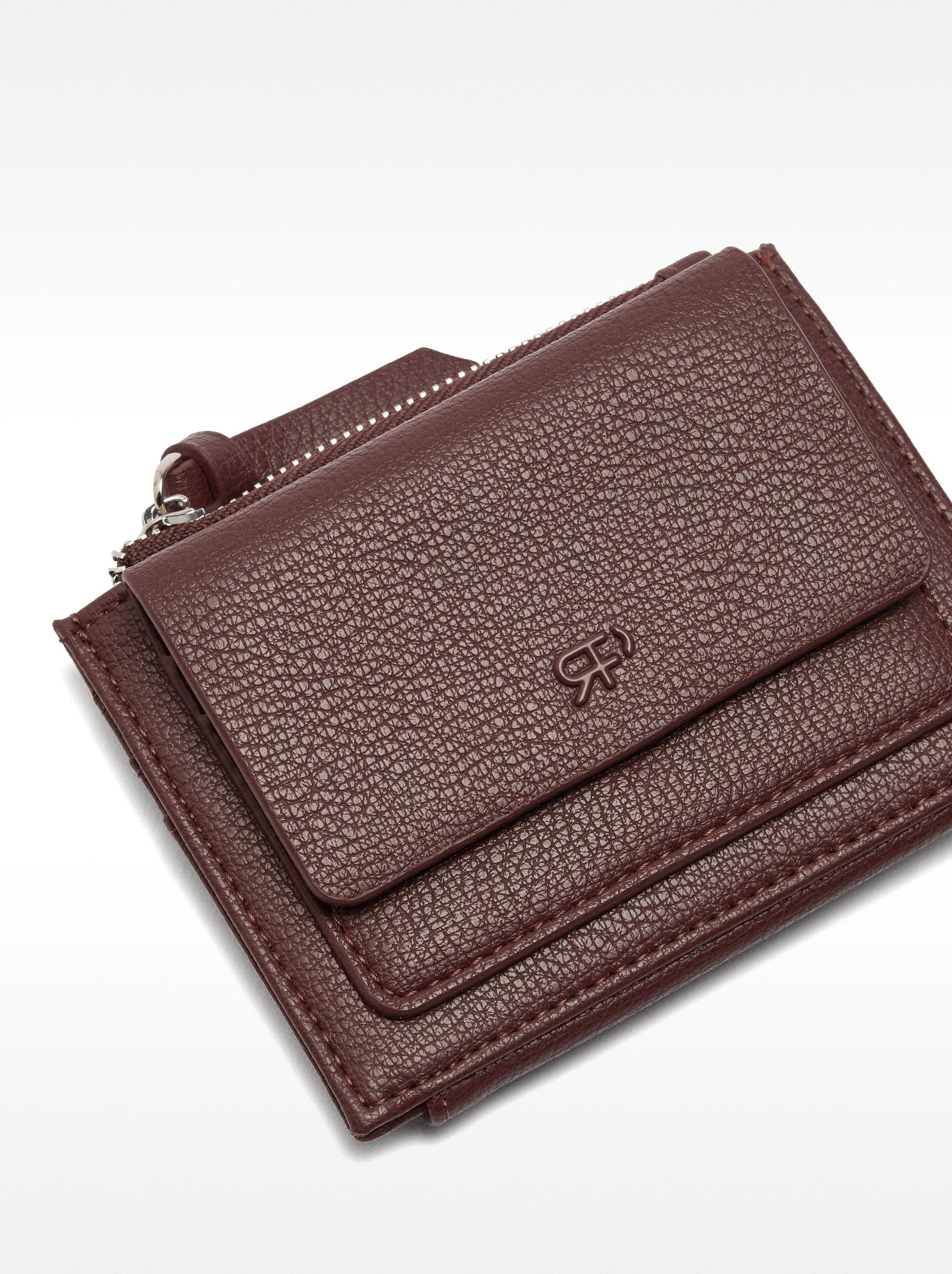 Tarjetero con textura. Dos compartimentos: uno con solapa y botón de presión; otro con cierre de cremallera y forro interior.