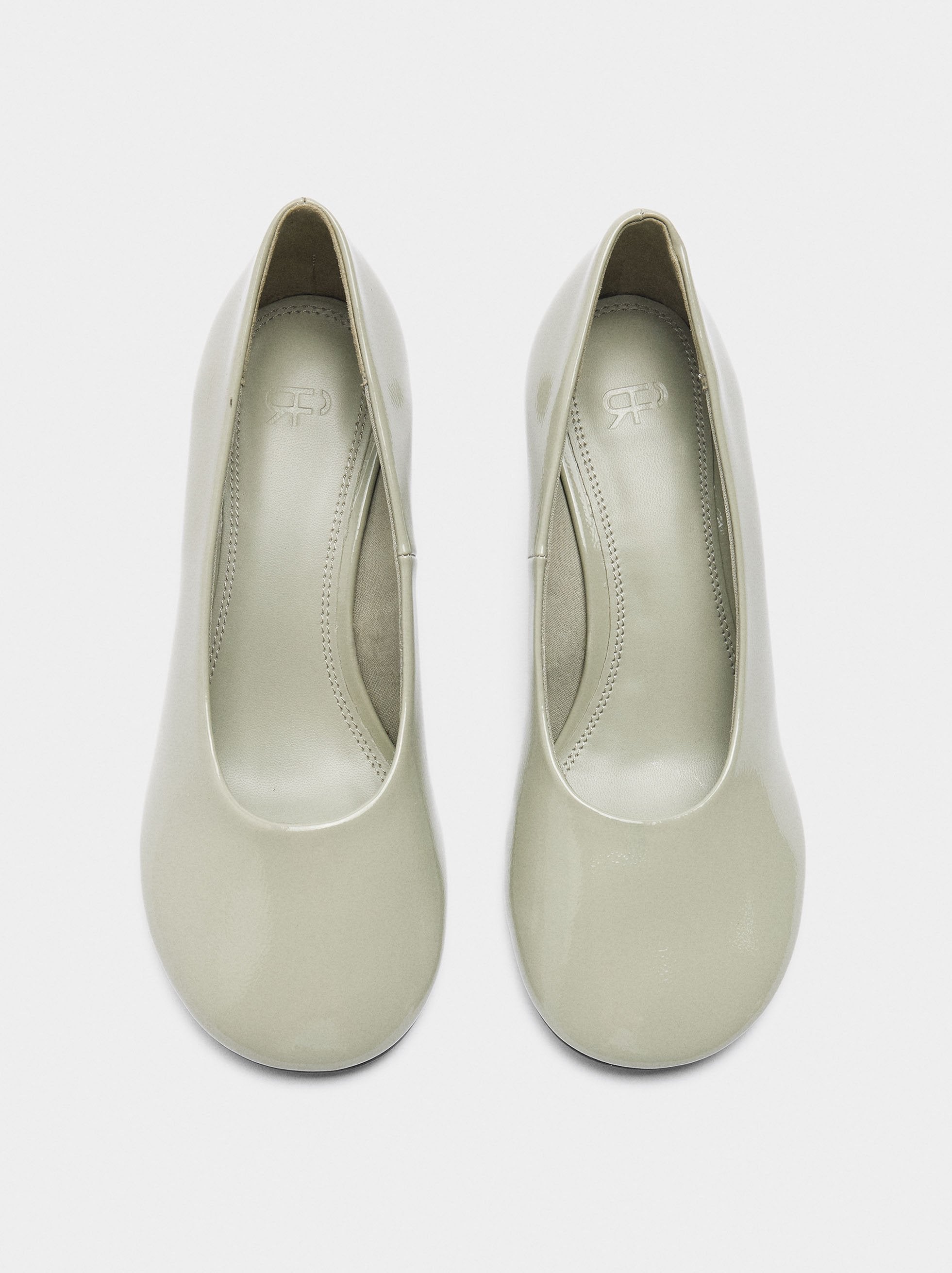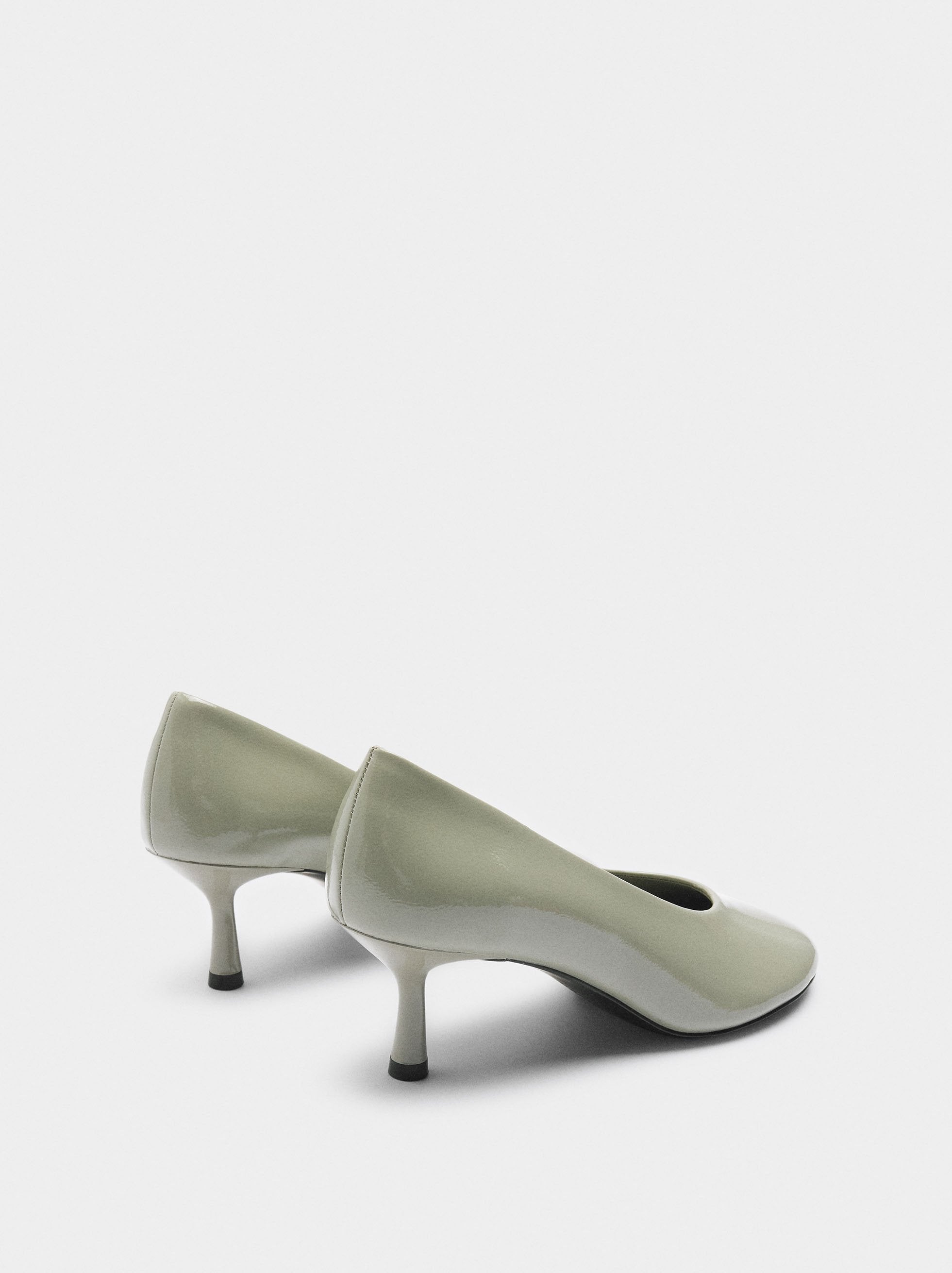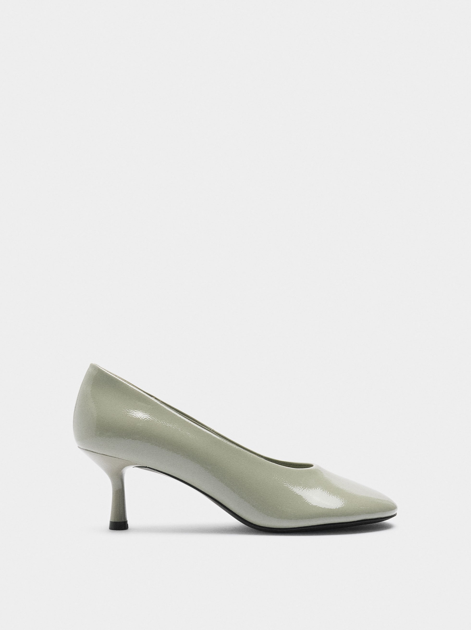 Zapatos lisos de tacón alto charolados. Plantilla acolchada con pespuntes marcados. Punta redonda. Suela de poliuretano termoplástico. Altura del tacón: 6 cm.
