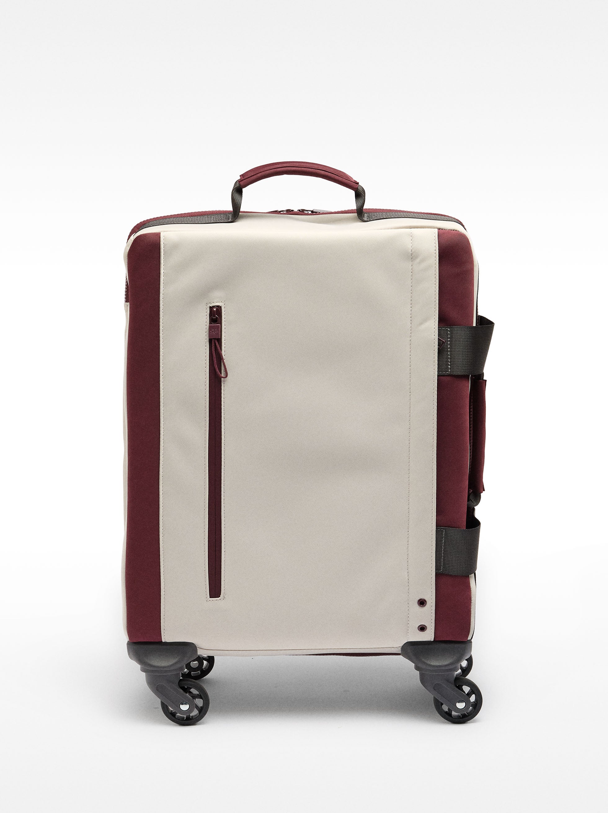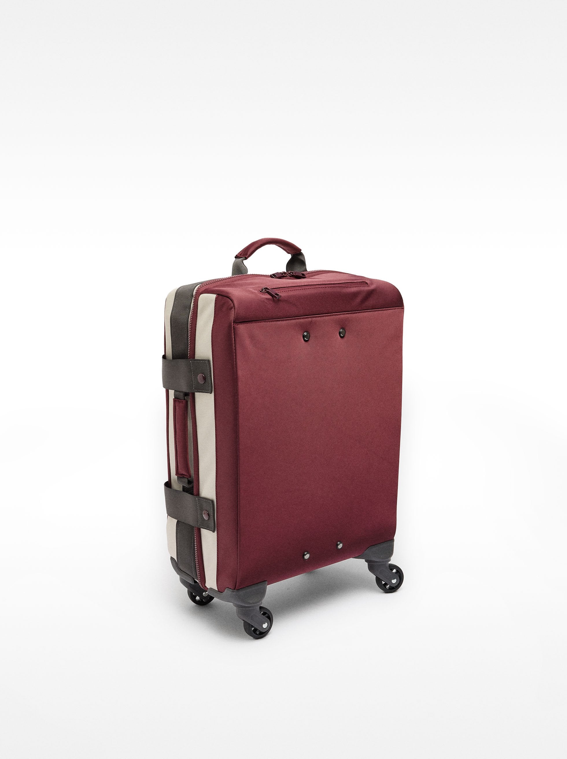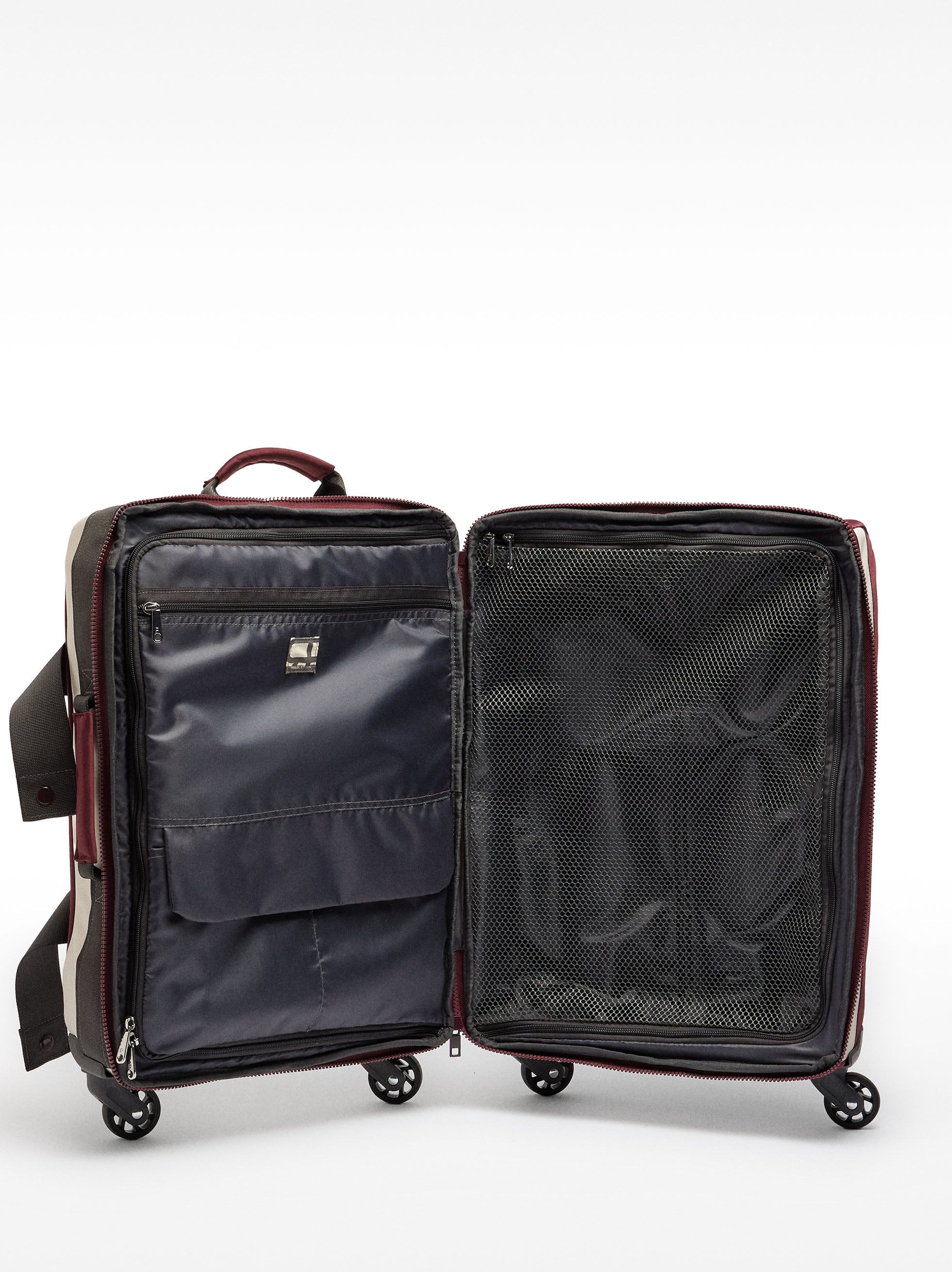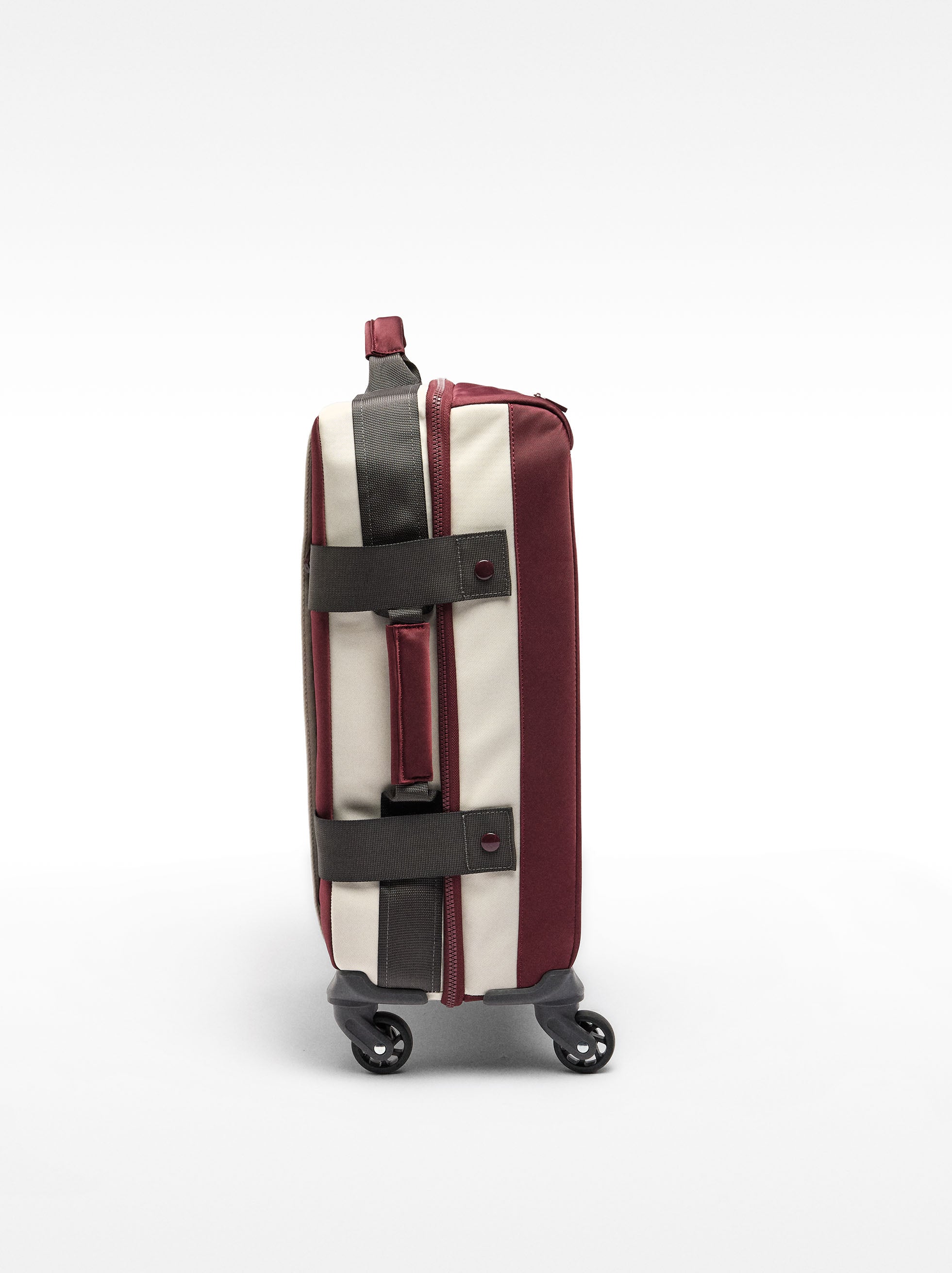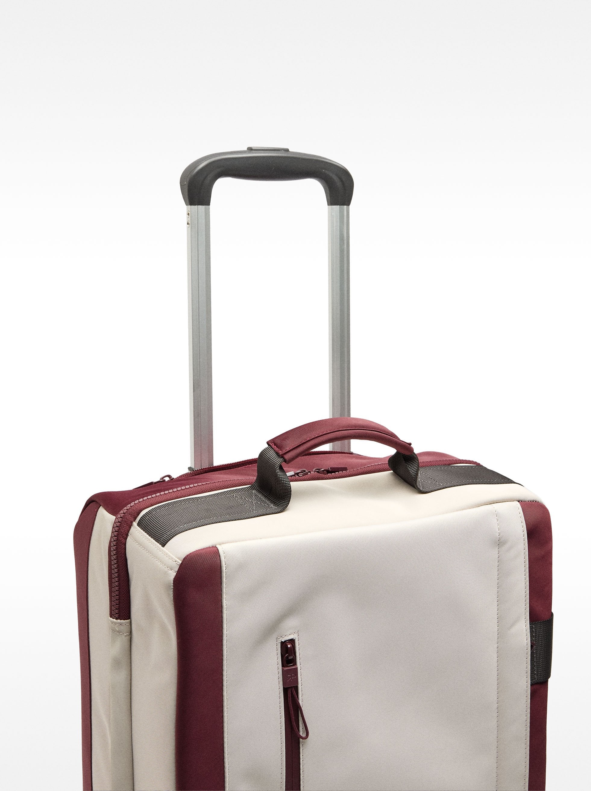 Maleta de viaje de nylon con cuatro ruedas. Asa ergonómica extensible con seguro. Bolsillos internos con cremallera y red. Elásticos interiores. Asa superior y lateral. Bolsillos delanteros con cierre de cremallera. Se puede transportar a bordo del avión, según las dimensiones permitidas.
