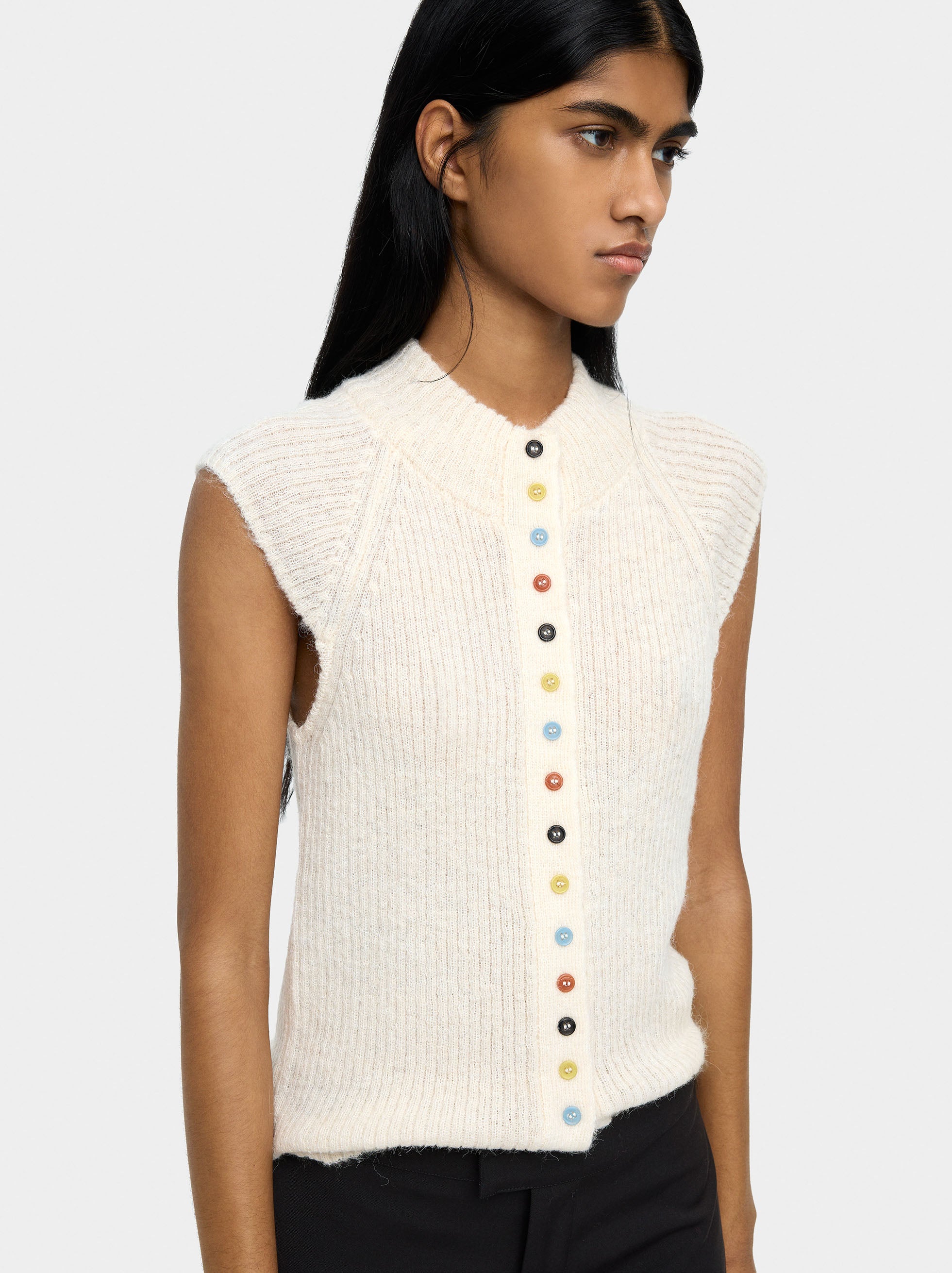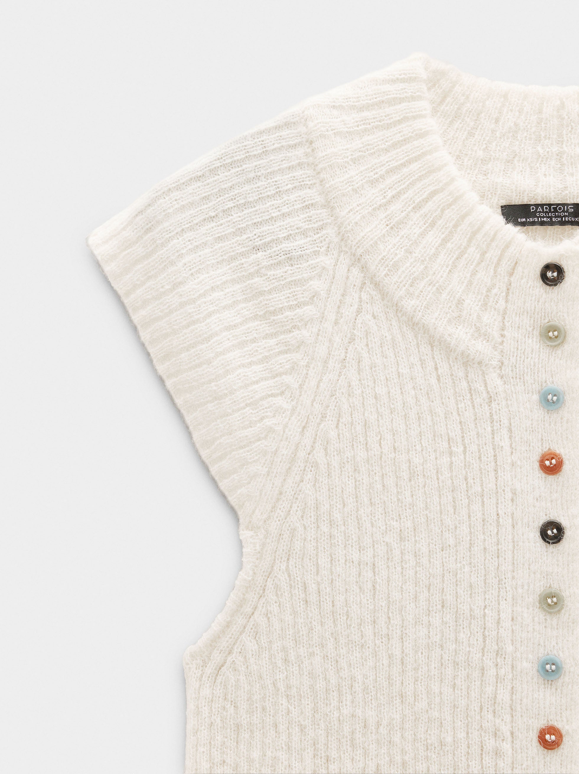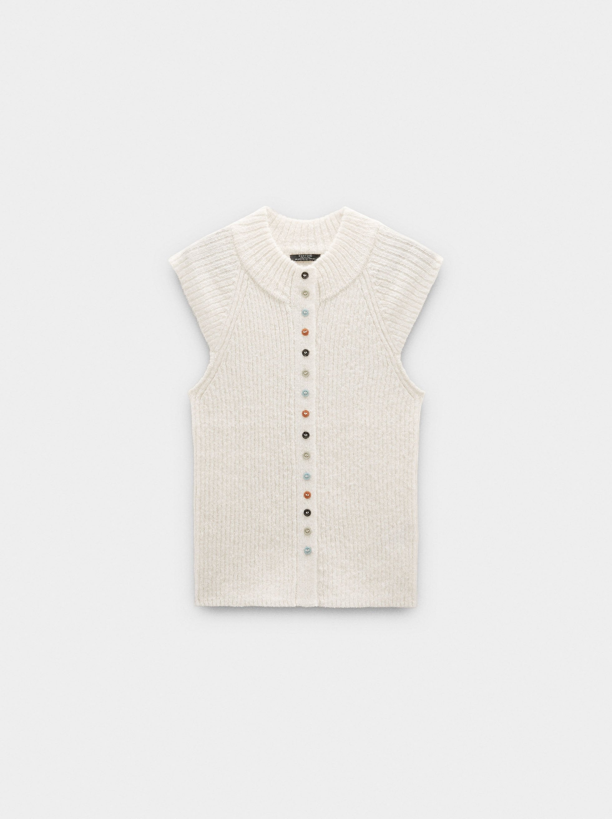 Chaleco de punto canalado con mezcla de lana. Cuello redondo. Sin mangas. Cierre con botones de varios colores. La modelo mide 1,72 m y lleva la talla XS-S.