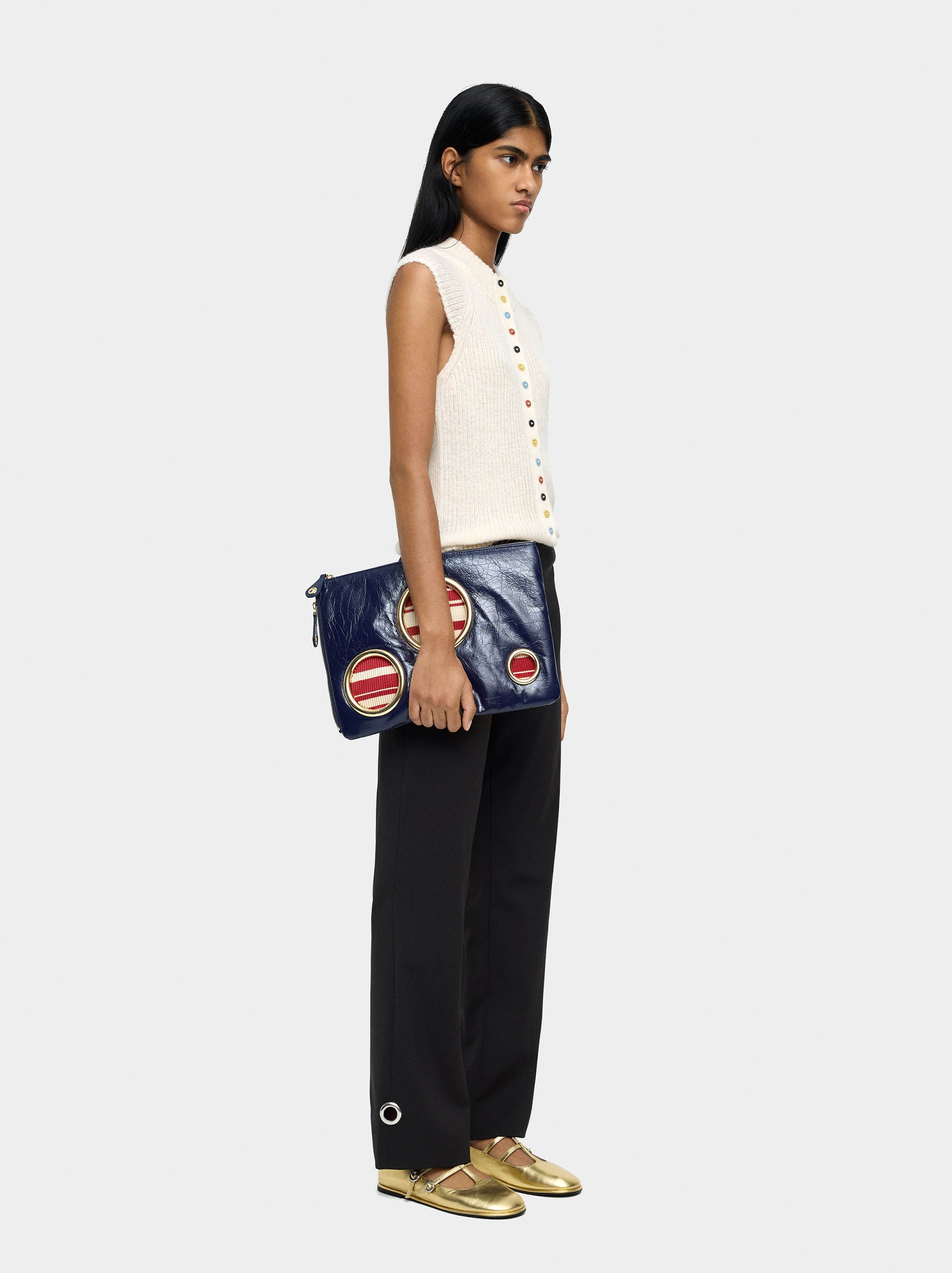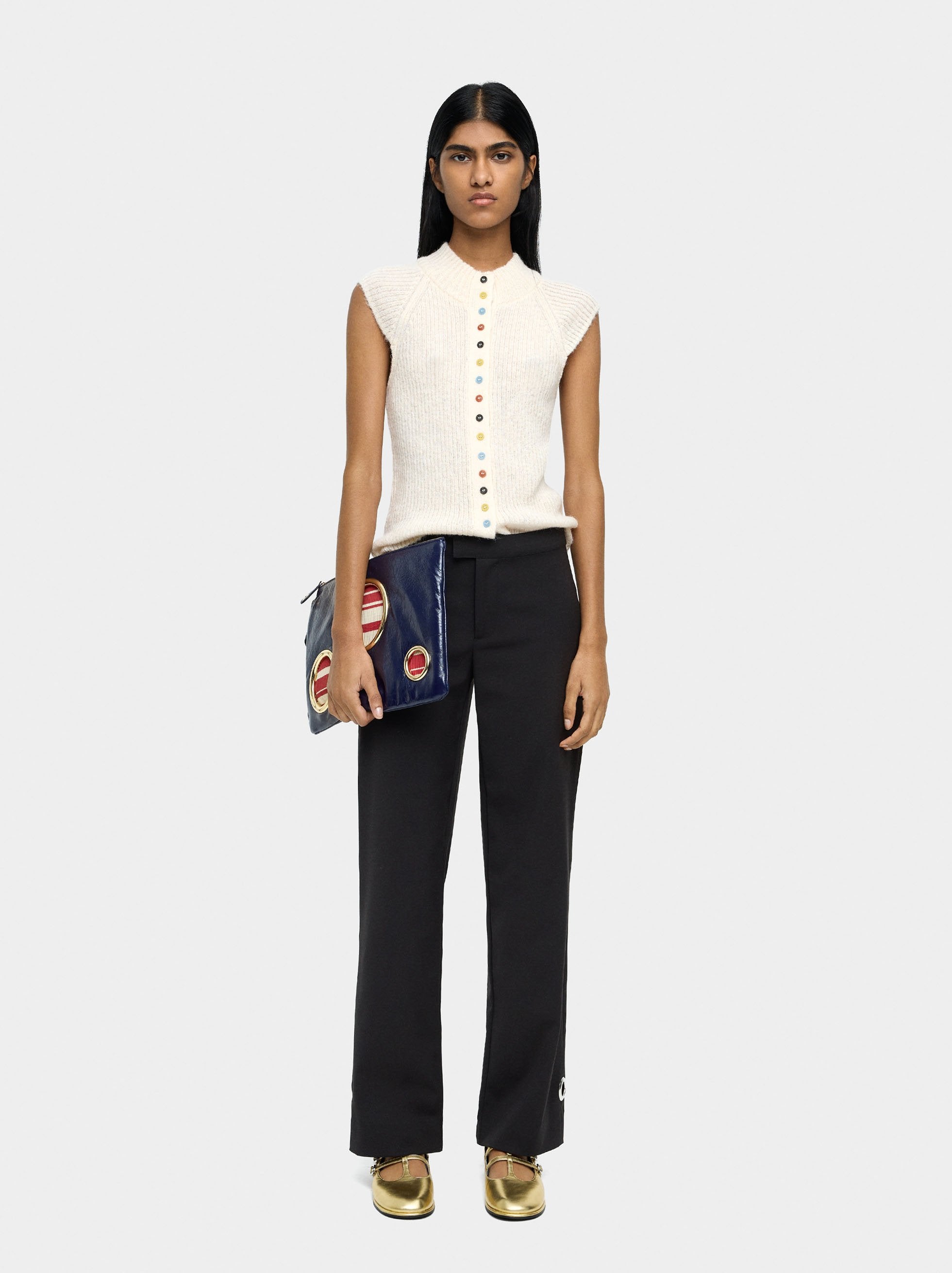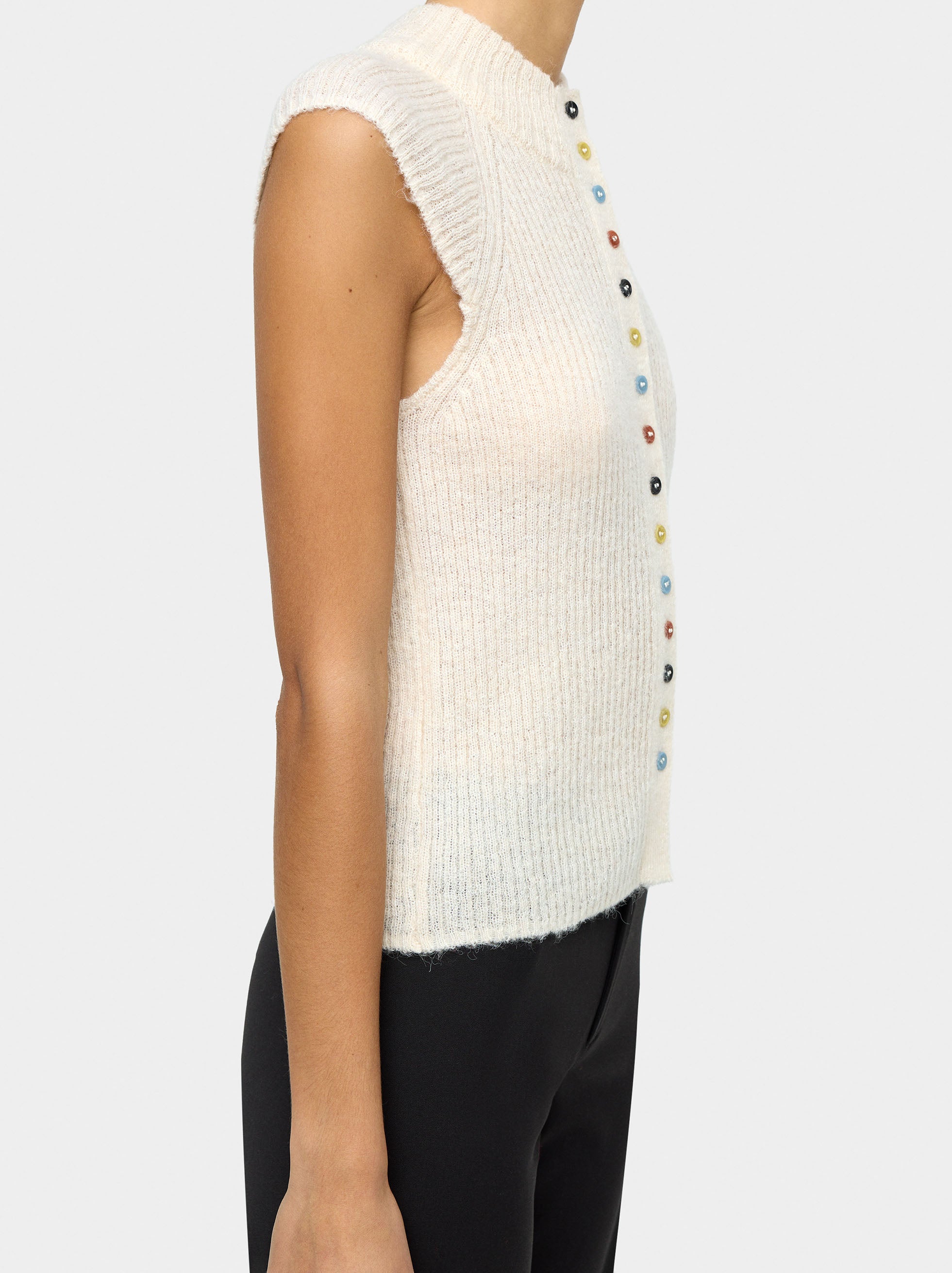 Chaleco de punto canalado con mezcla de lana. Cuello redondo. Sin mangas. Cierre con botones de varios colores. La modelo mide 1,72 m y lleva la talla XS-S.