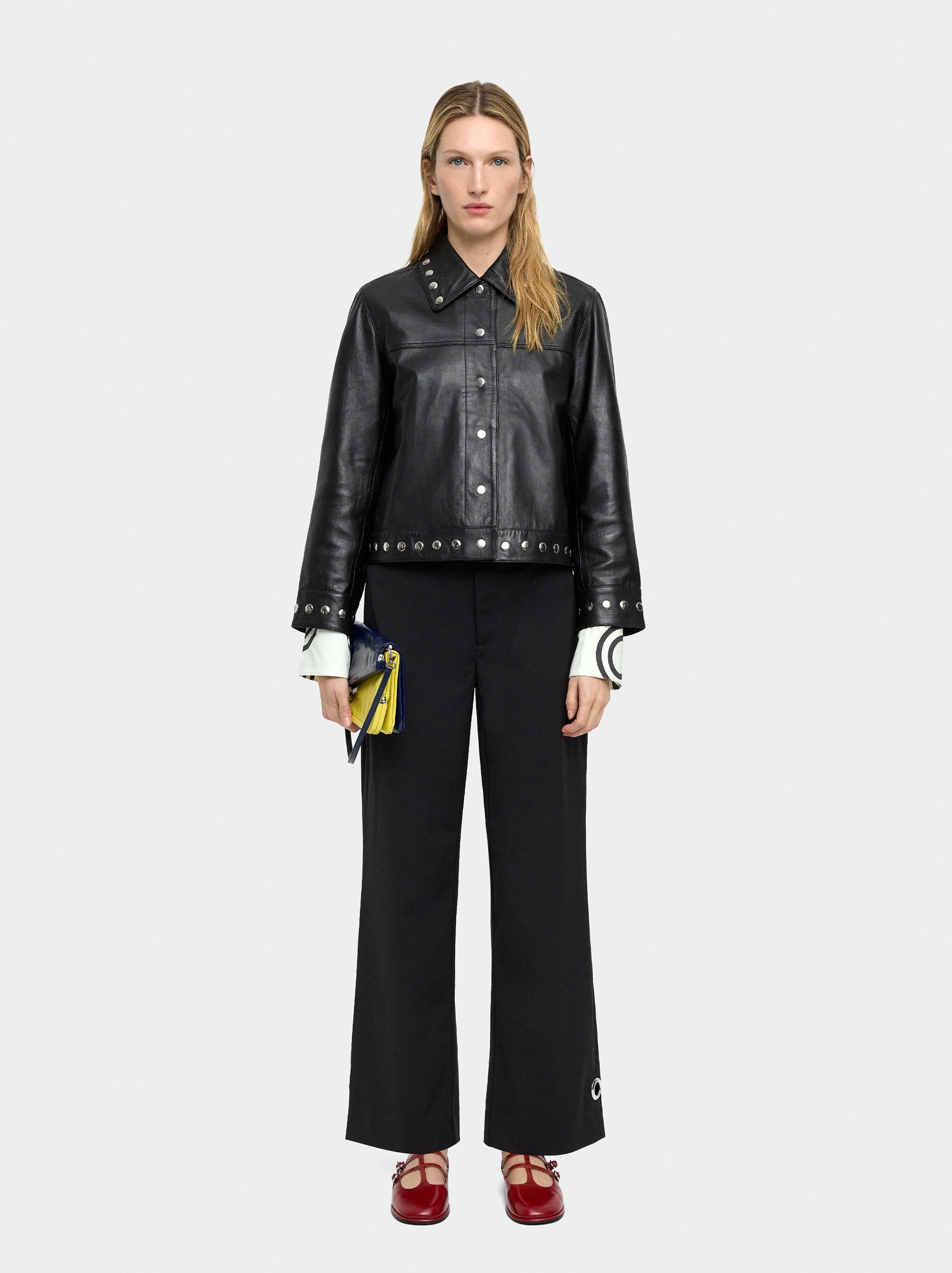 Chaqueta de piel con corte recto y estilo moderno. Cuello de camisa. Cierre frontal con botones de presión metálicos. Detalles de tachuelas plateadas en el cuello, puños y dobladillo, que aportan un toque contemporáneo. La modelo mide 1,72 m y lleva la ta