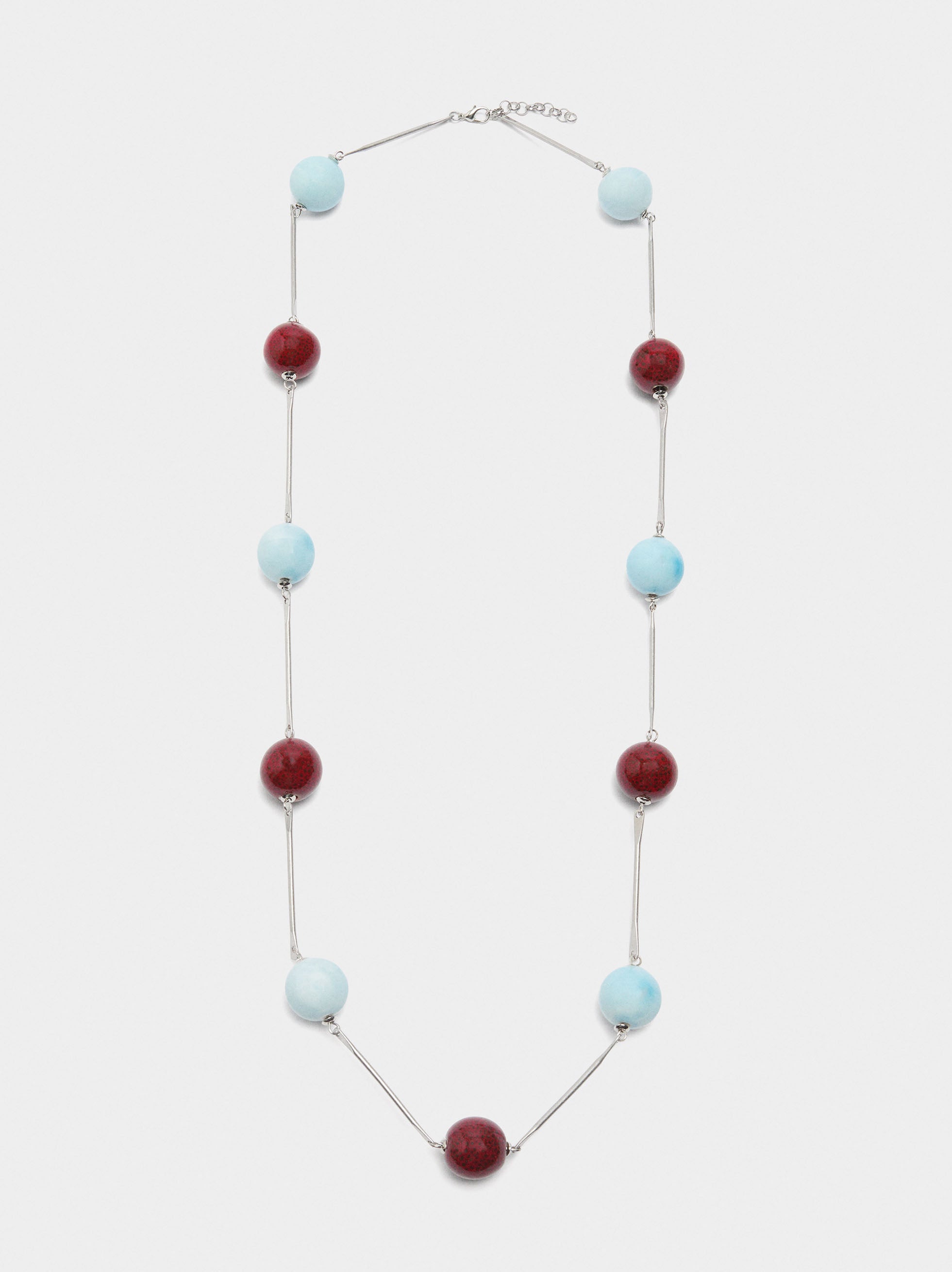 Collar largo con esferas bicolor de cerámica, separadas por barras metálicas con acabado plateado. Cierre de mosquetón. Diseño moderno, divertido y creativo.