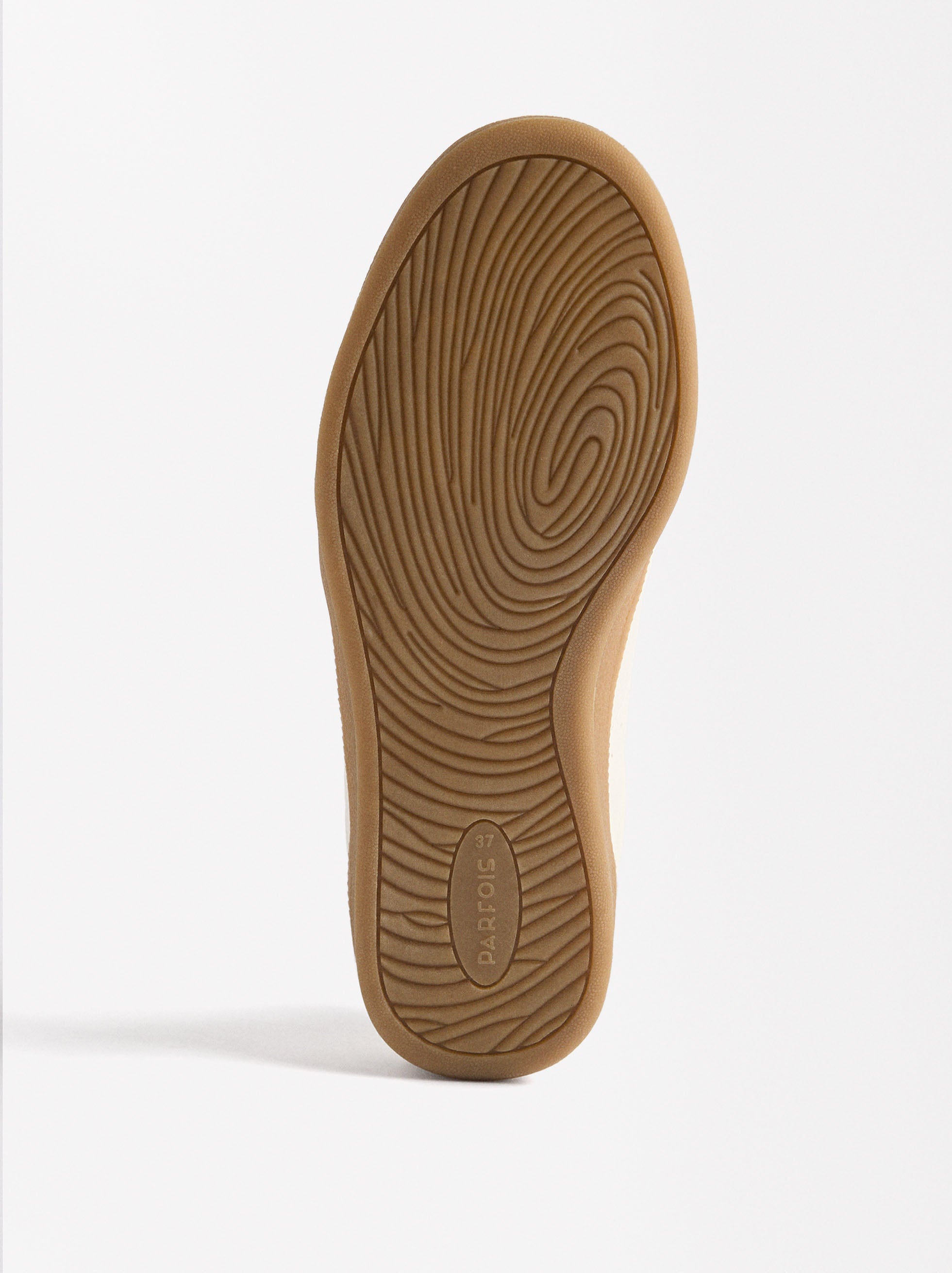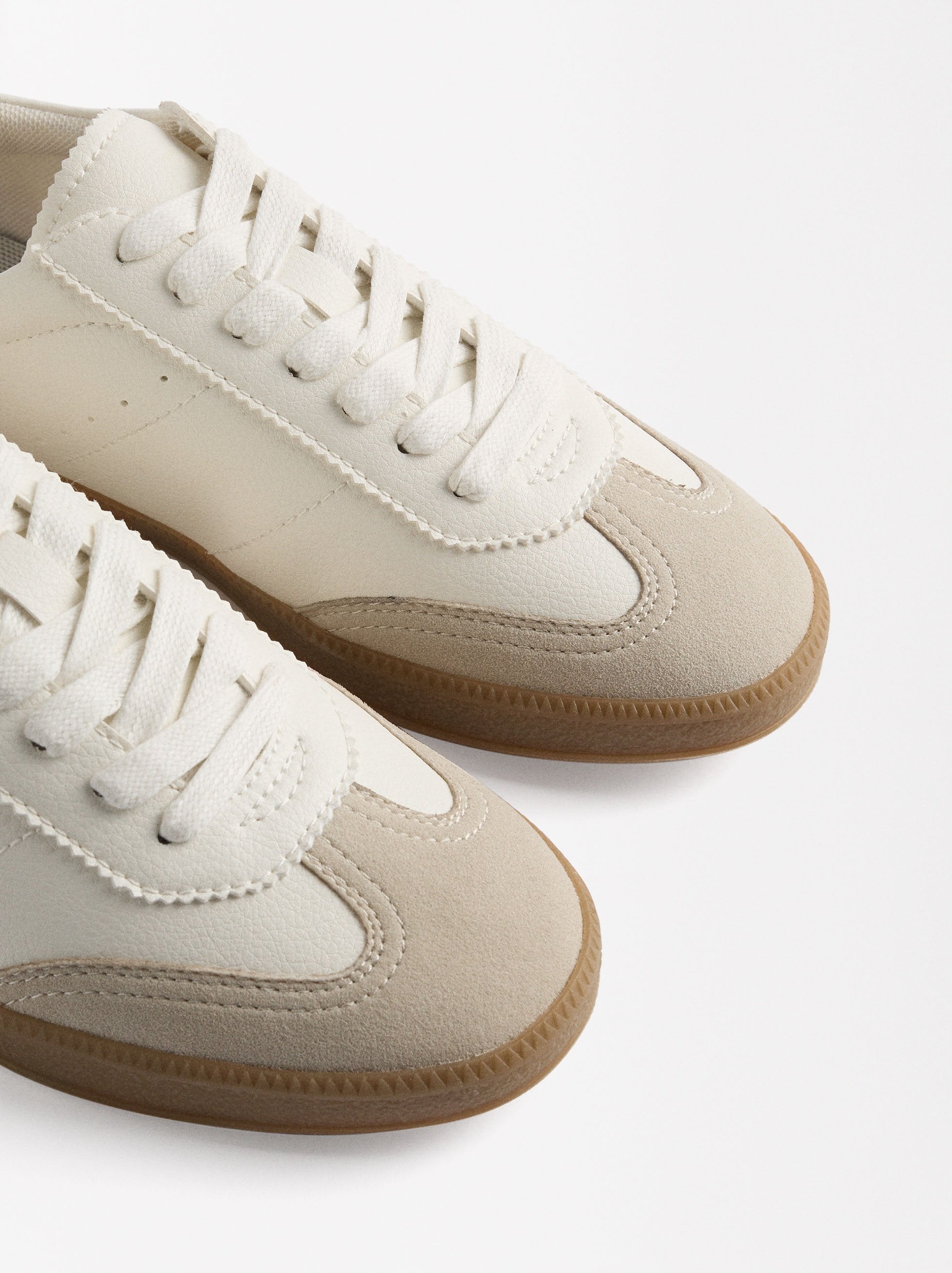 Zapatillas con contraste de texturas, combinadas con colores de la misma paleta de tonos neutros. Talón en color contrastante. Punta redonda. Suela de goma.
