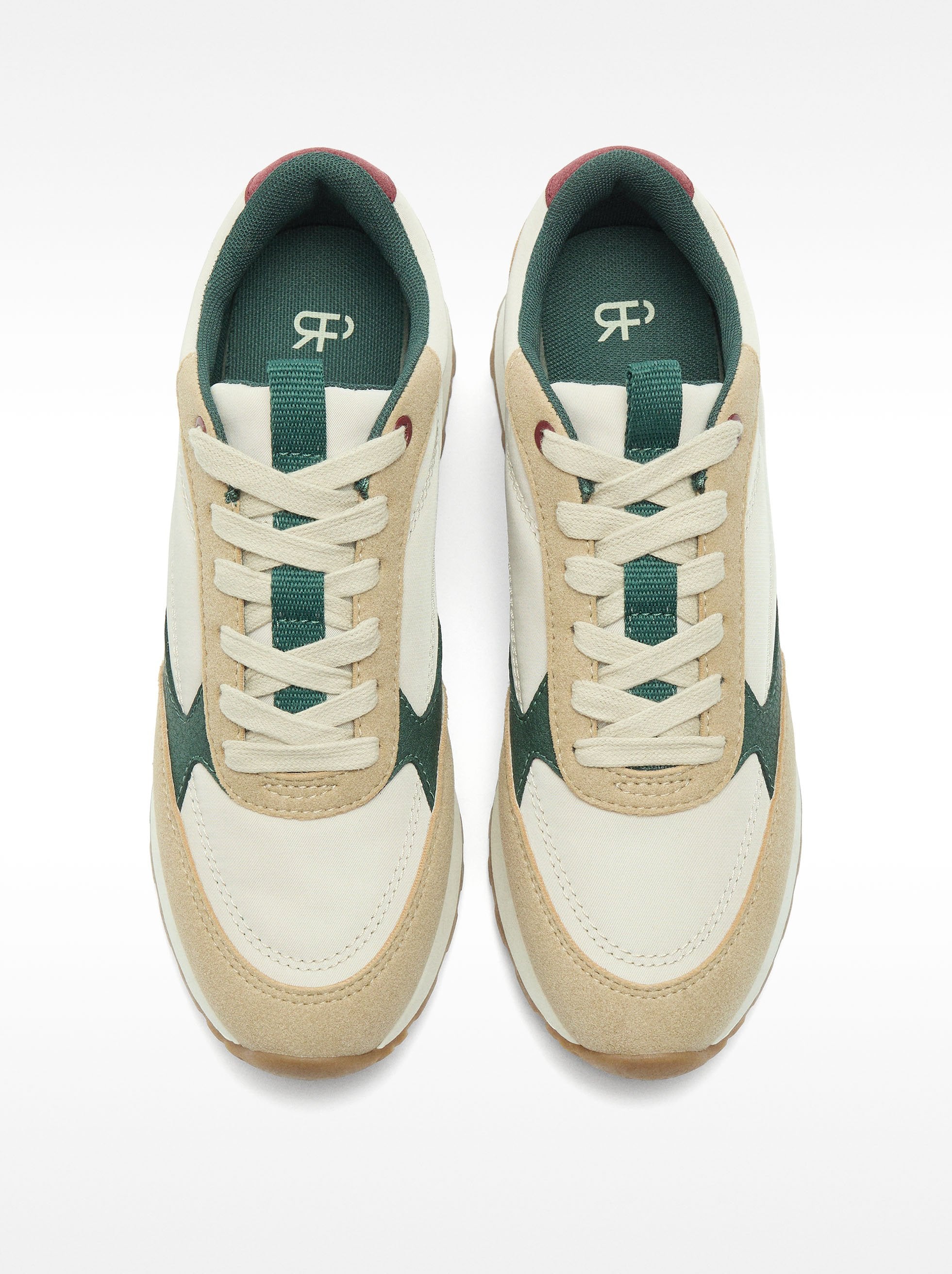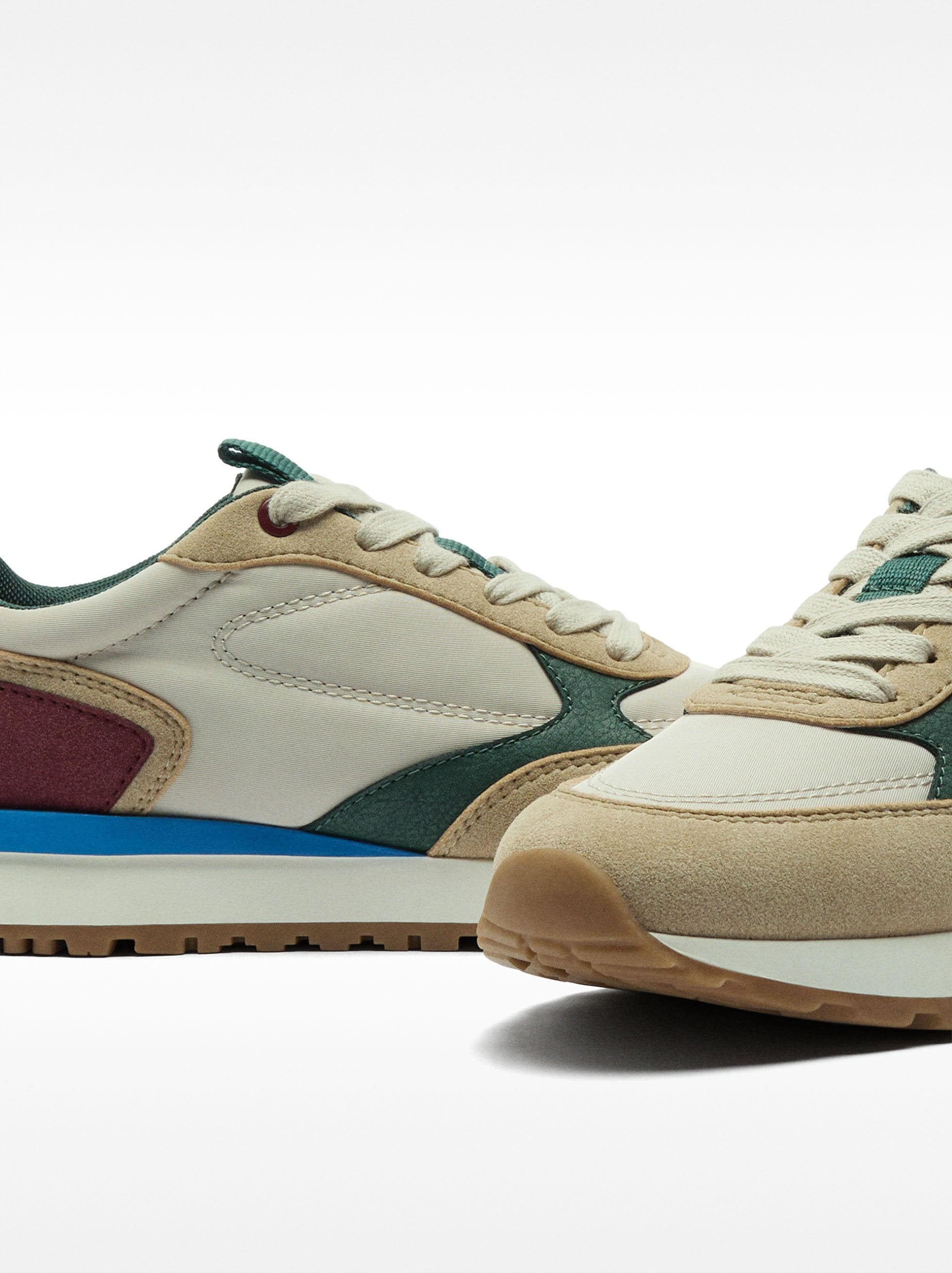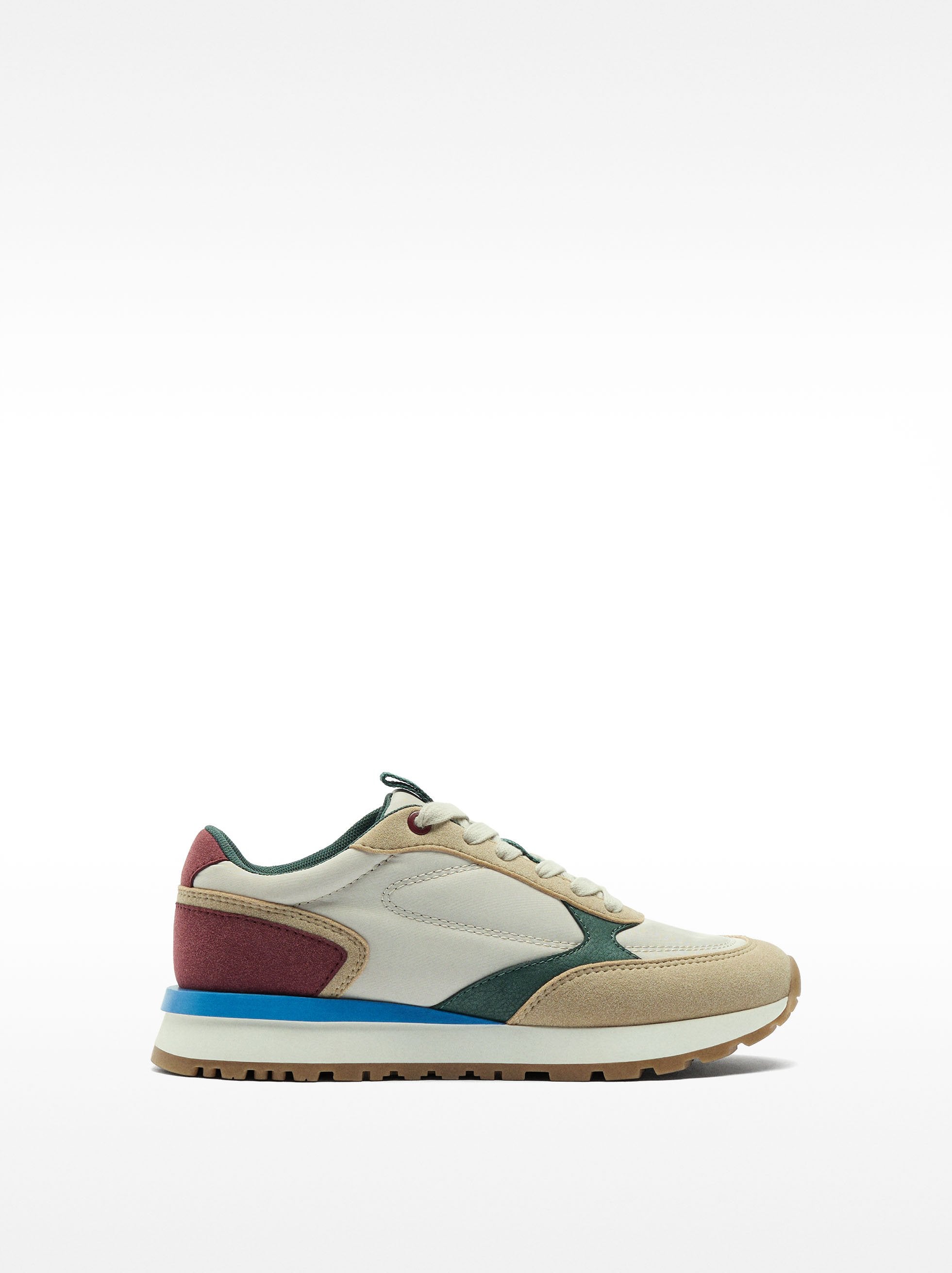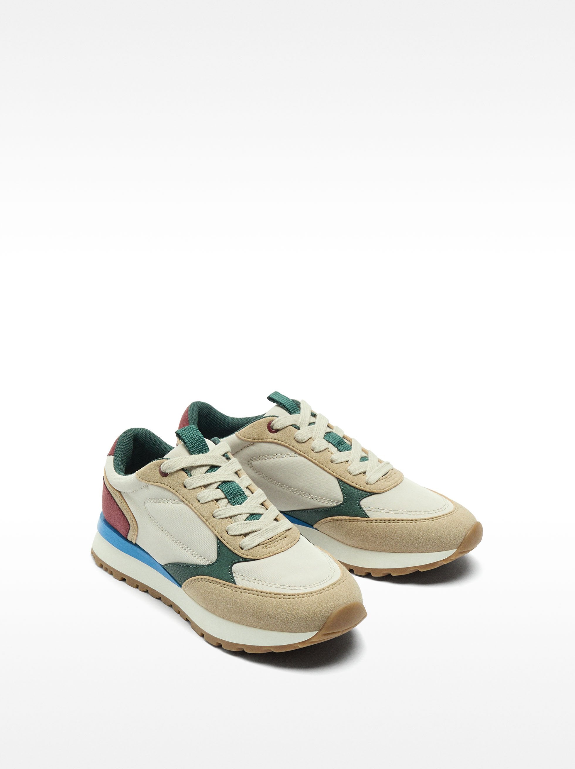 Zapatillas de varios colores y texturas contrastantes. Cordones en armonía con el diseño del calzado. Punta redonda. Suela de goma.