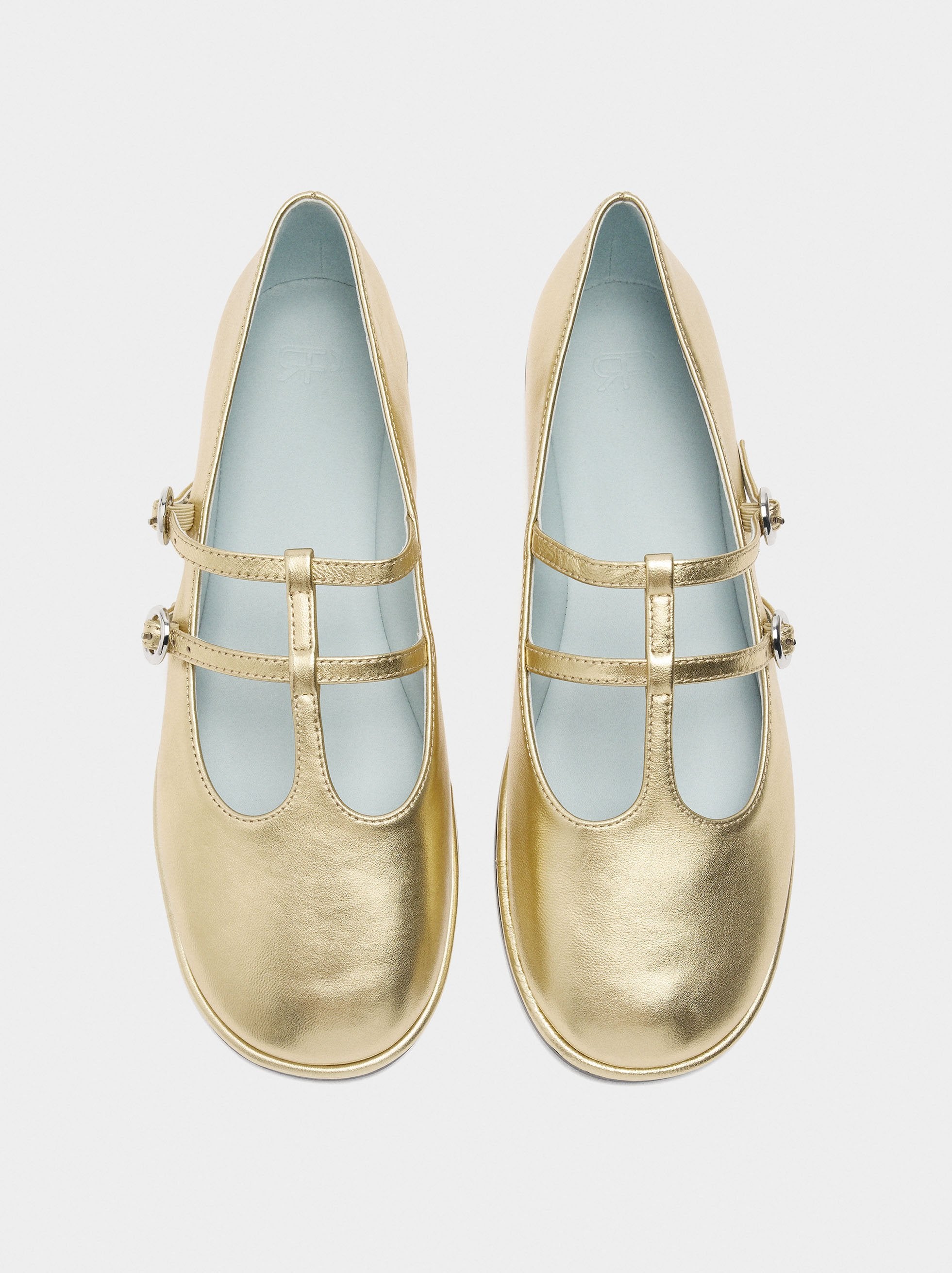 Zapatos planos de piel con T-bar doble. Tiras en el empeine con hebillas redondas para ajustar. Plantilla lisa. Punta redonda. Suela de poliuretano termoplástico. Combina el estilo clásico con un toque moderno.