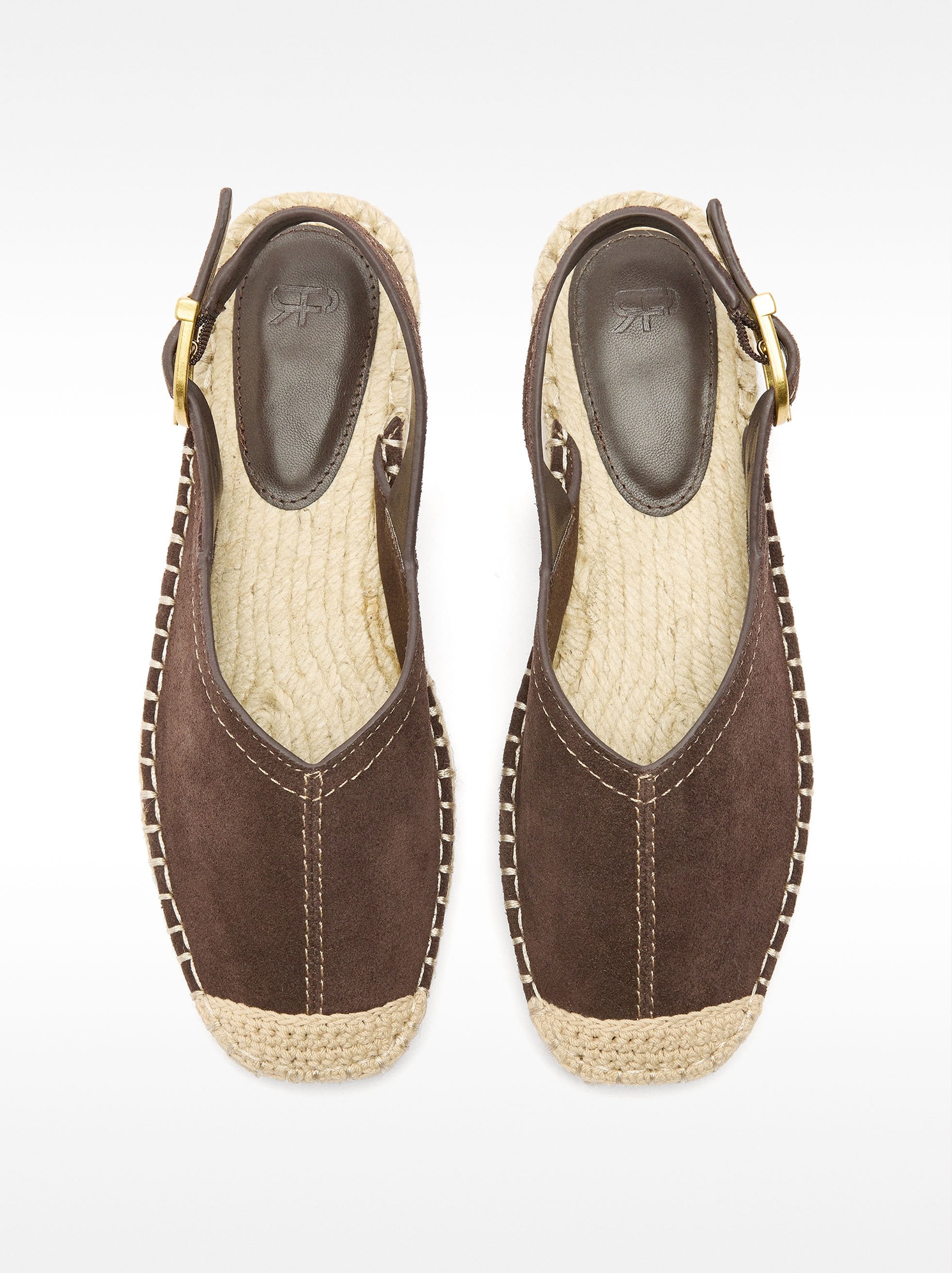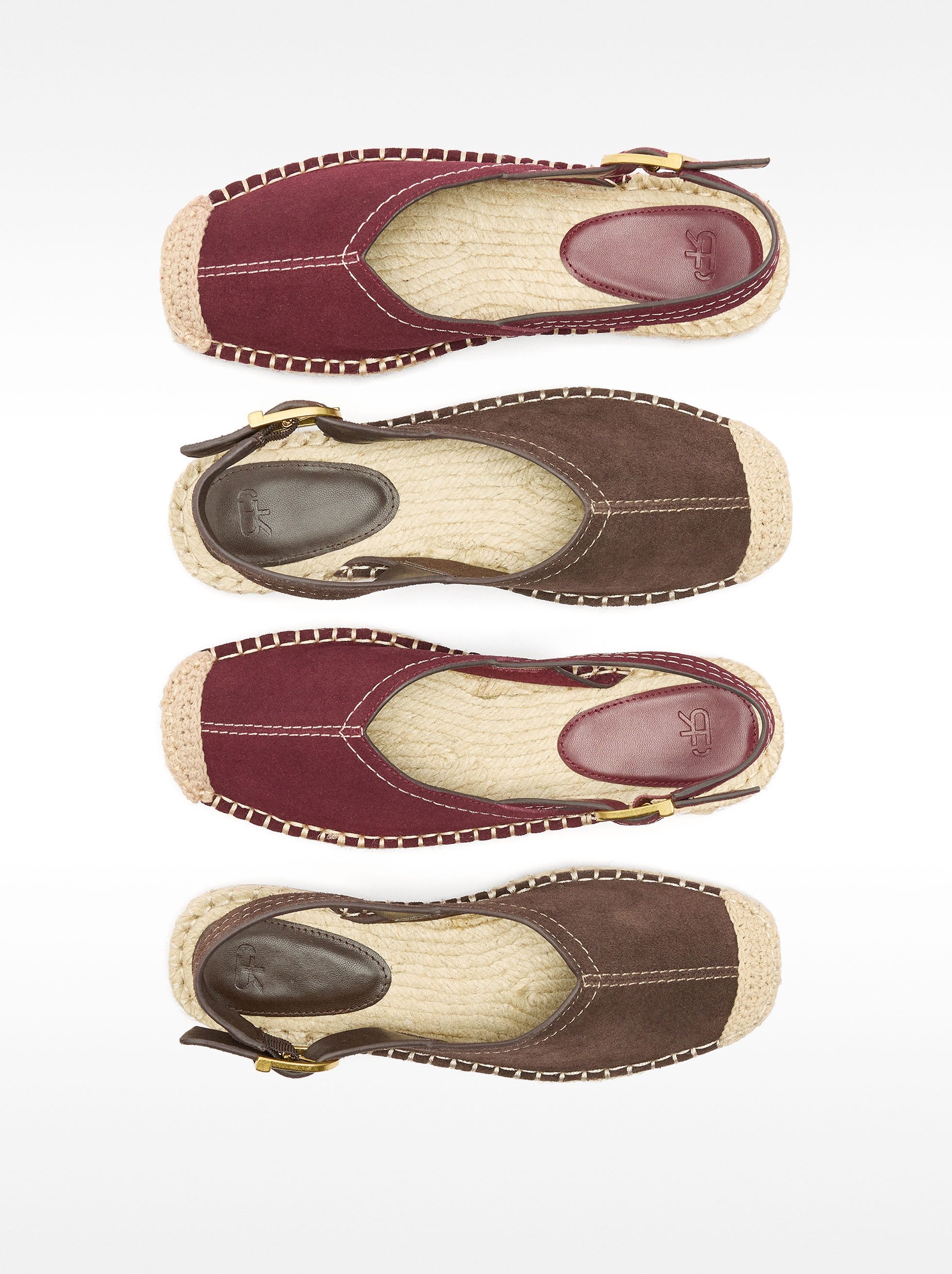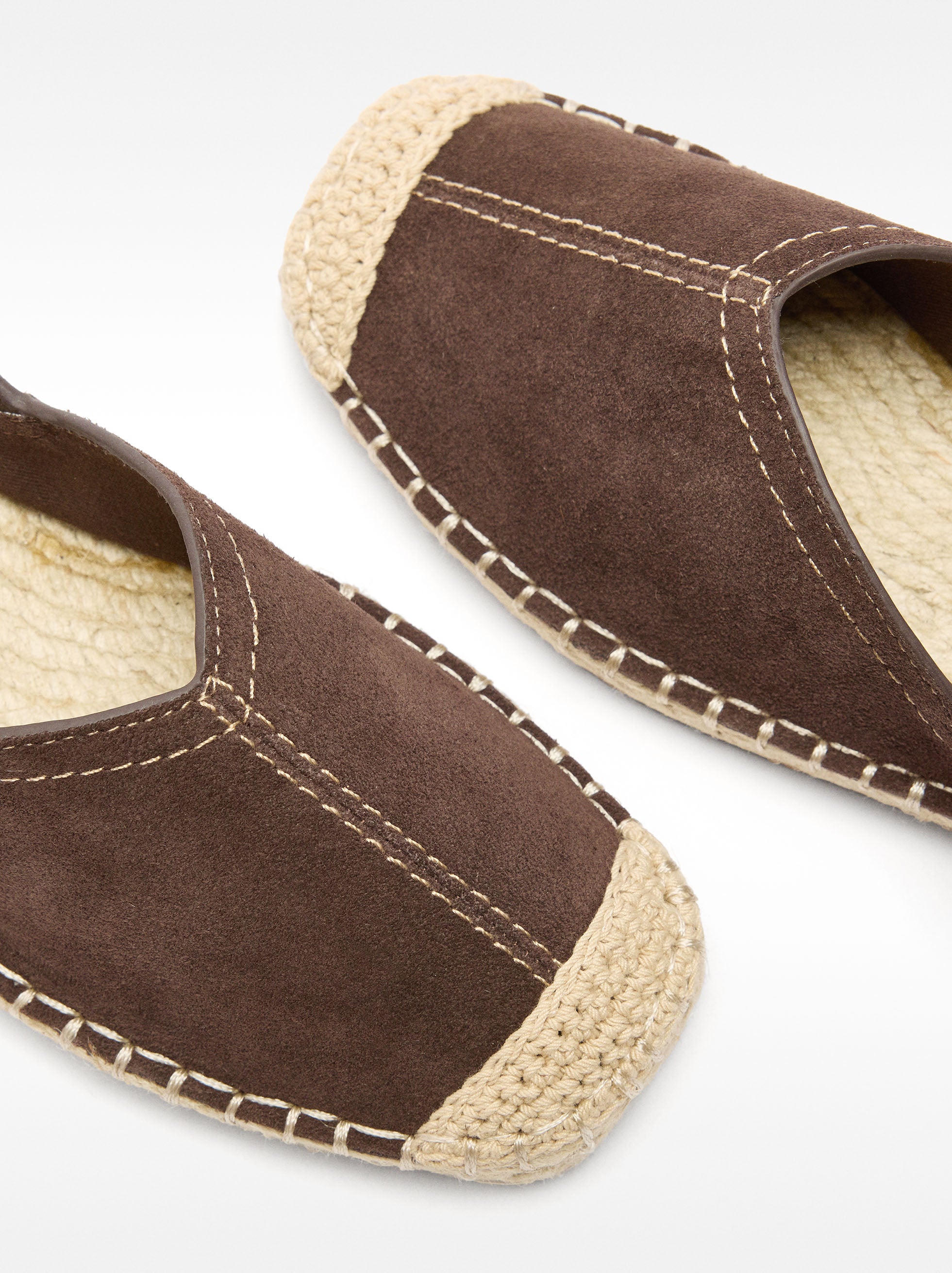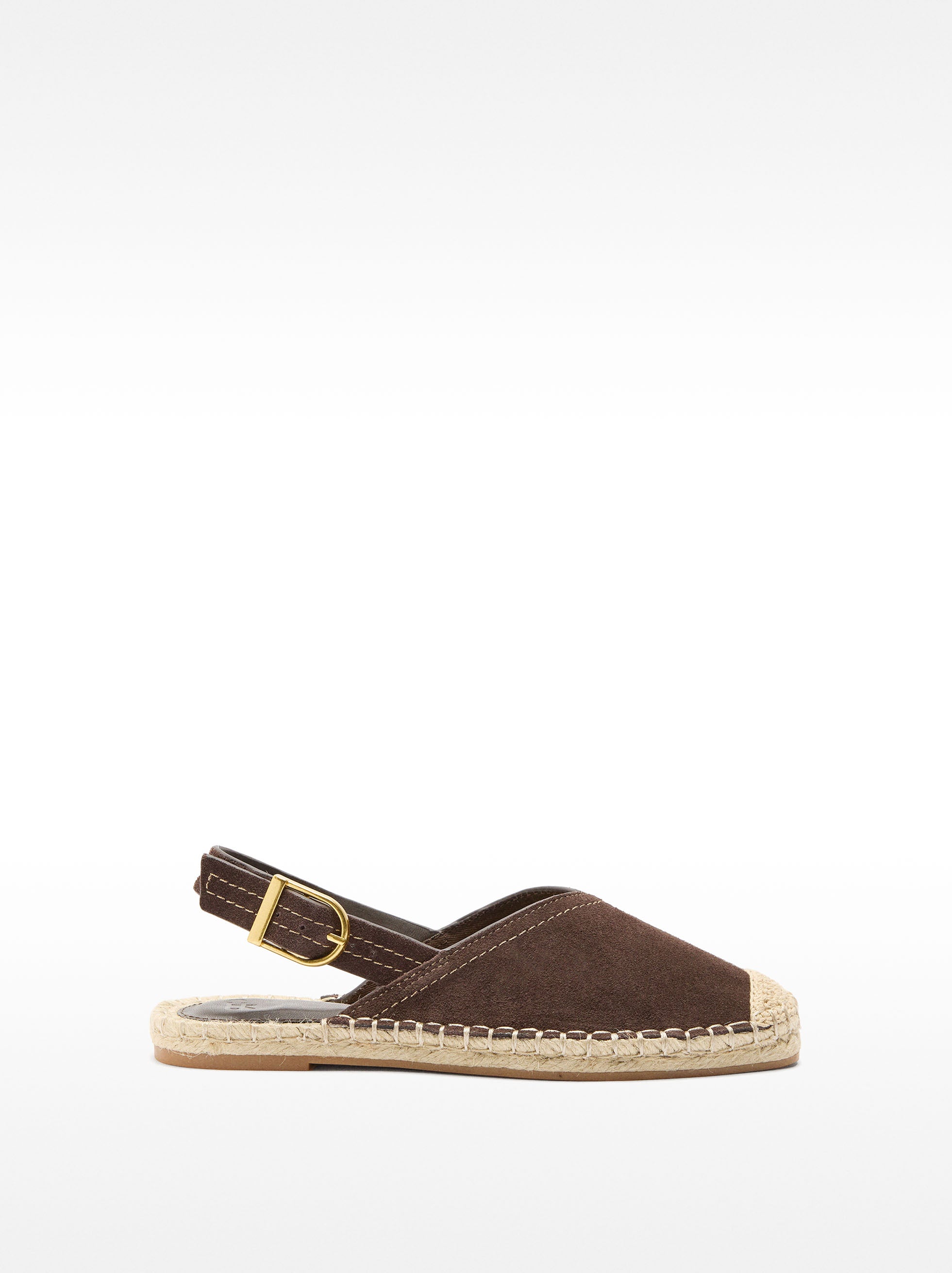 Alpargata de piel con pespuntes marcados. Tira trasera ajustable con hebilla. Plantilla de yute. Suela de goma. Punta cuadrada.