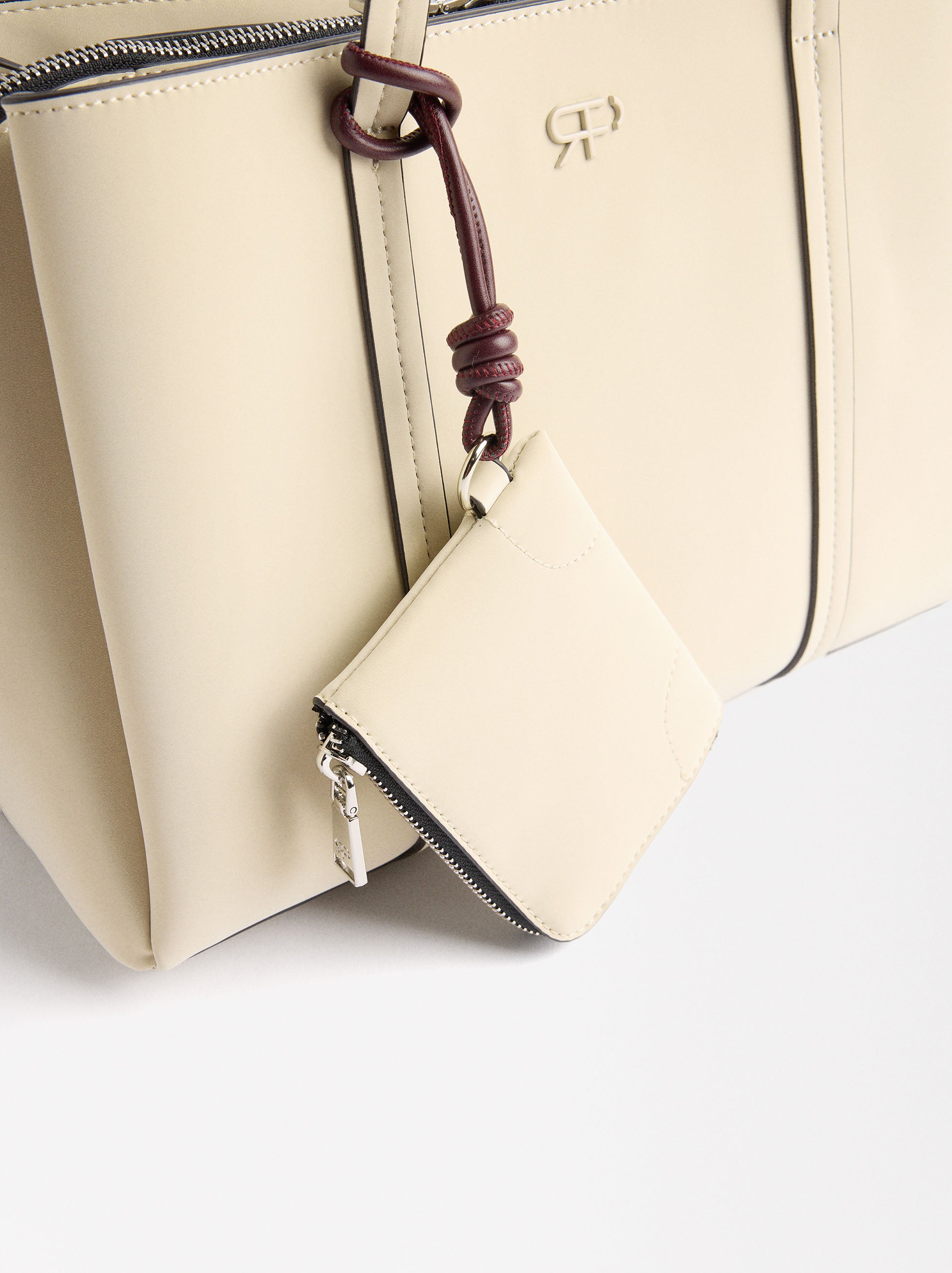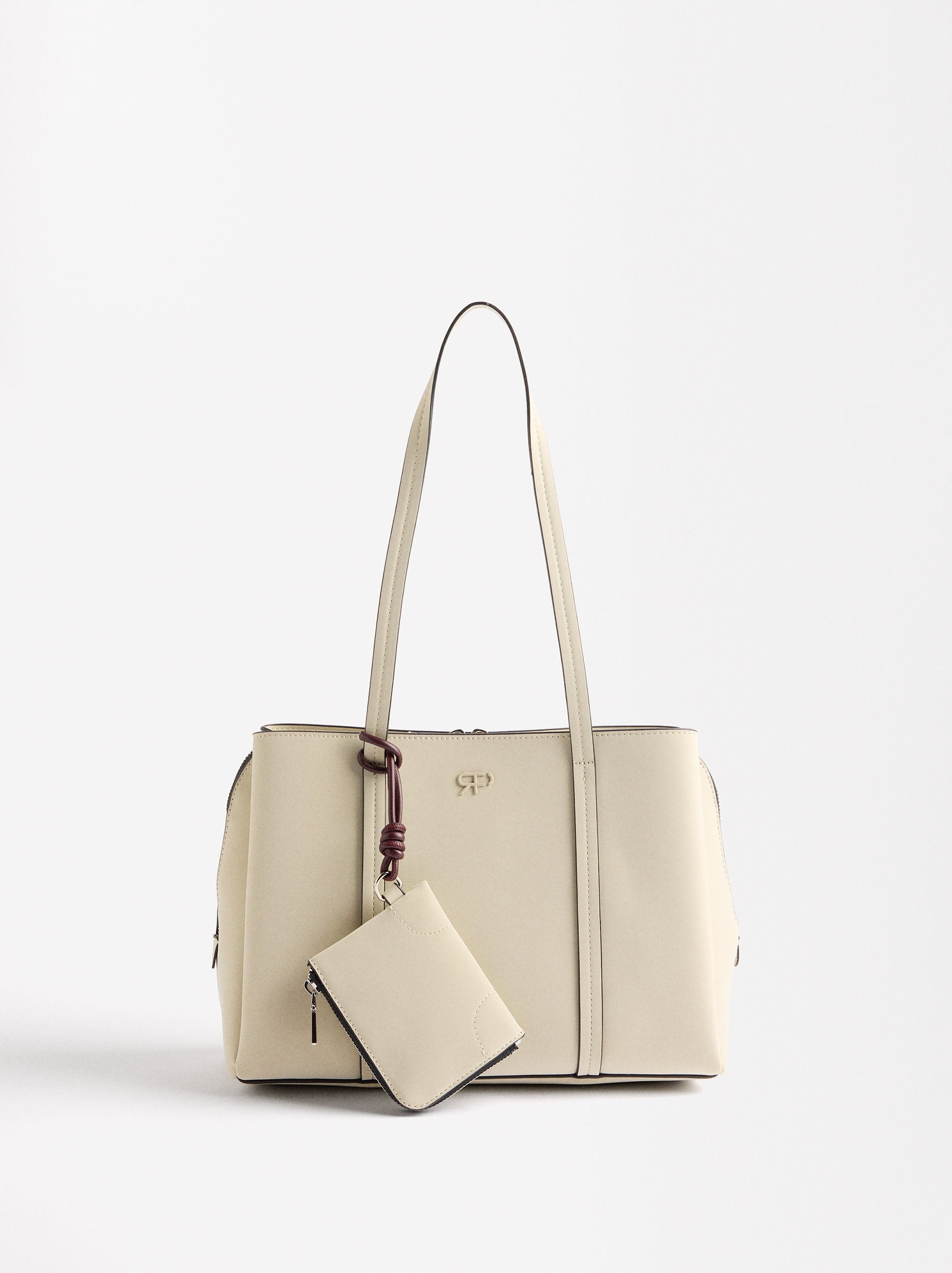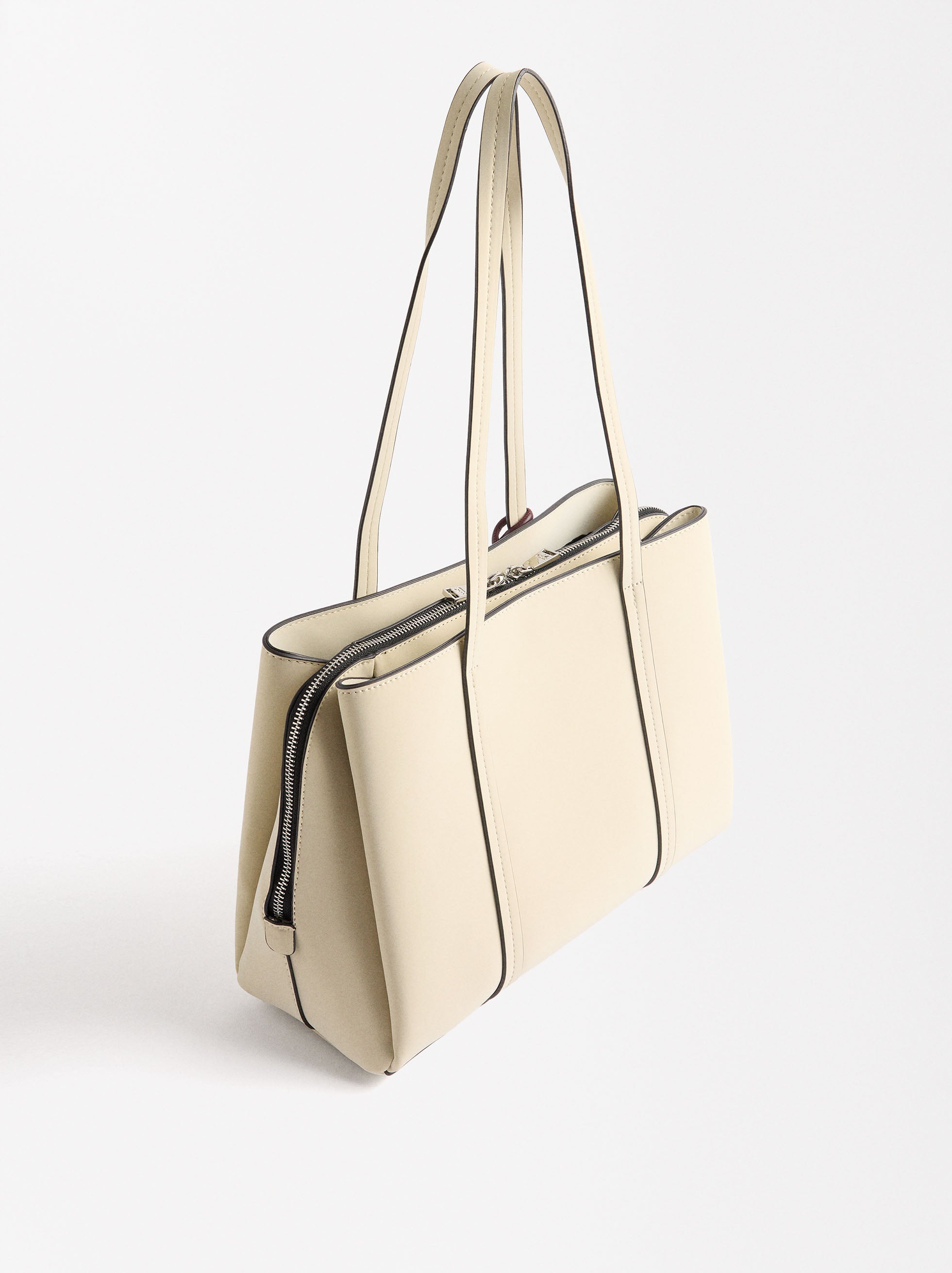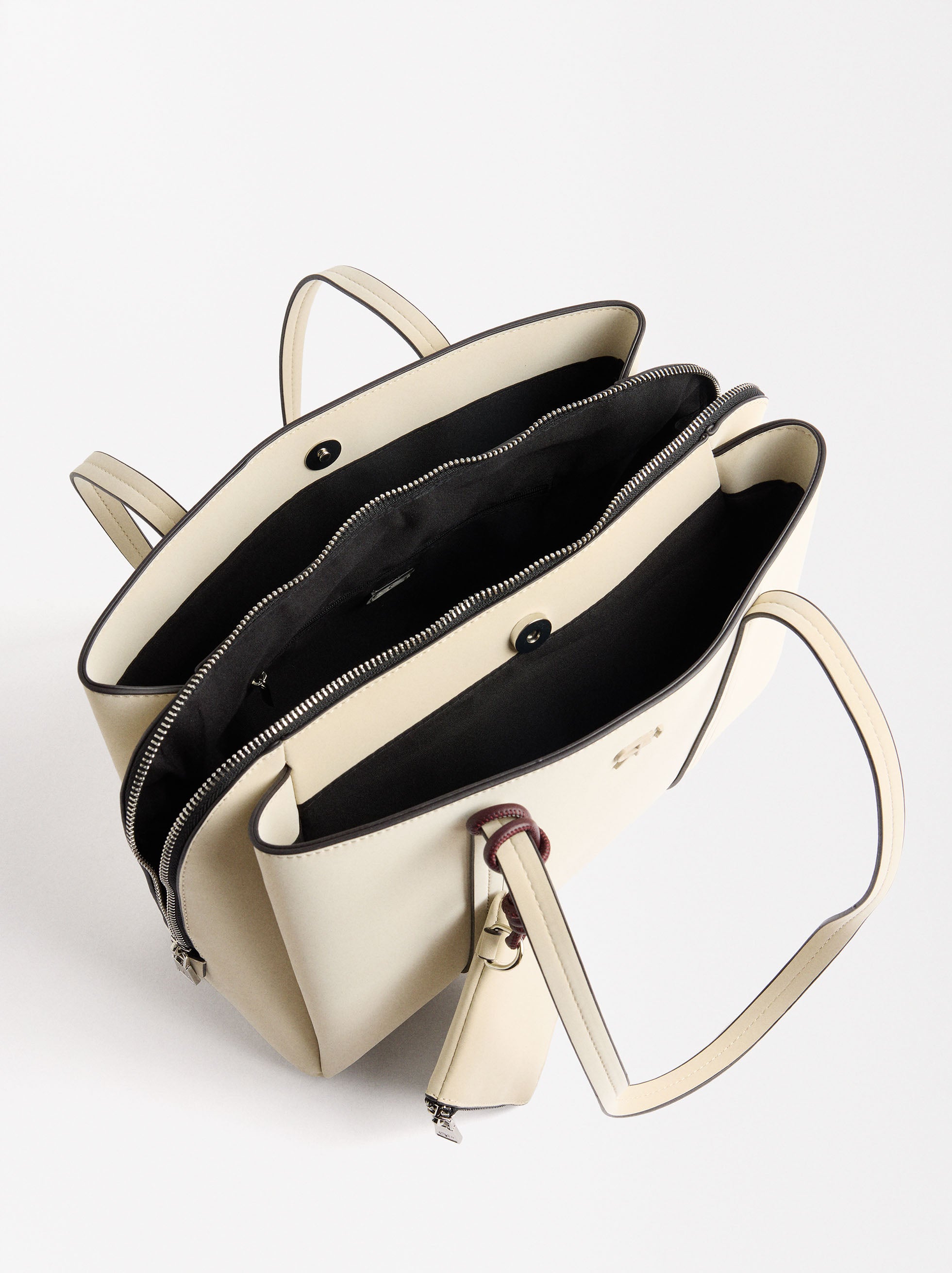Bolso shopper con efecto aterciopelado. Compartimento central con cierre de cremallera. Secciones laterales con cierre magnético. Forro y bolsillo interior. Asas de hombro fijas. Colgante extraíble.