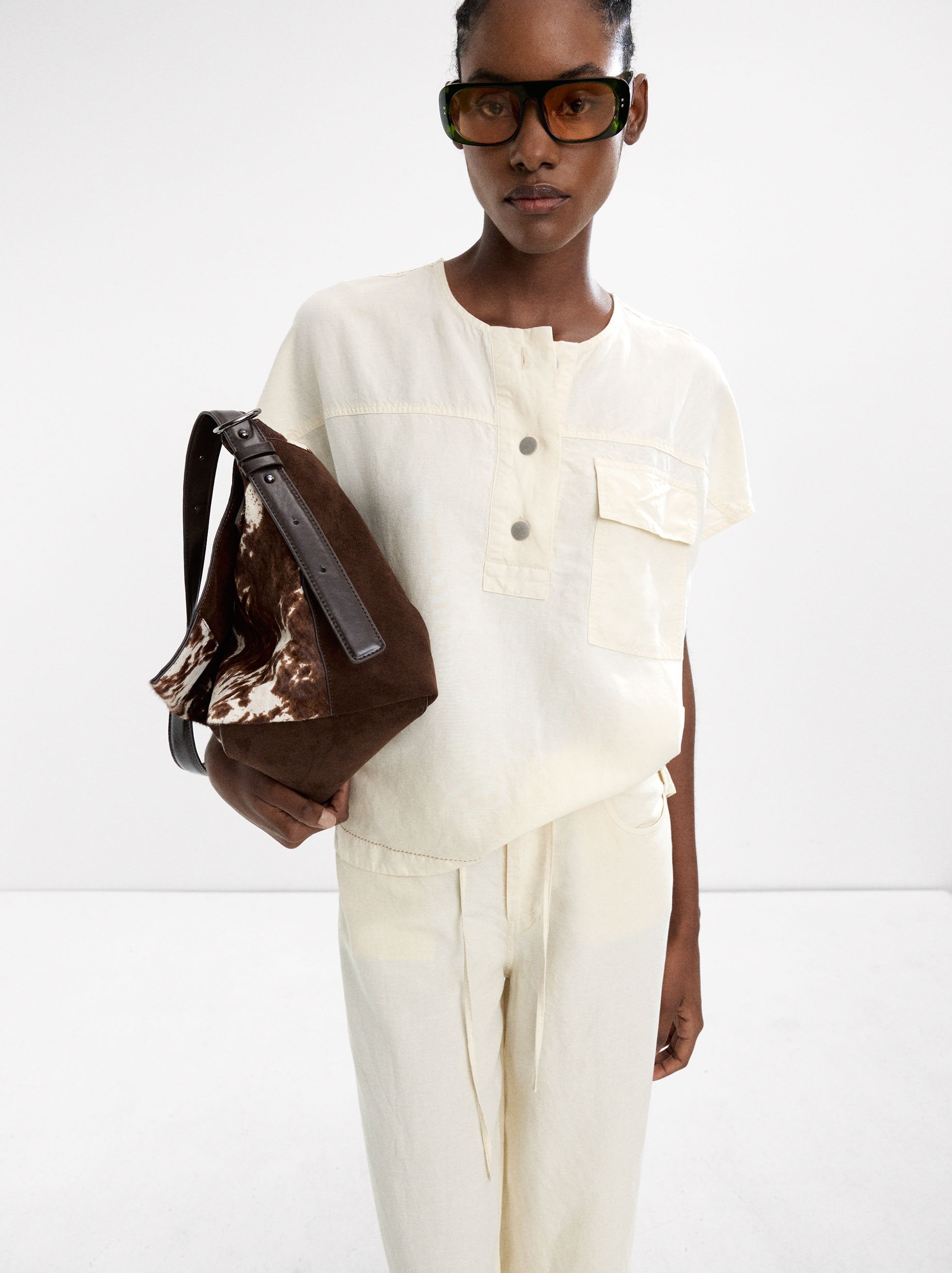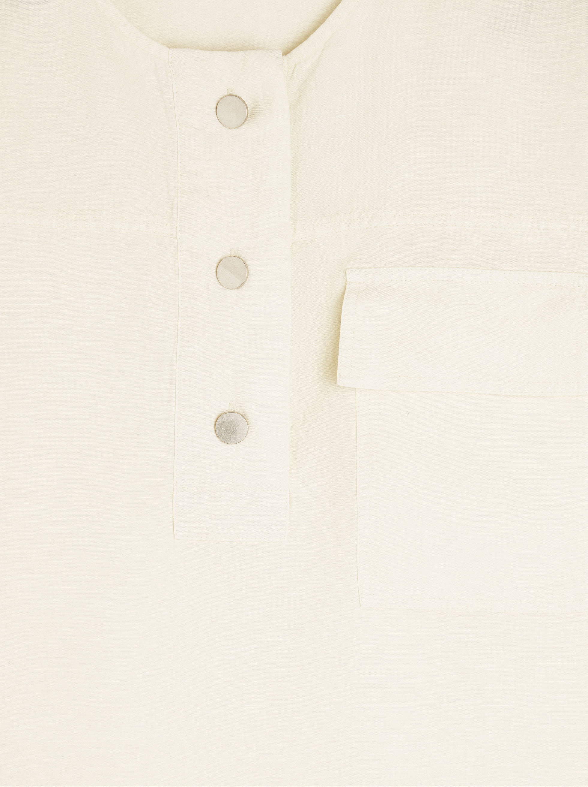Camiseta de mezcla de lino y lyocell con botones. Cuello redondo. Manga corta caída. Bolsillo en un lateral con solapa. Pespuntes marcados en el bajo. La modelo mide 1,80 m y lleva la talla S.