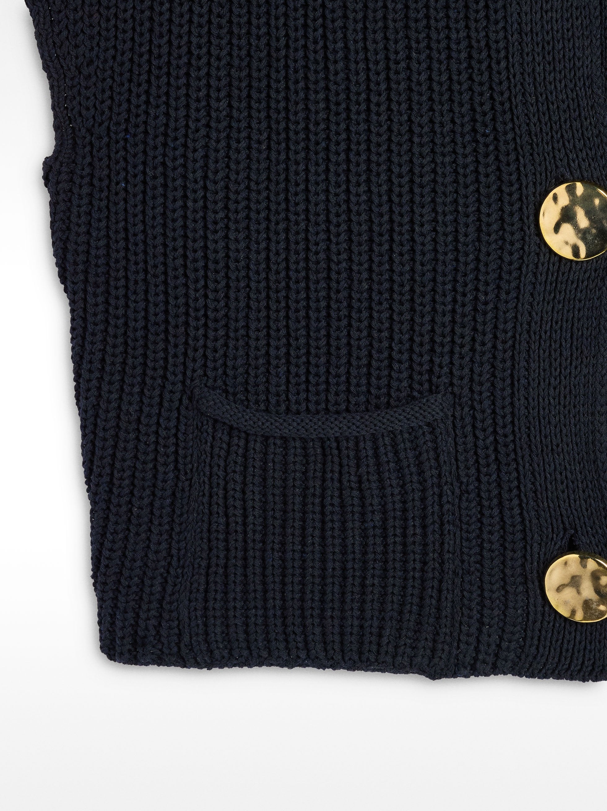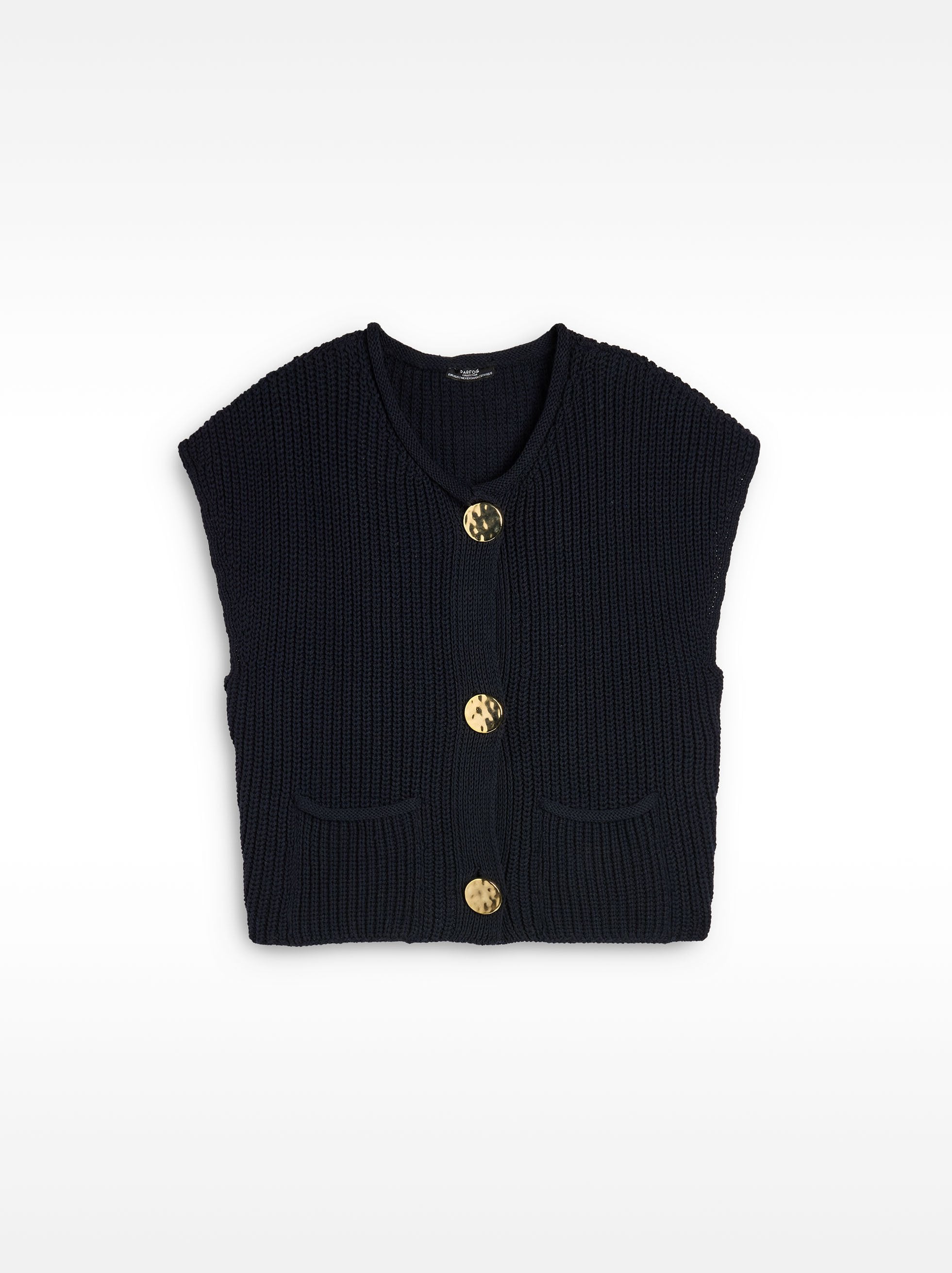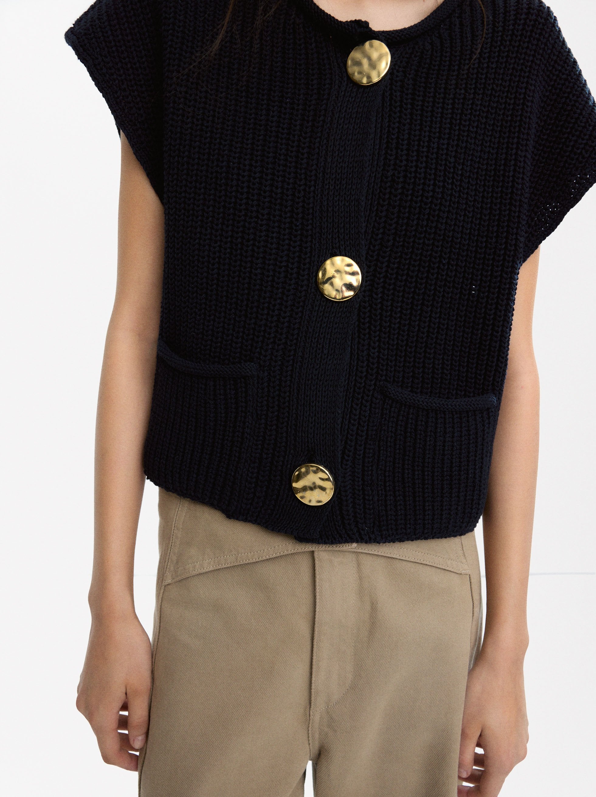 Chaleco de punto con bolsillos. Abertura con botones. Cuello redondo. Sin mangas.