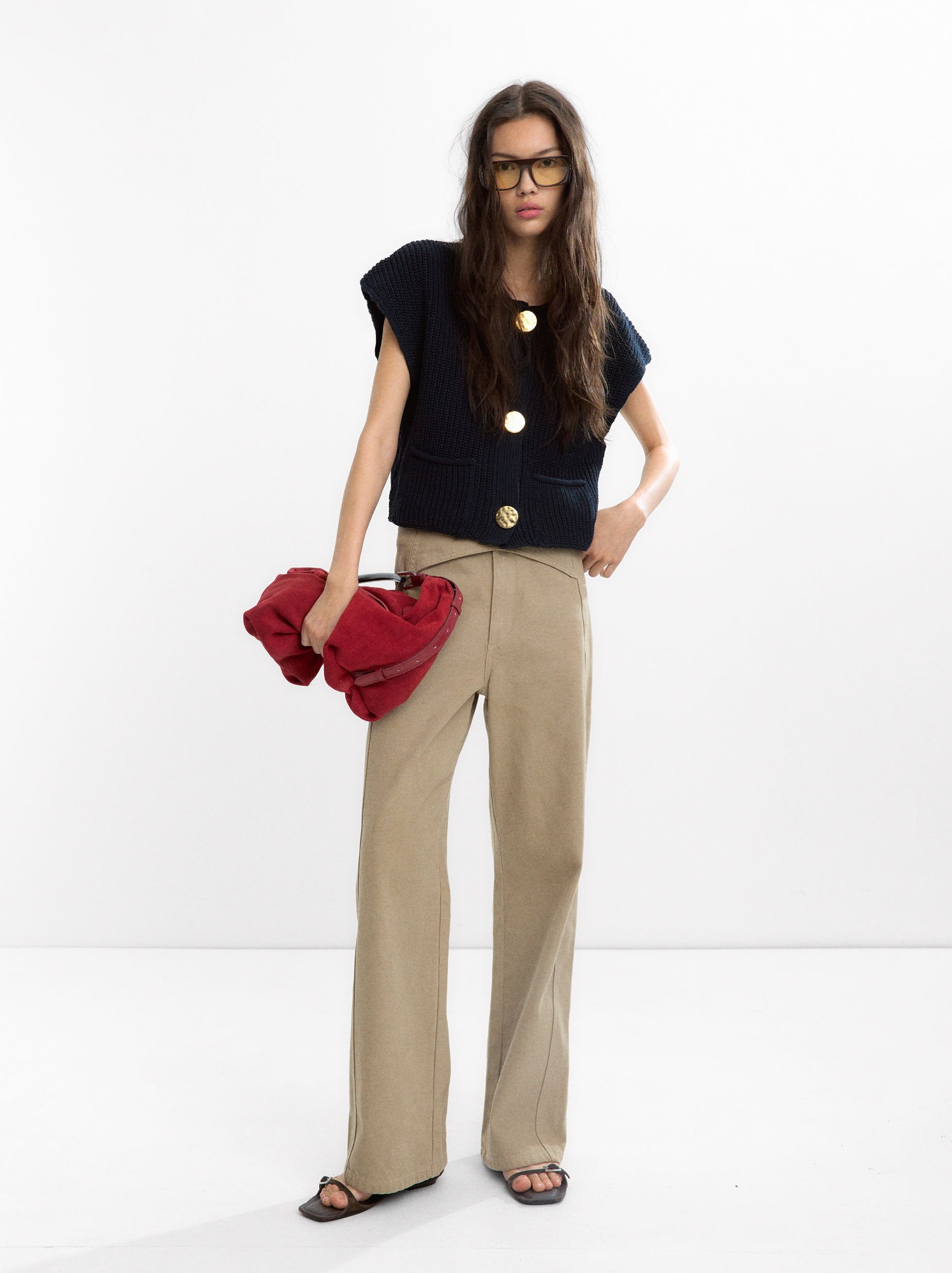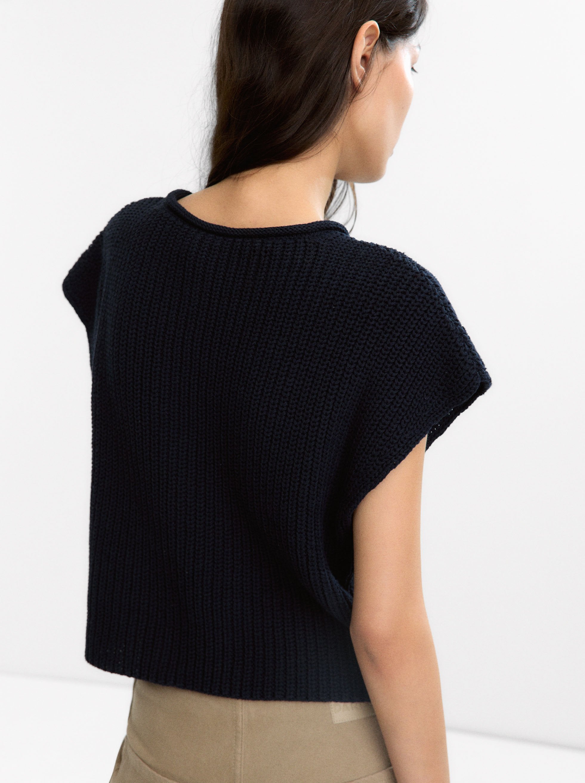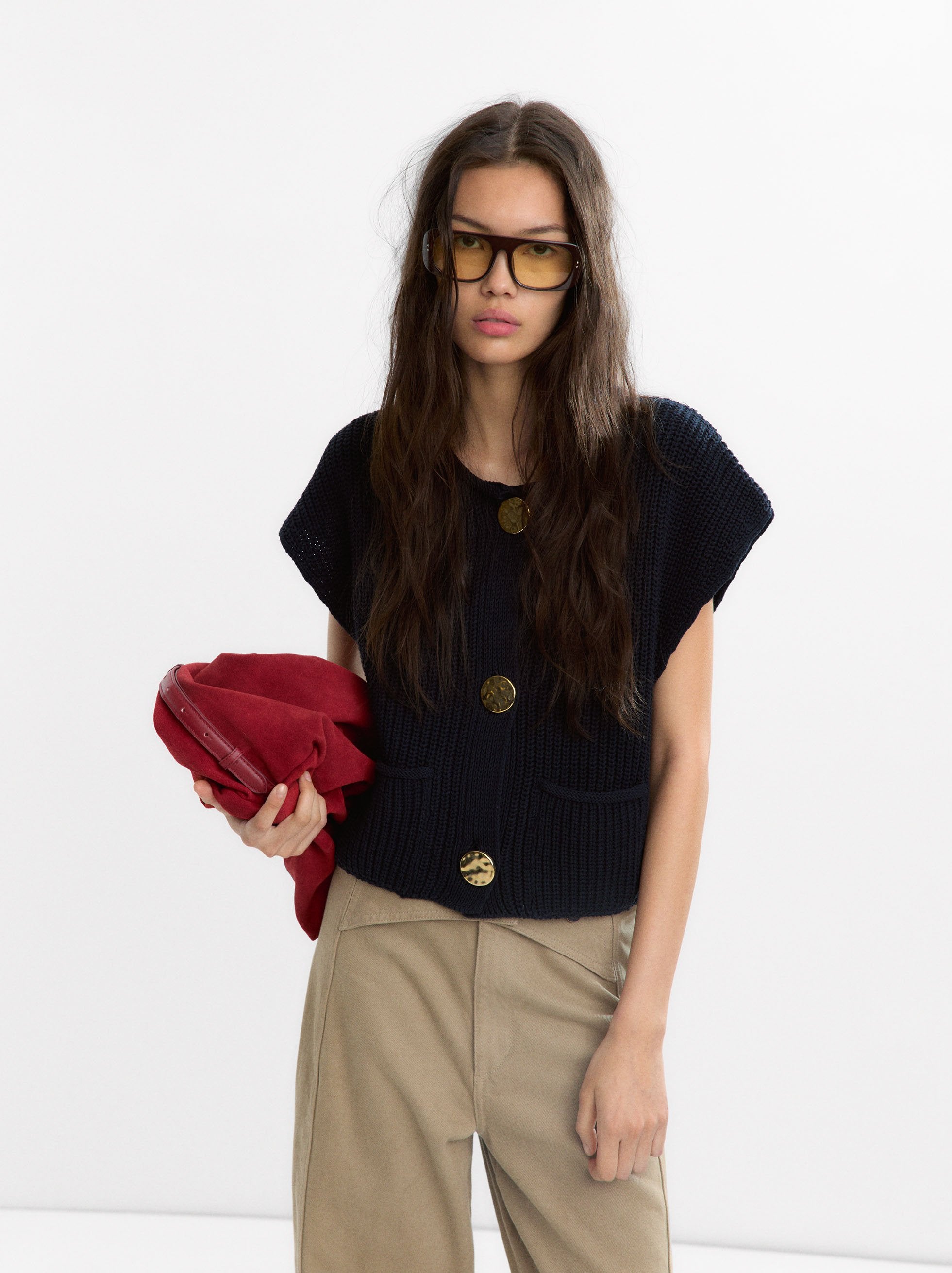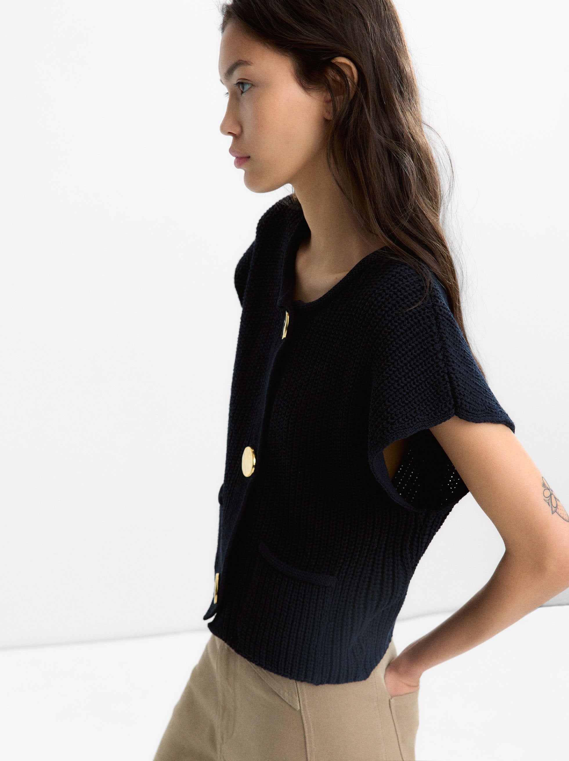Chaleco de punto con bolsillos. Abertura con botones. Cuello redondo. Sin mangas.