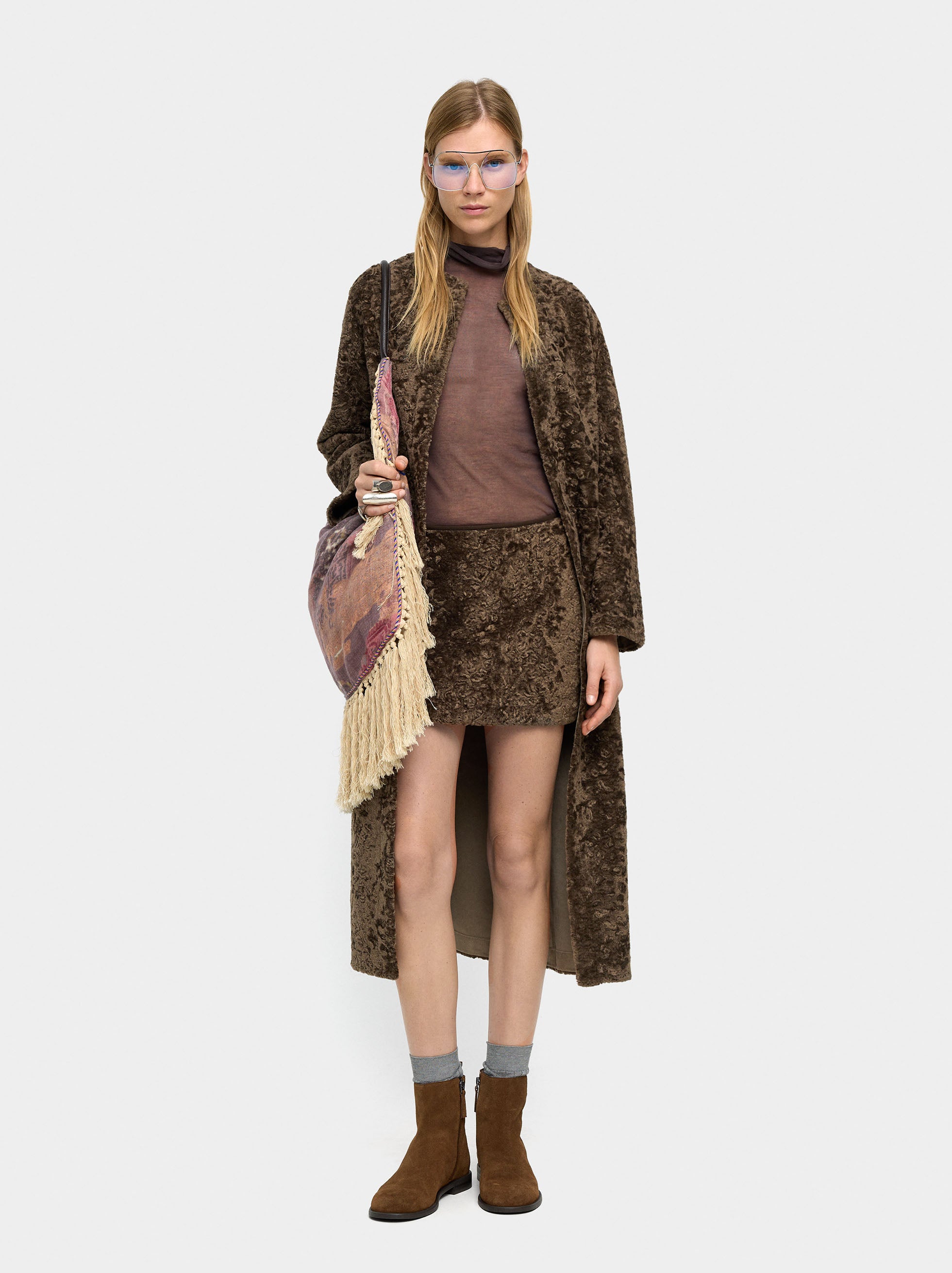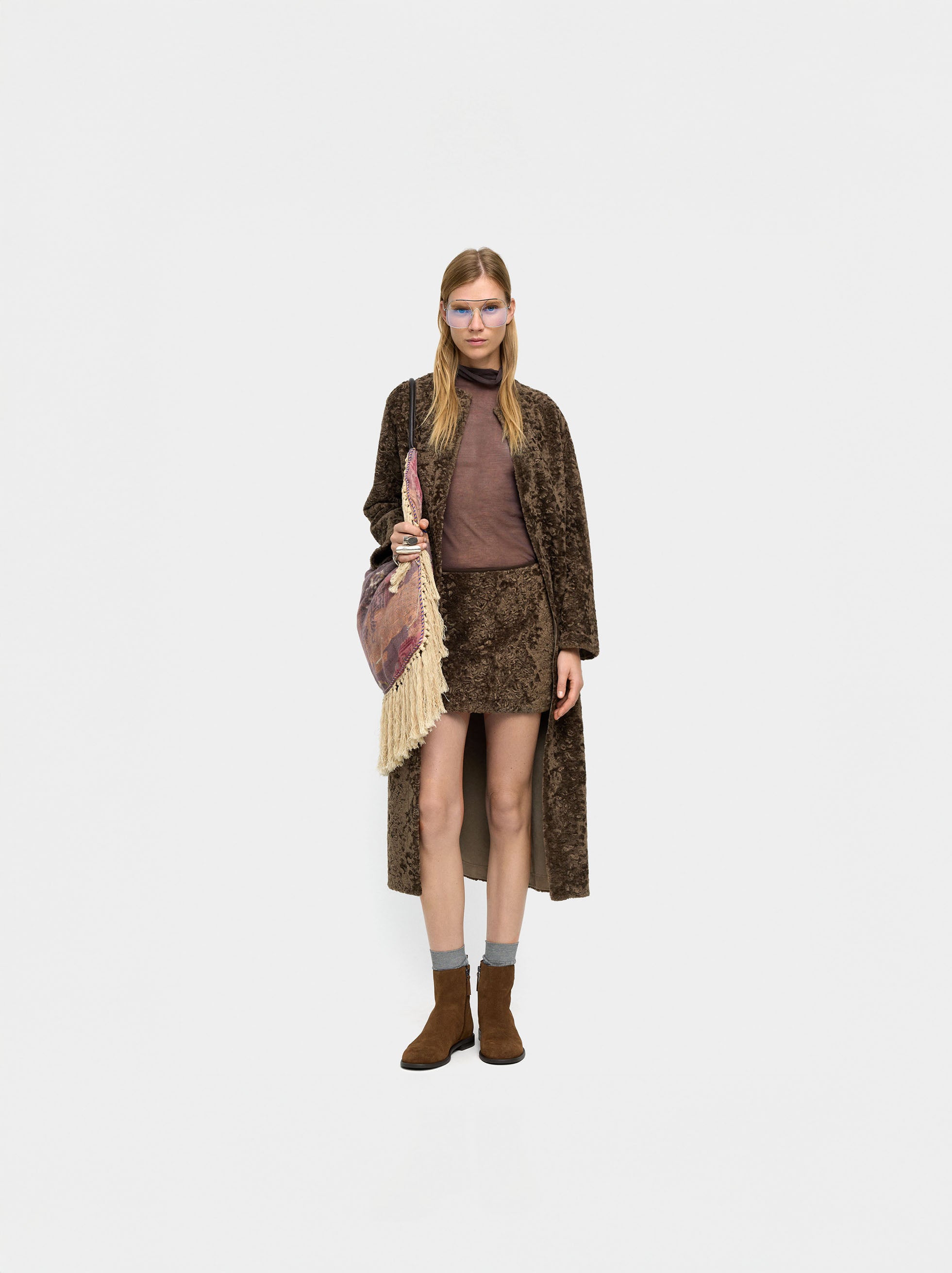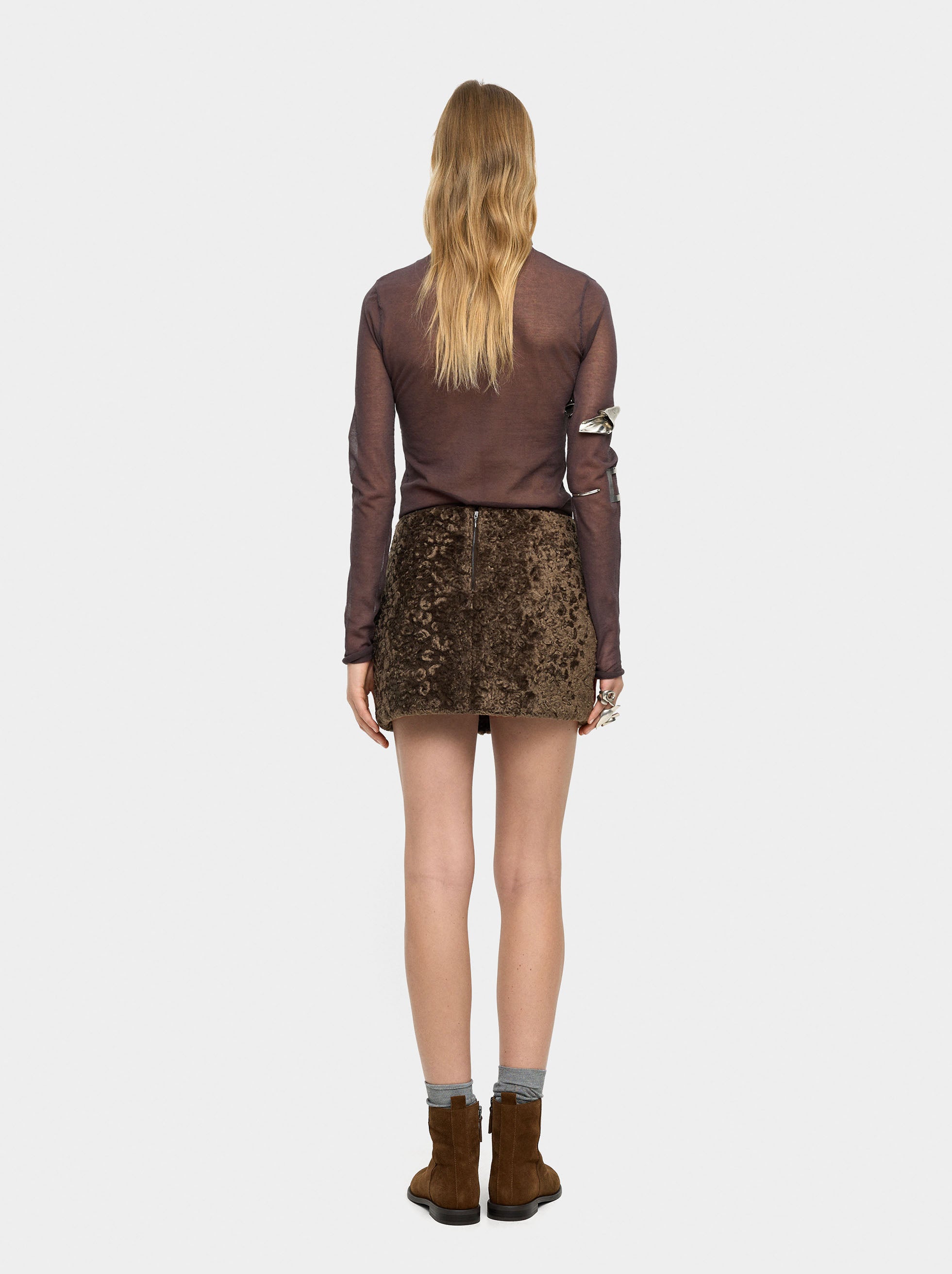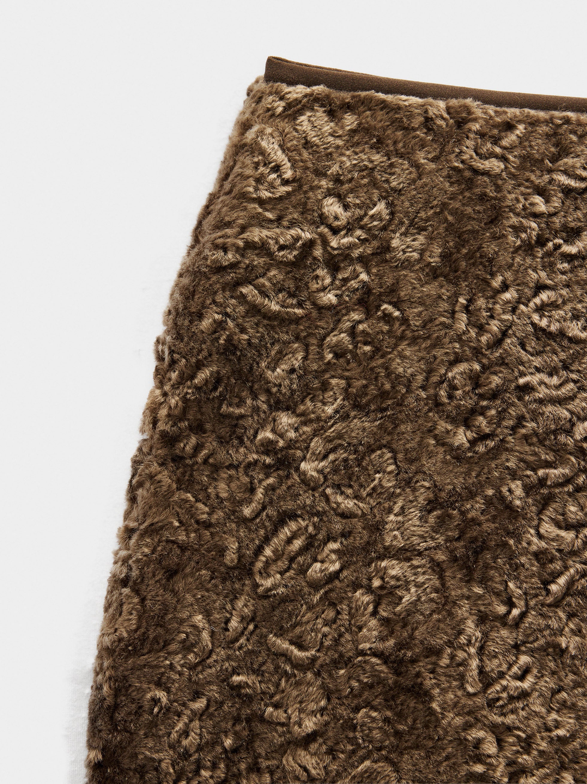 Falda corta aveludada con textura. Corte evasé leve. Cierre de cremallera en la parte posterior. Forro interior. La modelo mide 1,78 m y lleva la talla S.