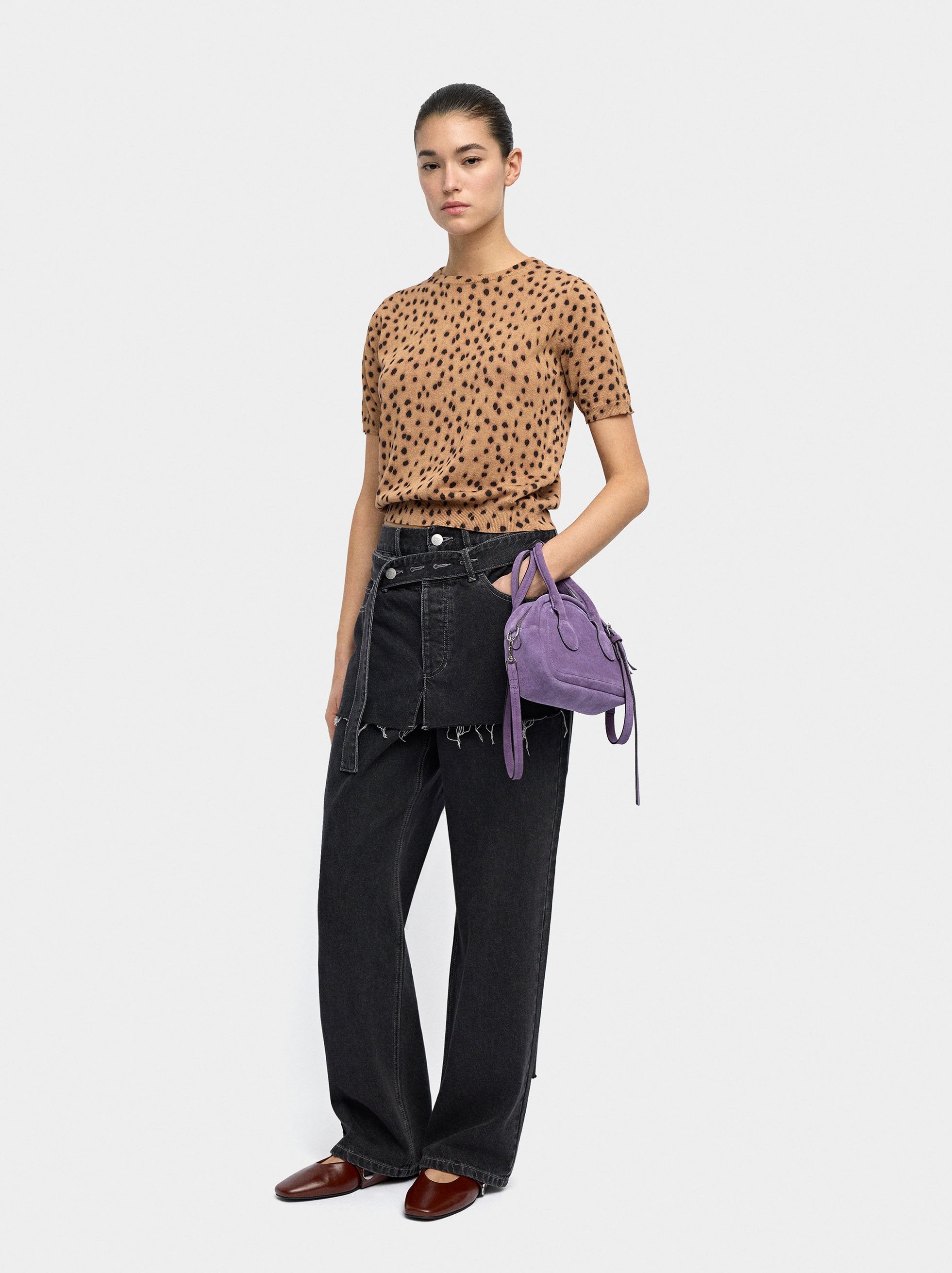 Jersey de malla con estampado animal. Cuello redondo. Manga corta. Bordes canalados. La modelo mide 1,75 m y lleva la talla XS-S.